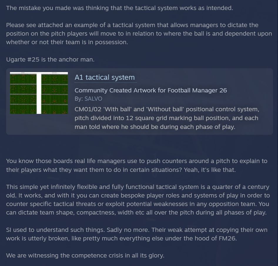 >>2309225Didn't you get the memo? FM26 is completely broken across the board. Anything that appears to function as intended has been faked in order to give that appearance. The match engine is the worst it's ever been, but because the graphics are a tad shinier there is a chorus of retards proclaiming that it's great.But the problems run even deeper. The AI is abysmal, training broken, tactics look the part but don't work at all. For example if you want a player to use a specific role out of possession, he needs to be fully trained in that role 'in possession, and yet even then players don't follow tactical instructions and just do whatever the RNG fakery tells them to. Don't even get me started on the data that they buried because it shines a light on how unrealistic everything is.EVERYTHING IS SHIT. It just kinda looks a tiny bit prettier in parts. Eye candy for the retards who never look beneath the surface.