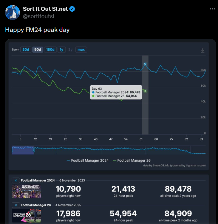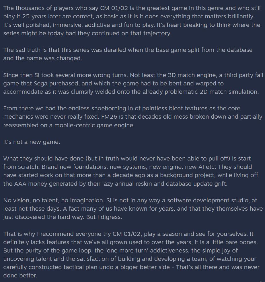 >>2319717Literally never, because they're caught in the trap of selling new shiny visible thing for streamers and content creators and console morons to get excited about (because sales and eyeballs are literally the only thing that matters) and they don't have the financial bandwidth to switch their focus to fix underlying issues their hardcore audience would appreciate. Even if the hard-core audience suddenly stopped buying every/every other year, all that would do would make them double down on chasing new shiny visible features until Sega kills them because they're not selling enough to break even anymore. FM26 was a gambit where they traded long term fan support for short term market gain, except they fucked the product up massively. We'll have to see how FM27s sales look in comparison to 23/24/26 to see what kind of impact their recent decisions have had, but I'm not optimistic and genuinely think SI is closer to death than they are to fixing the underlying simulation aspects.