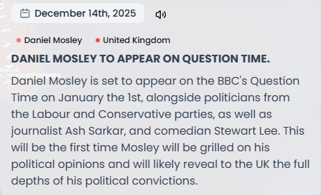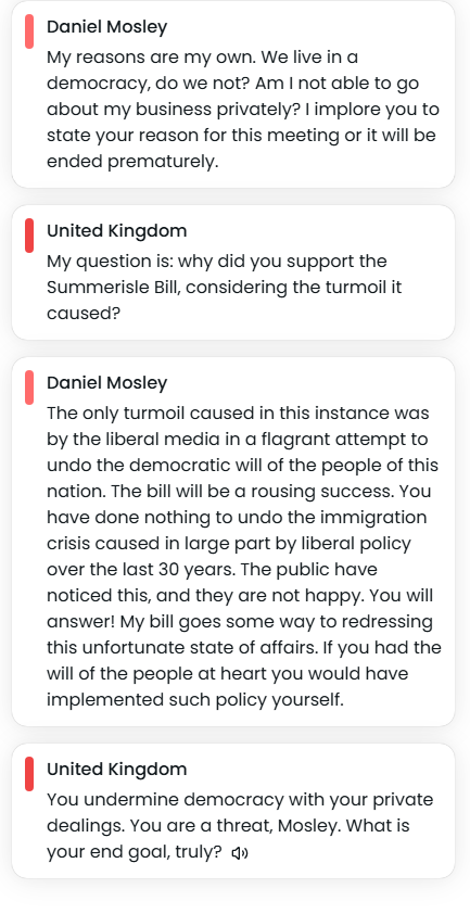 I'm playing as the Great-Grandon of Oswald Mosley. I'm attempting to continue the work of Oswald and seize power in the UK for the British Union of Fascists.I've been making inroads recently and managed to get a strident anti-immigration bill passed in the Lords. I've just been invited to Question Time after my recent successes. I'll do my best not to get arrested for wrongthink.