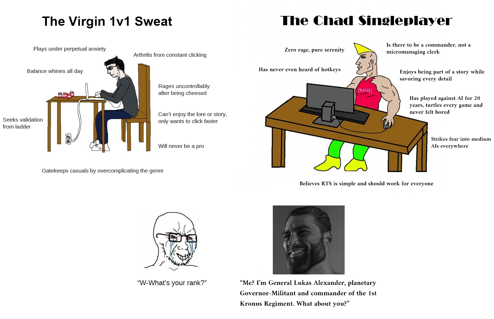 Now that the dust has settled, how would you rank the Warhammer factions based on Dawn of War alone?For me, it's1) Imperial GuardCarried by Dark Crusade and Soulstorm, glad I haven't played Winter Assault first, WA had the worst IG who only existed to be humiliated by Eldar, and some old ass boomer with no rizz and no commanding aura2) Necrons (Dark Crusade)The only good Necrons in all of Warhammer, according to what I was told ITT, this is how they should be, emotionless machines that don't talk3) OrksConsistently good in all games, only held down by the fact that they never explain why Orks keep following Gorgutz even though he's a beytuh who lost twice in canon already4) CSM (Dark Crusade)Only charismatic iteration of Space Marines, makes them worth playing even though they suck gameplay wise.5) TauGood soundtrack and the units sound cool (the sound effects, not the Tau voice acting) and they're basically a less emasculating version of Eldar.6) Space MarinesAverage, but they had a bit of charisma in Dark Crusade.7) EldarOverpowered gameplay wise but playing as gay space elves don't feel right.8) Sisters of the BottleEven if they dressed like sexy nuns, they would be hard capped in the shit tier just because of the unbearable voice acting from the male units.>"From the lightning, and the tempest, Emperor deliver us!"Hate the line delivery so much.9) CSM (non-Dark Crusade), Necrons (Soulstorm)Saturday morning cartoon villain tier.10) Dark EldarOverpowered by Soulstorm campaign standards, but they're gay space elves mixed with cringy S&M edgy teenager vibes. Almost all their units voice acting is terrible, like Beavis & Butthead trying to sound scary. Despite the description of their torturing and whatnot, they seem 0 threatening to me and completely redundant and nonsensical.>What if we... like epically did degenerate stuff, but not as degenerate like we did the first time, that makes us immune to our degenerate chaos god or something.