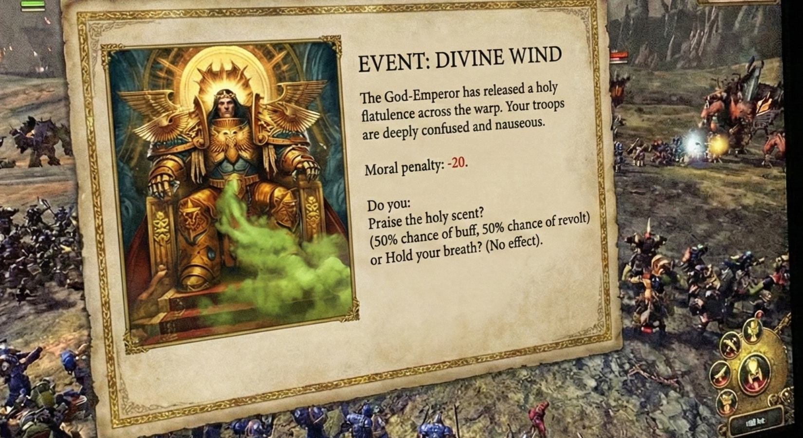 >>2294411this wouldnt be a problem if they made 40k total war gameplay be based on warno or red dragon