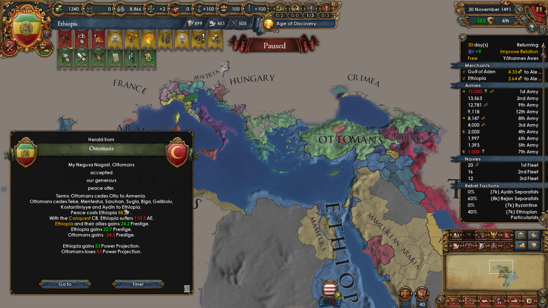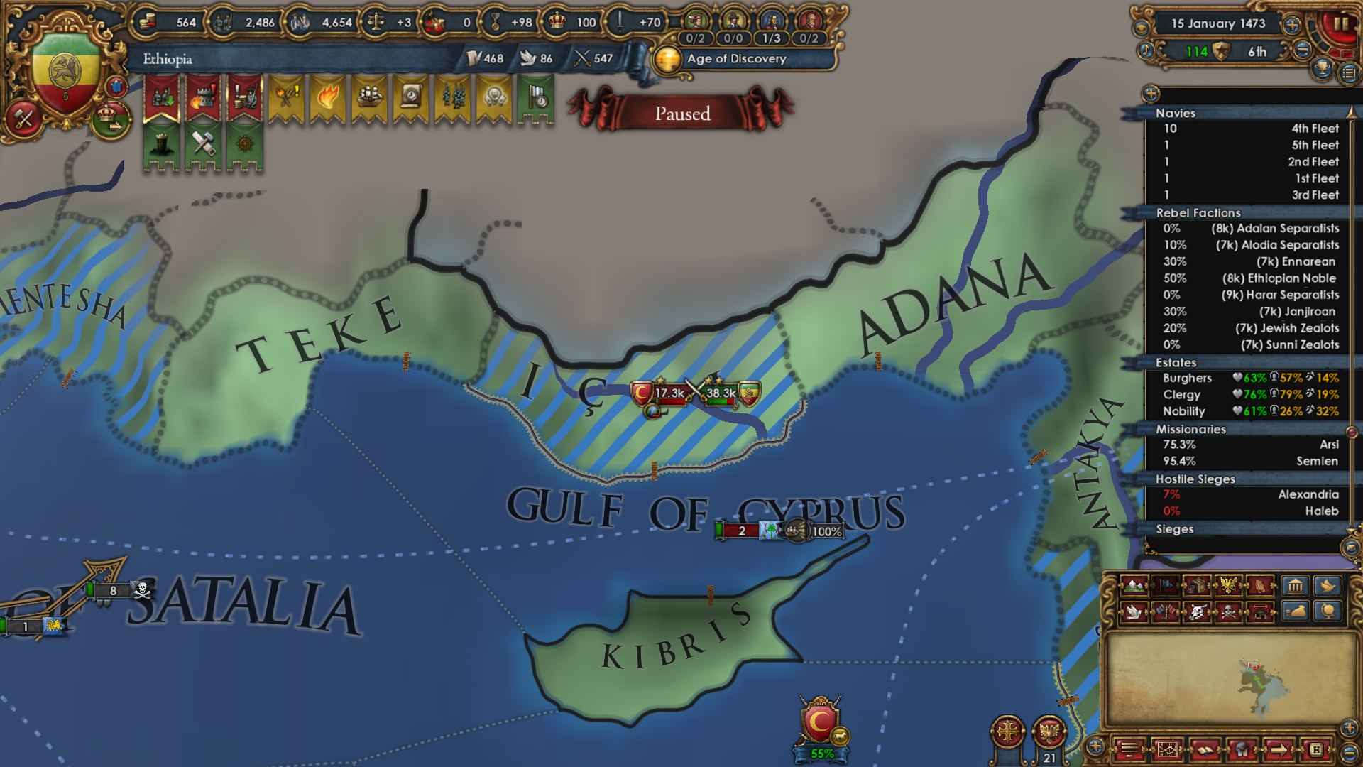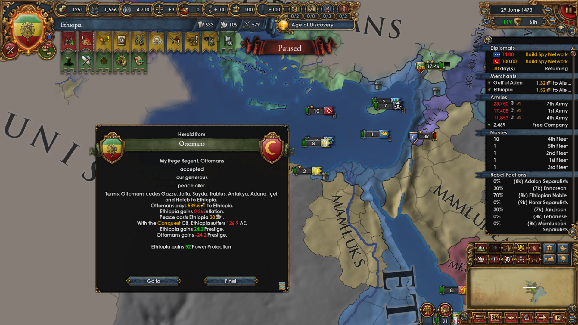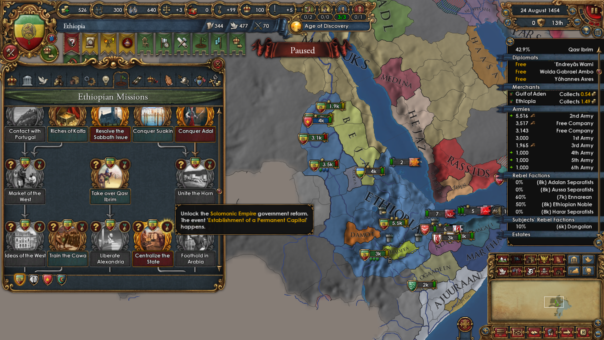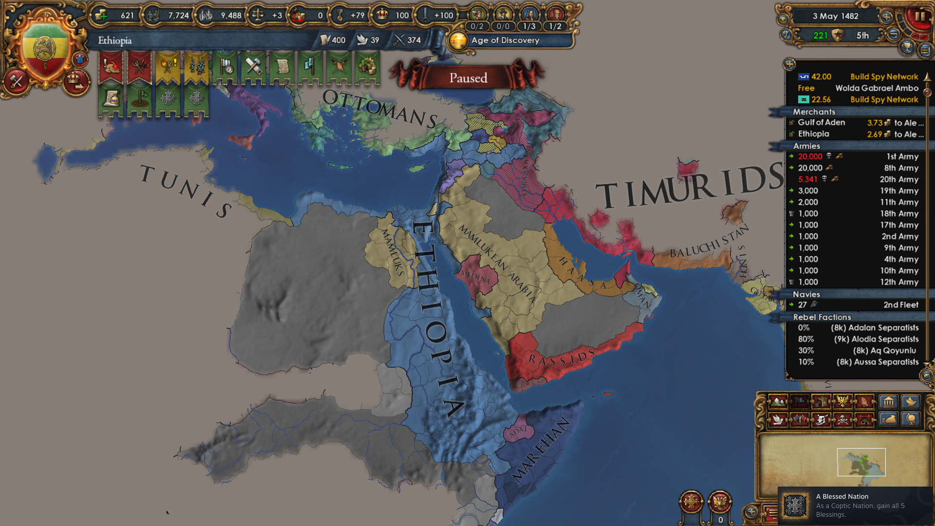 >>2301549>Why haven't you gone for beja but all other sizeable enemies, also immediate stability events.I was allied to them for a short period of time and had a truce until 1454. After that I didn't have the time, or rather I decided that my time was better spent attacking Mamluks while I was at tech 5 and they were at tech 4. Beja had no allies so I figured I could easily conquer them when the Egyptian threat has been dealt with (that is, right now). Are there really stability events for conquering them in particular? Conquering Makuria, Dongola and most of Alodia was enough to fulfill the mission. 1 additional point of stab would have been helpful because I had to manually stab up to +3 to enact Solomonic Empire early.>Where did you move your capital btw?Kaffa, the gold-producing province in the South. One of my missions required developing it to 6 production so I decided that I might as well move my capital there for the dev cost reduction, push the production up to 10 and then increase adm and mil development enough to make Renaissance appear.>>2301604I think that moving it to the Gulf of Aden would have been a mistake because now I can just move my main trading city somewhere to the Alexandria trade now and steer there from both Ethiopia and Aden. Among the provinces that I took from Mamluks, three of them have trade centers or estuaries.