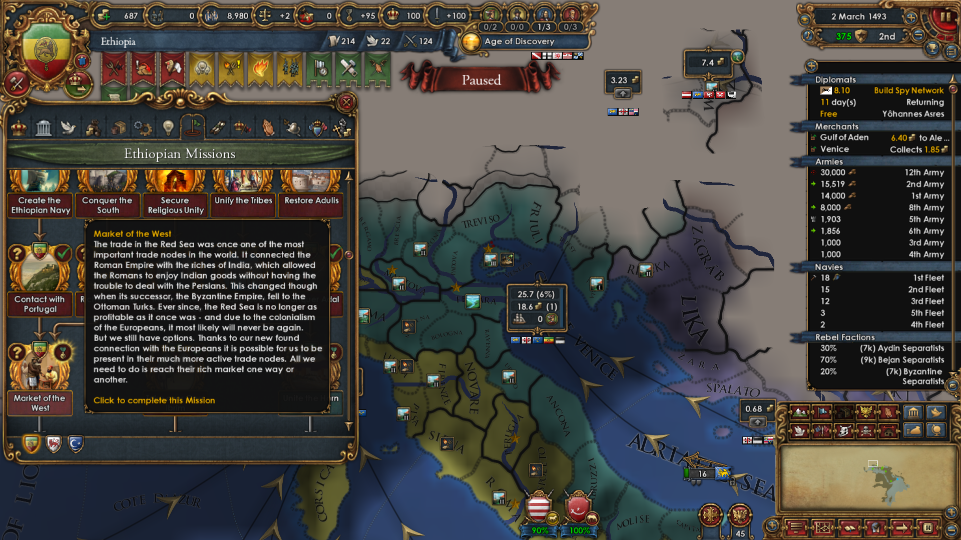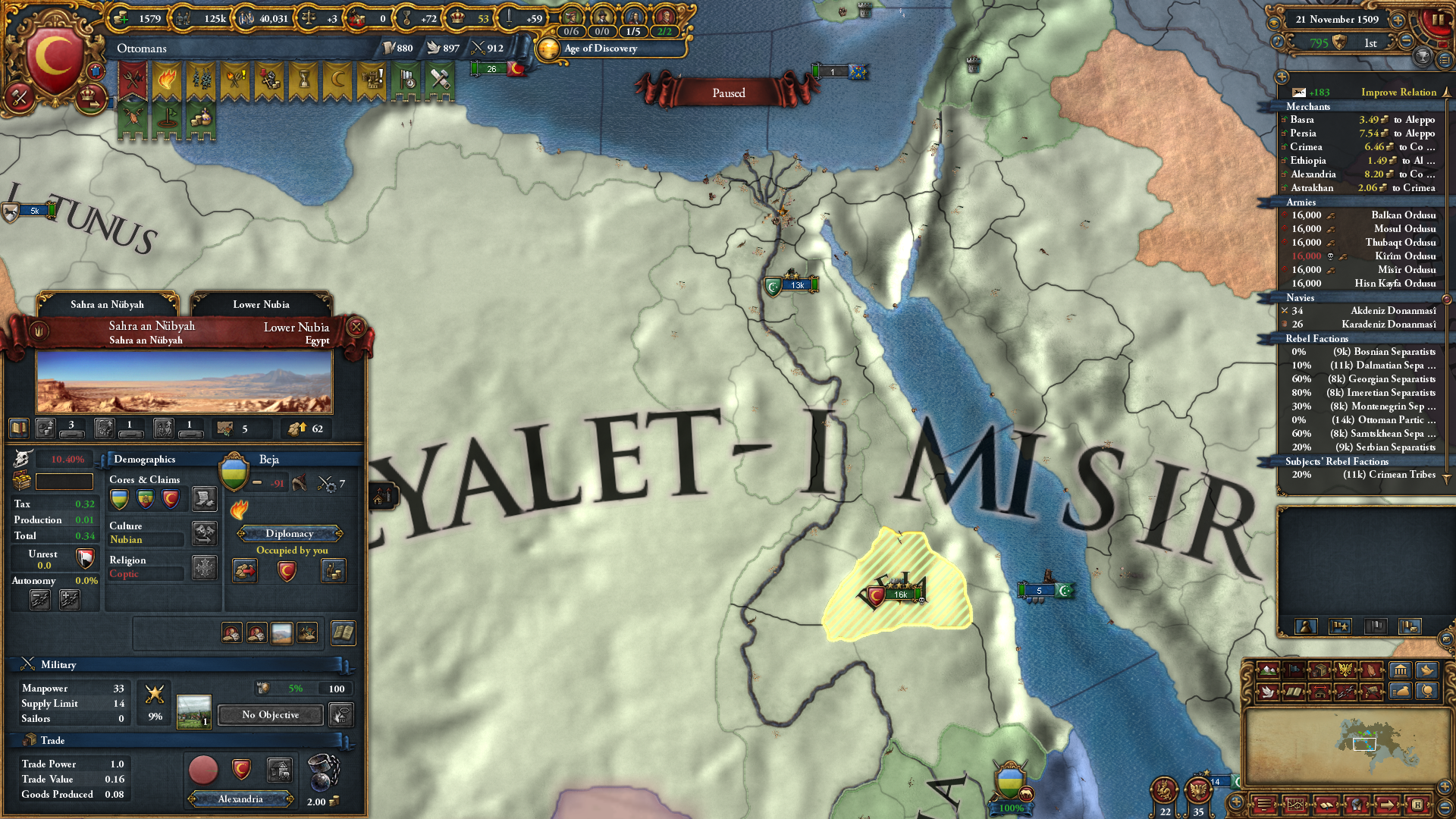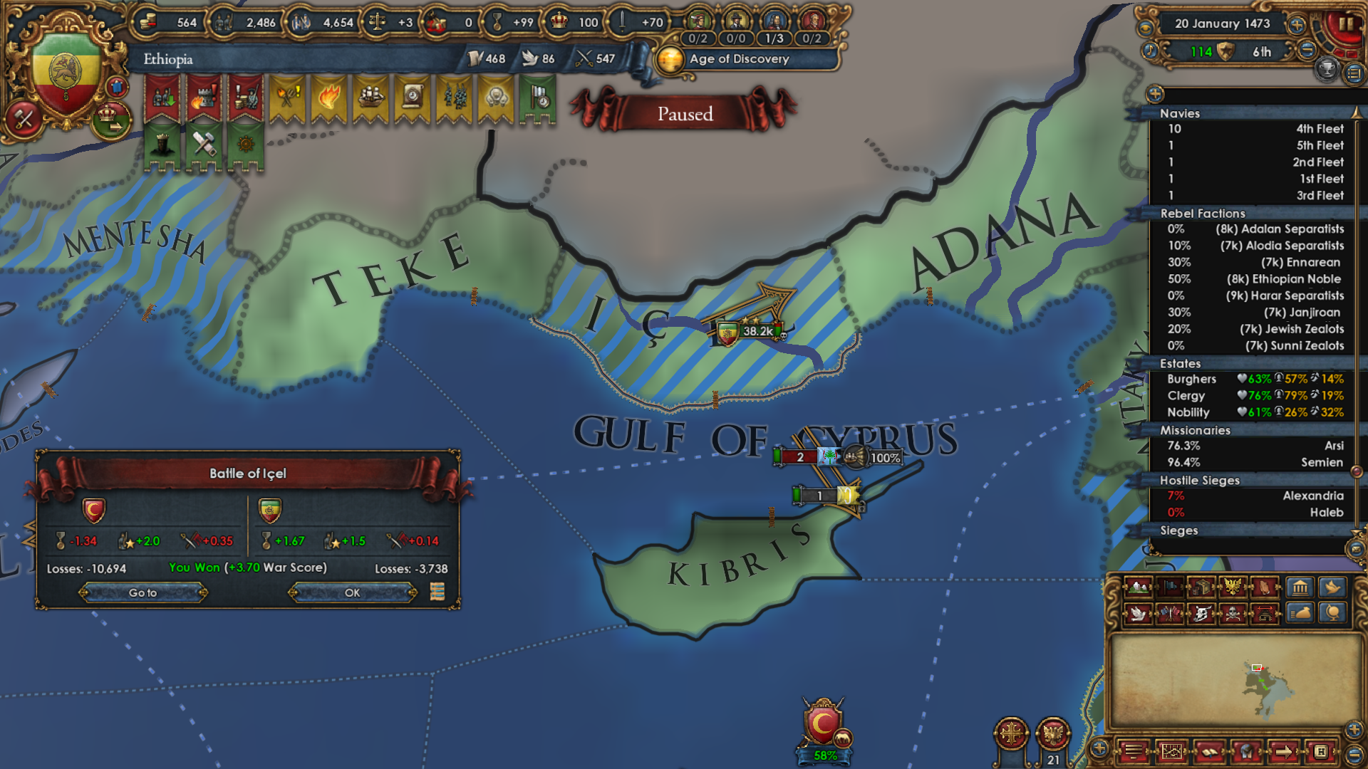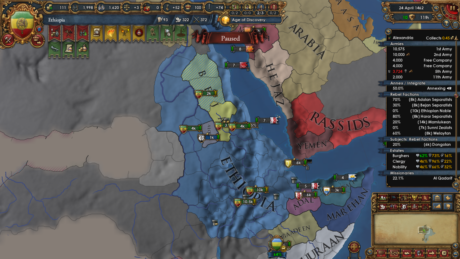 >>2301549>Why haven't you gone for beja but all other sizeable enemies, also immediate stability events.I was allied to them for a short period of time and had a truce until 1454. After that I didn't have the time, or rather I decided that my time was better spent attacking Mamluks while I was at tech 5 and they were at tech 4. Beja had no allies so I figured I could easily conquer them when the Egyptian threat has been dealt with (that is, right now). Are there really stability events for conquering them in particular? Conquering Makuria, Dongola and most of Alodia was enough to fulfill the mission. 1 additional point of stab would have been helpful because I had to manually stab up to +3 to enact Solomonic Empire early.>Where did you move your capital btw?Kaffa, the gold-producing province in the South. One of my missions required developing it to 6 production so I decided that I might as well move my capital there for the dev cost reduction, push the production up to 10 and then increase adm and mil development enough to make Renaissance appear.>>2301604I think that moving it to the Gulf of Aden would have been a mistake because now I can just move my main trading city somewhere to the Alexandria trade now and steer there from both Ethiopia and Aden. Among the provinces that I took from Mamluks, three of them have trade centers or estuaries.