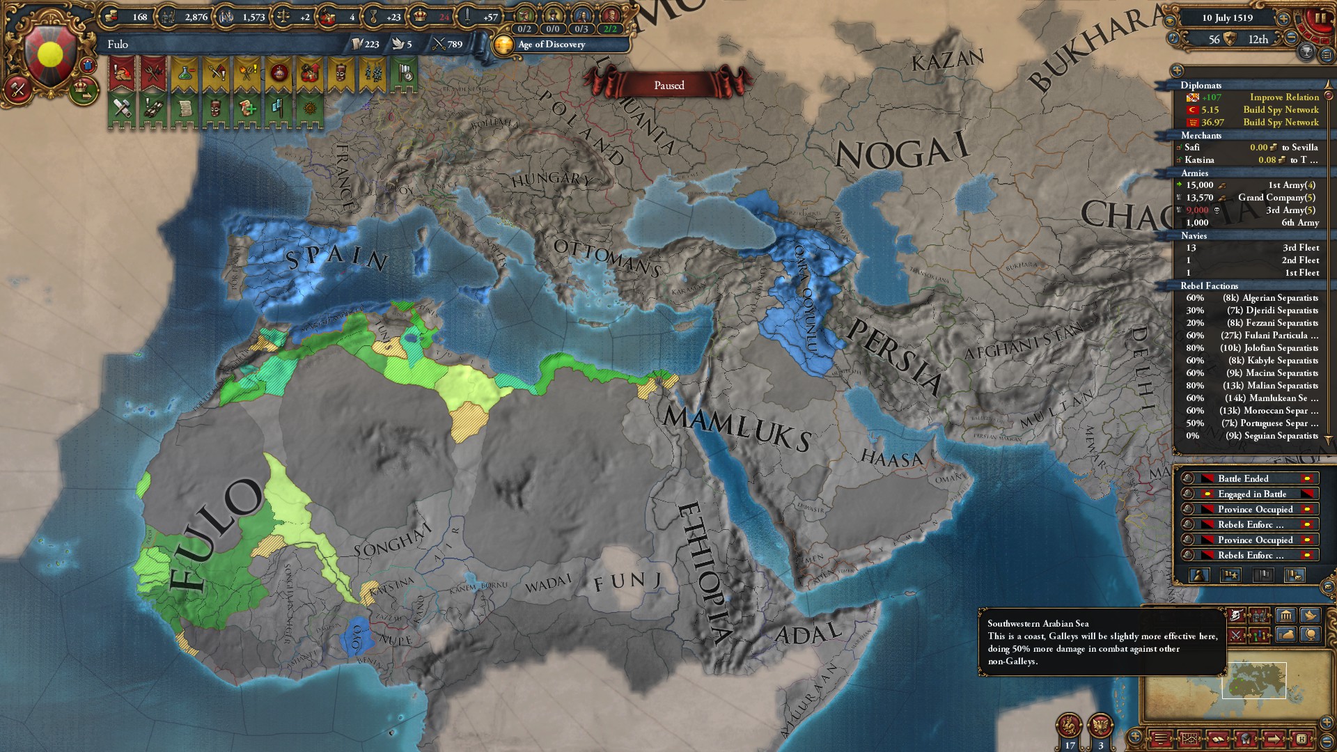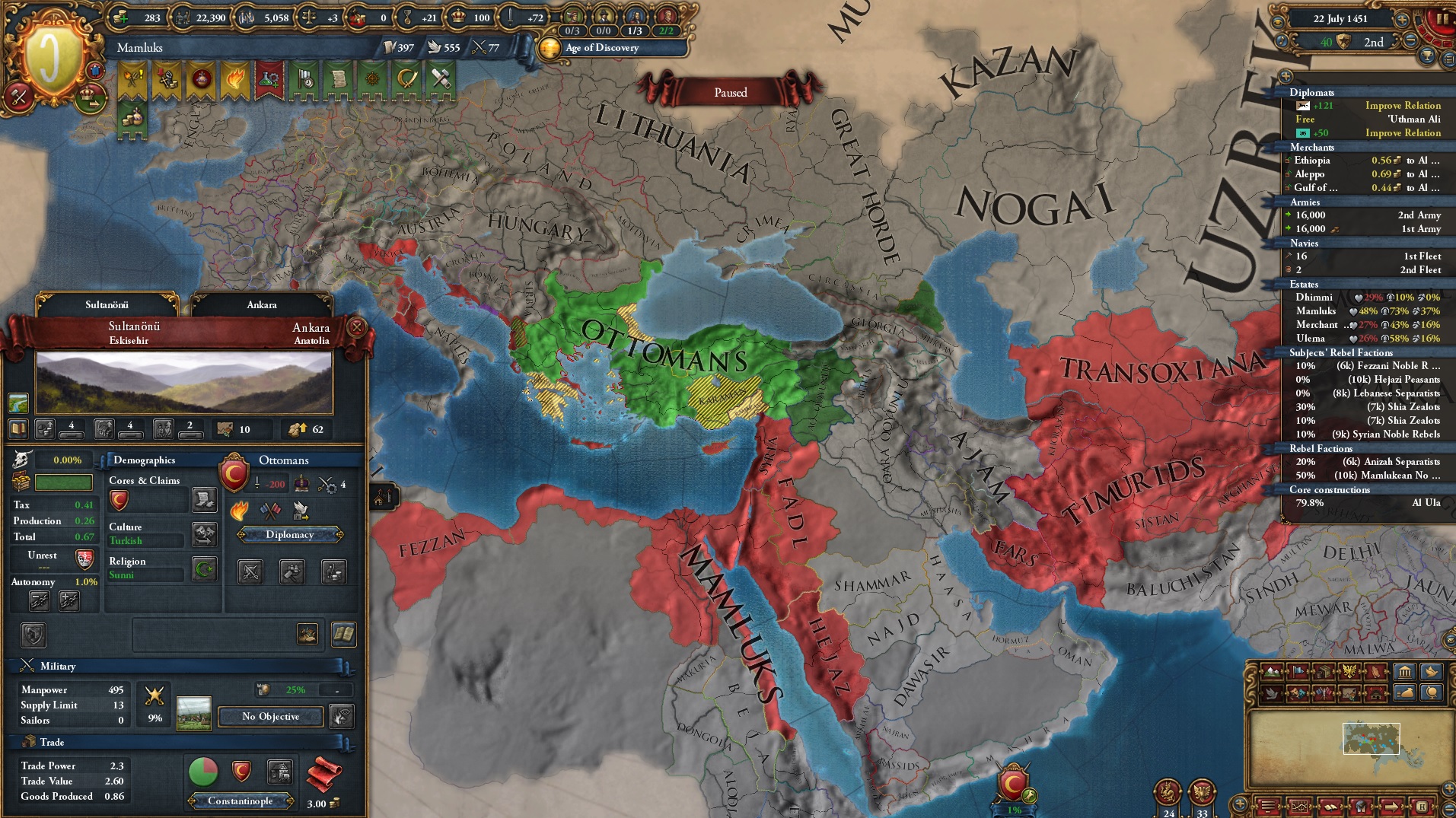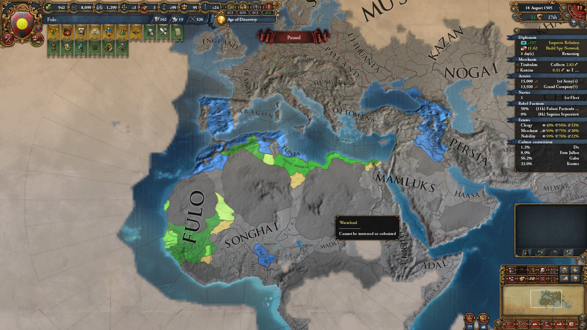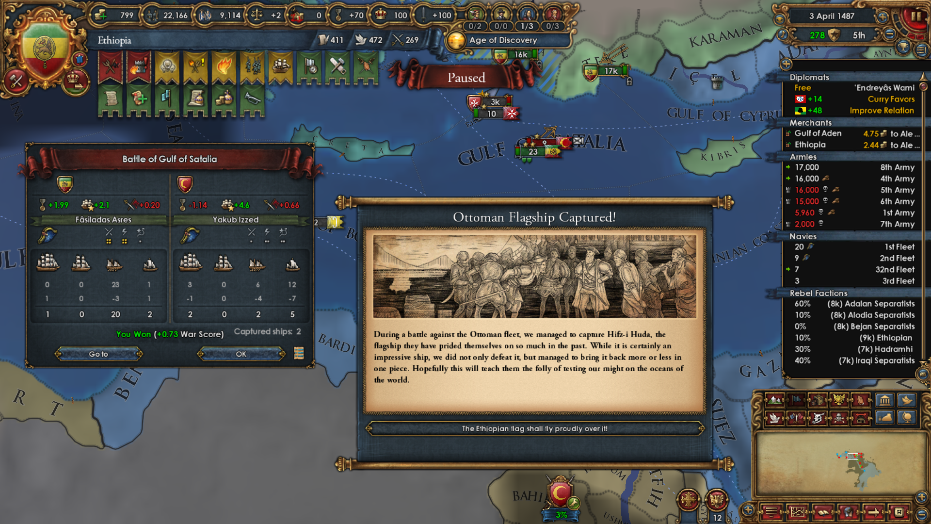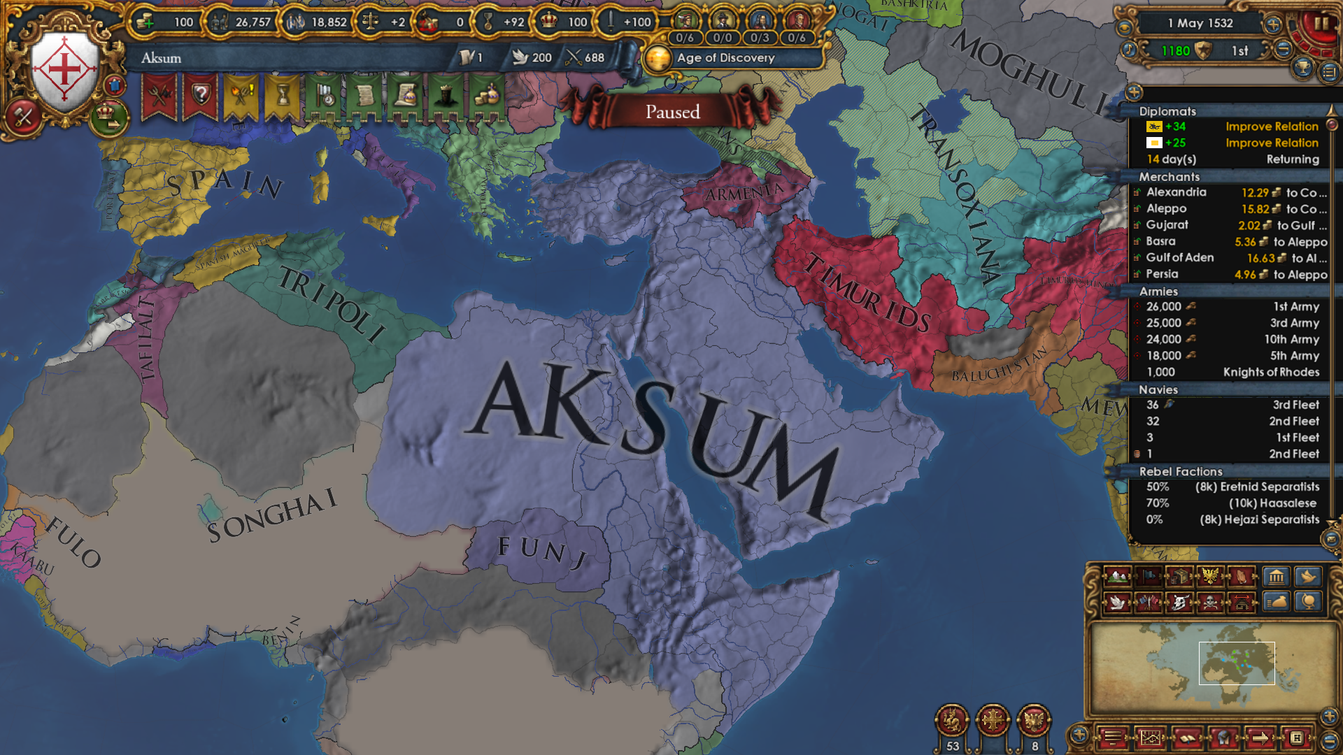 >>2301549>Why haven't you gone for beja but all other sizeable enemies, also immediate stability events.I was allied to them for a short period of time and had a truce until 1454. After that I didn't have the time, or rather I decided that my time was better spent attacking Mamluks while I was at tech 5 and they were at tech 4. Beja had no allies so I figured I could easily conquer them when the Egyptian threat has been dealt with (that is, right now). Are there really stability events for conquering them in particular? Conquering Makuria, Dongola and most of Alodia was enough to fulfill the mission. 1 additional point of stab would have been helpful because I had to manually stab up to +3 to enact Solomonic Empire early.>Where did you move your capital btw?Kaffa, the gold-producing province in the South. One of my missions required developing it to 6 production so I decided that I might as well move my capital there for the dev cost reduction, push the production up to 10 and then increase adm and mil development enough to make Renaissance appear.>>2301604I think that moving it to the Gulf of Aden would have been a mistake because now I can just move my main trading city somewhere to the Alexandria trade now and steer there from both Ethiopia and Aden. Among the provinces that I took from Mamluks, three of them have trade centers or estuaries.