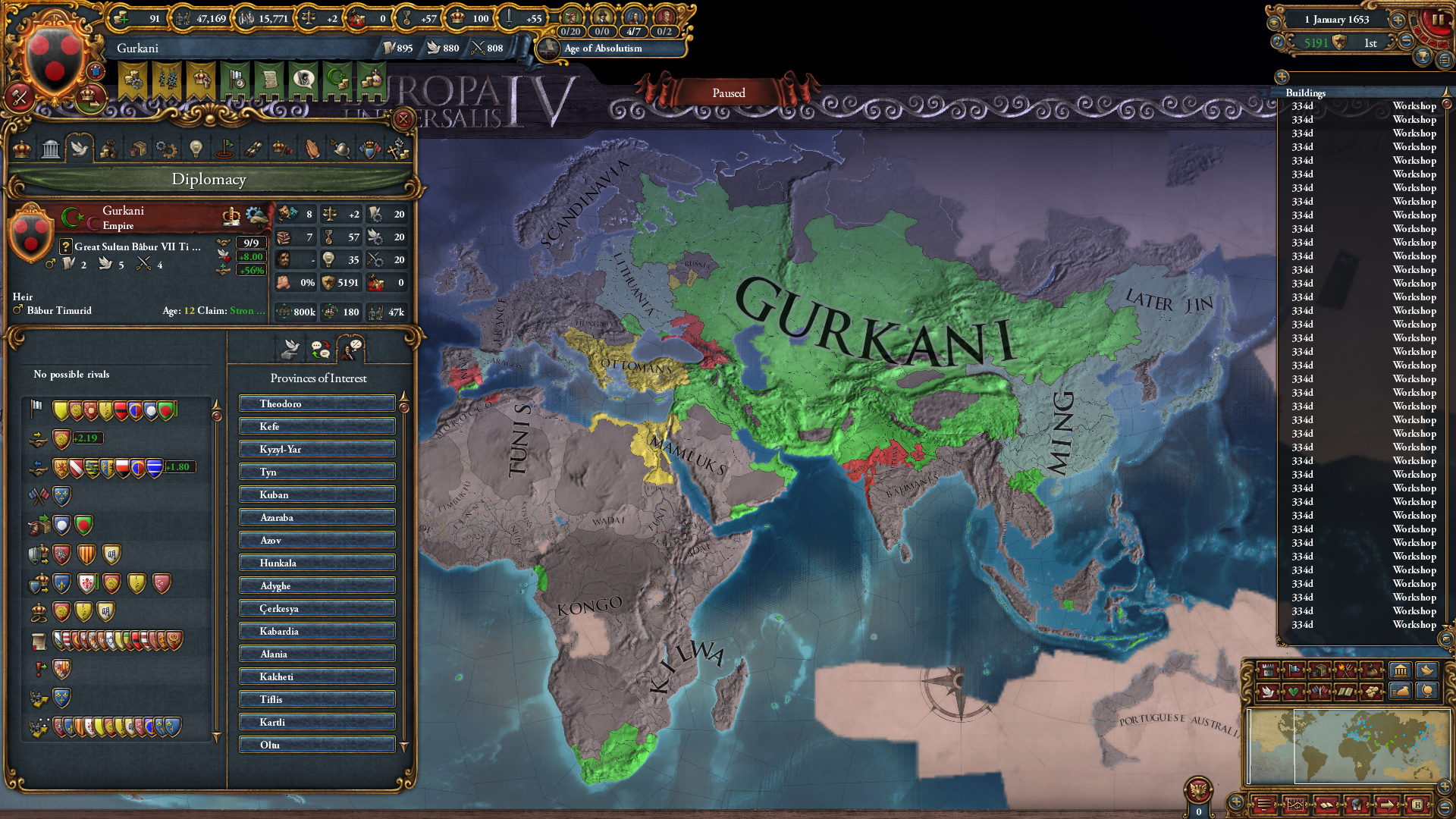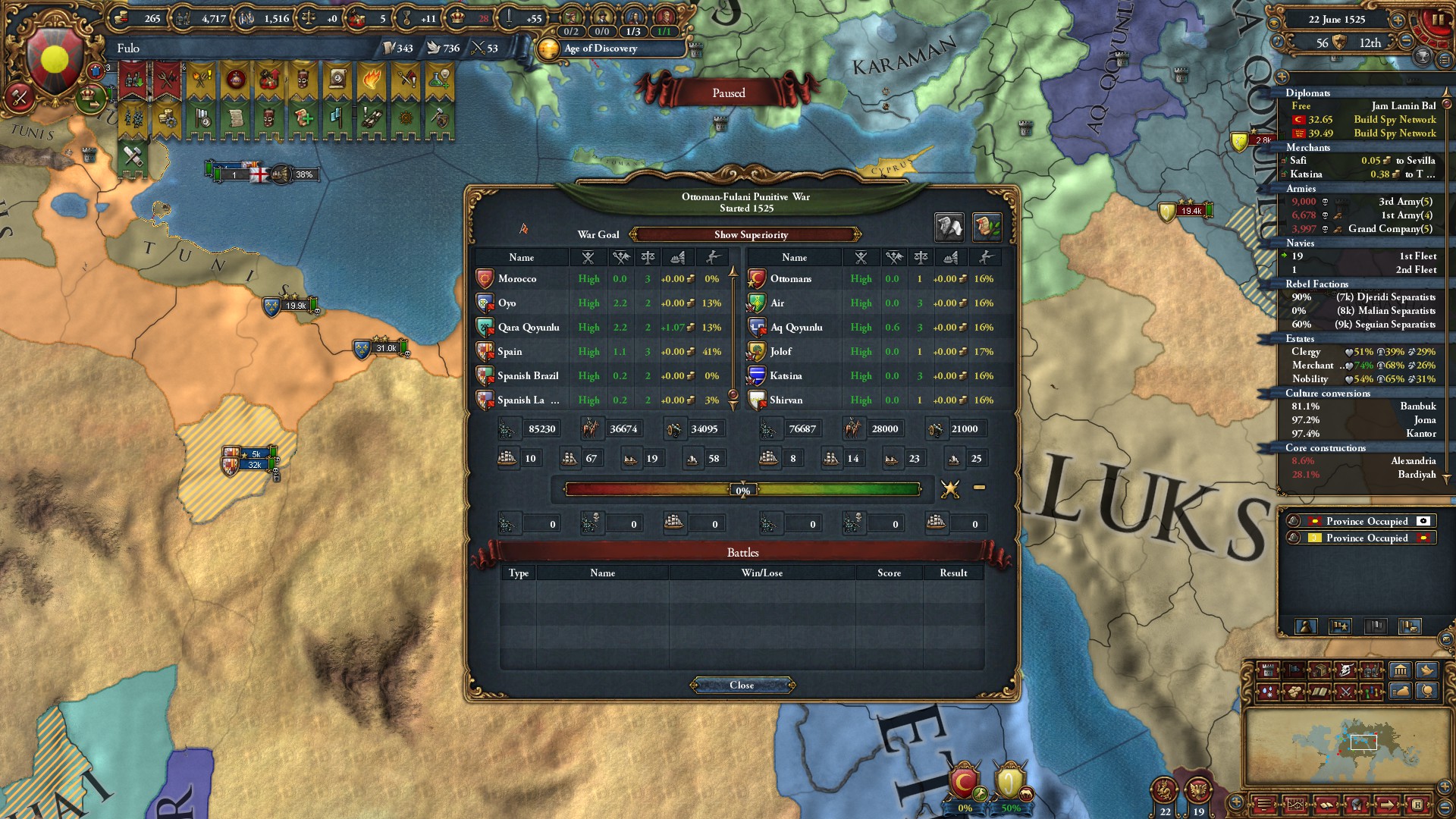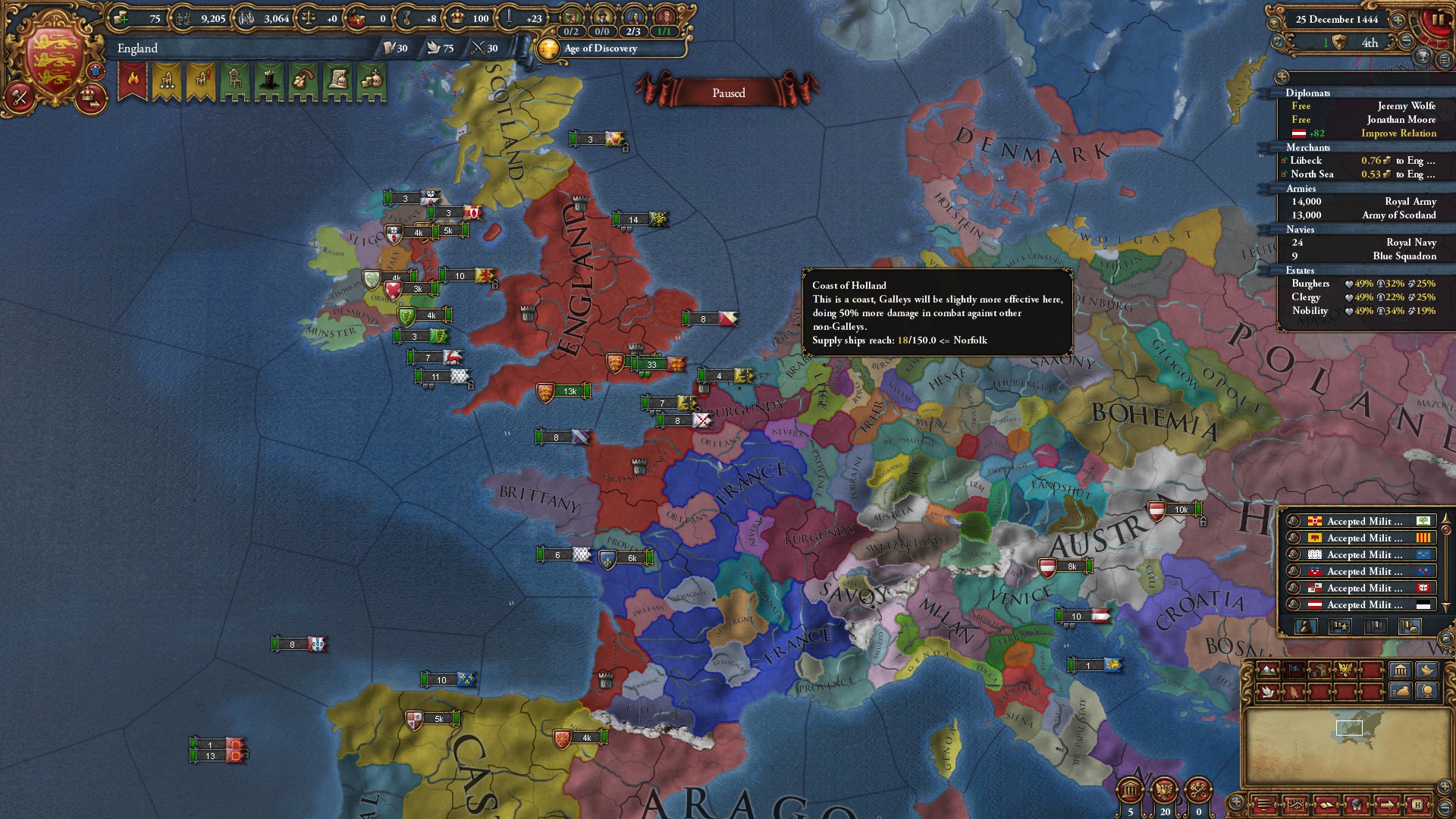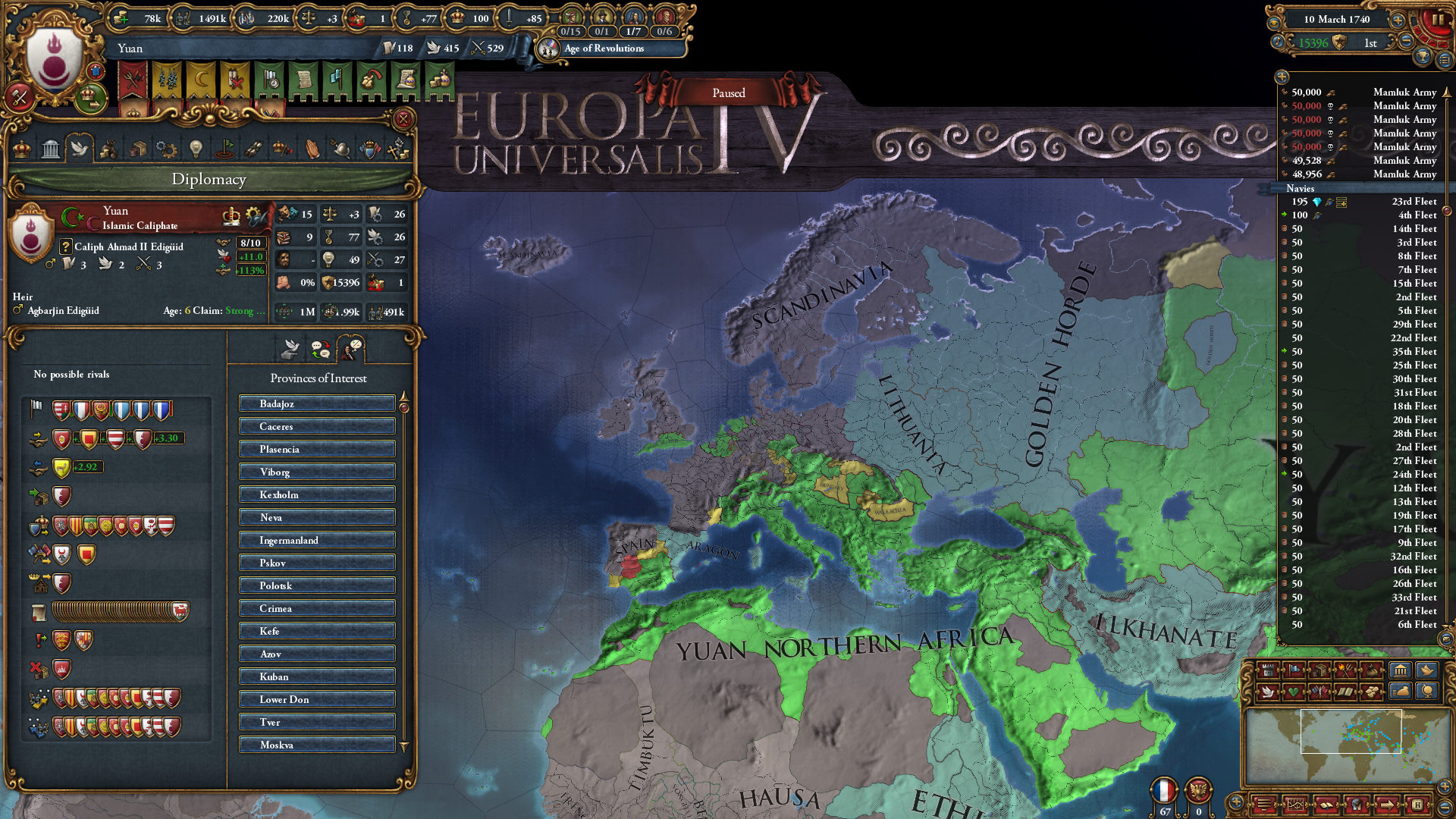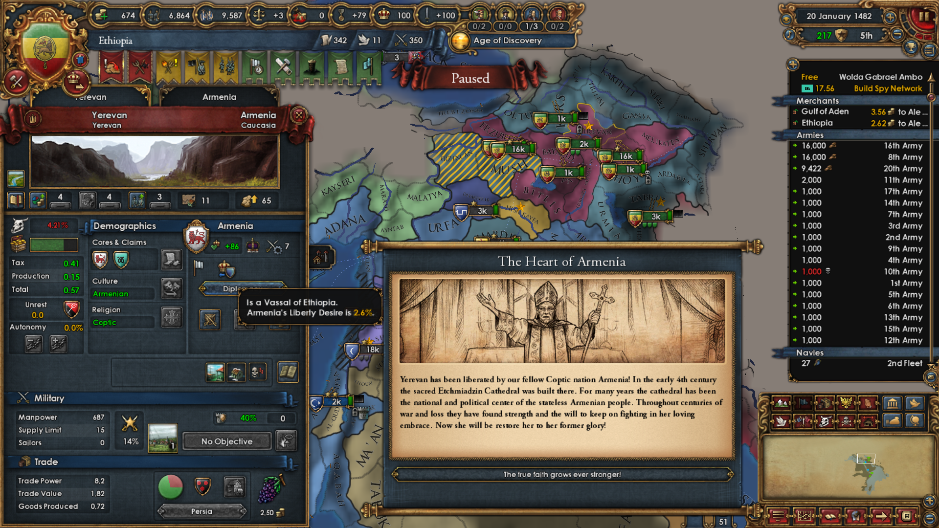 >>2301549>Why haven't you gone for beja but all other sizeable enemies, also immediate stability events.I was allied to them for a short period of time and had a truce until 1454. After that I didn't have the time, or rather I decided that my time was better spent attacking Mamluks while I was at tech 5 and they were at tech 4. Beja had no allies so I figured I could easily conquer them when the Egyptian threat has been dealt with (that is, right now). Are there really stability events for conquering them in particular? Conquering Makuria, Dongola and most of Alodia was enough to fulfill the mission. 1 additional point of stab would have been helpful because I had to manually stab up to +3 to enact Solomonic Empire early.>Where did you move your capital btw?Kaffa, the gold-producing province in the South. One of my missions required developing it to 6 production so I decided that I might as well move my capital there for the dev cost reduction, push the production up to 10 and then increase adm and mil development enough to make Renaissance appear.>>2301604I think that moving it to the Gulf of Aden would have been a mistake because now I can just move my main trading city somewhere to the Alexandria trade now and steer there from both Ethiopia and Aden. Among the provinces that I took from Mamluks, three of them have trade centers or estuaries.