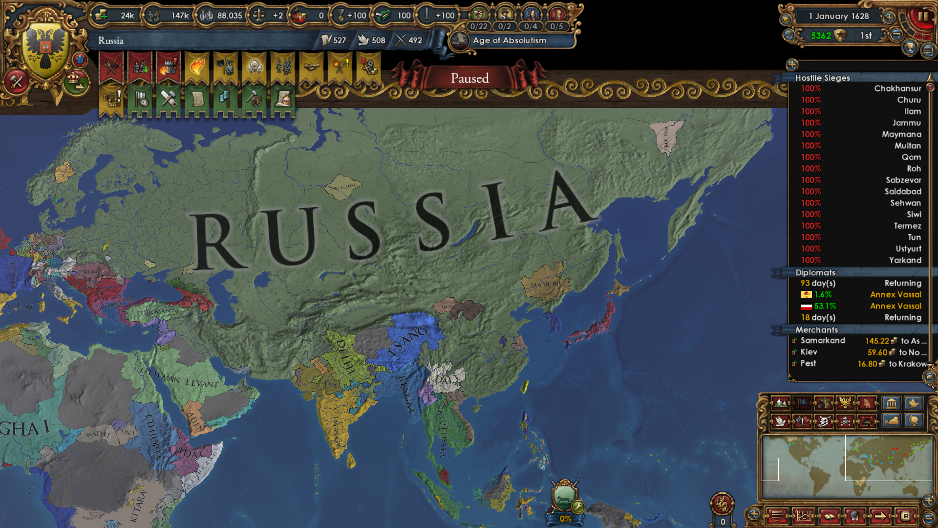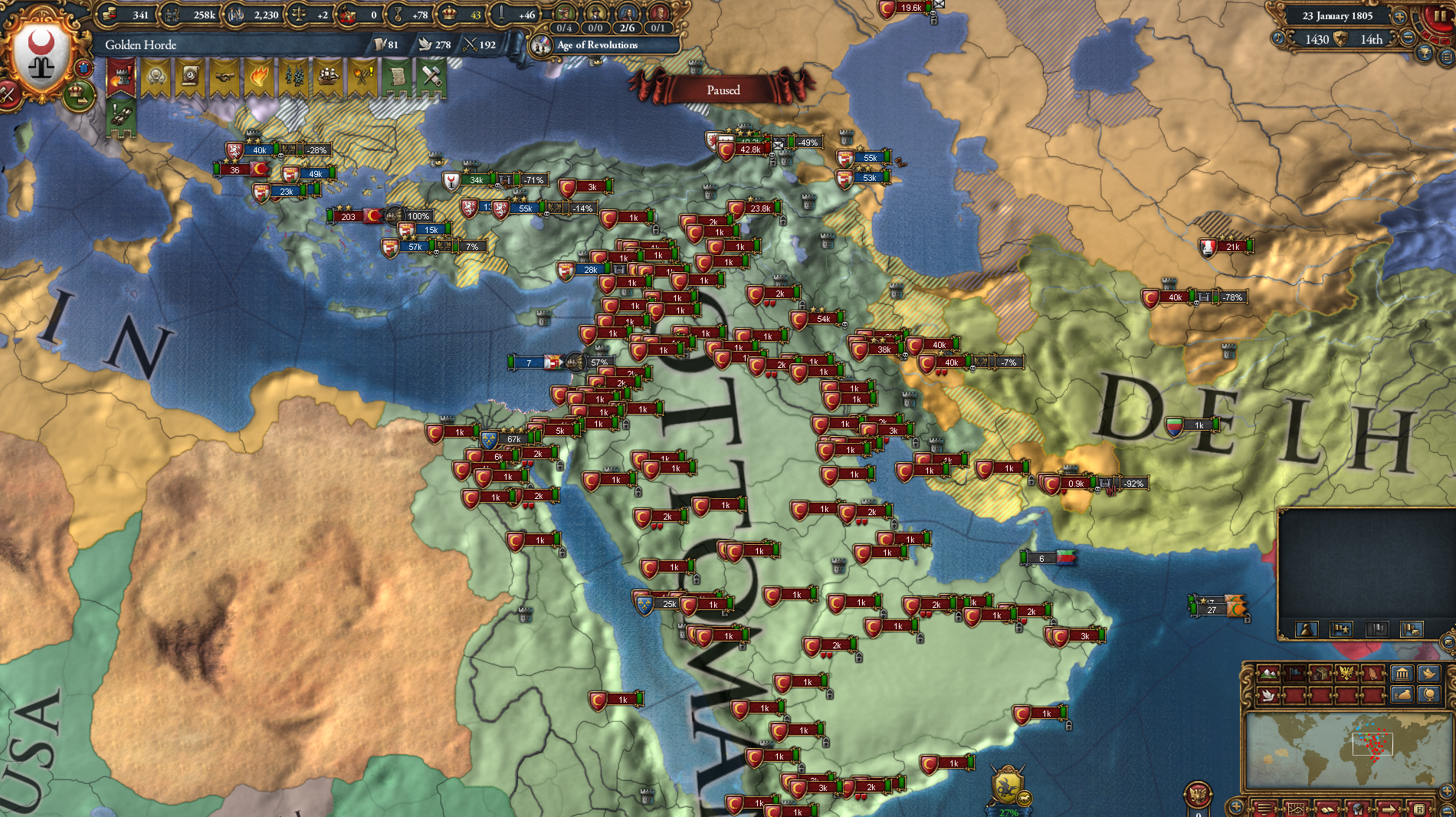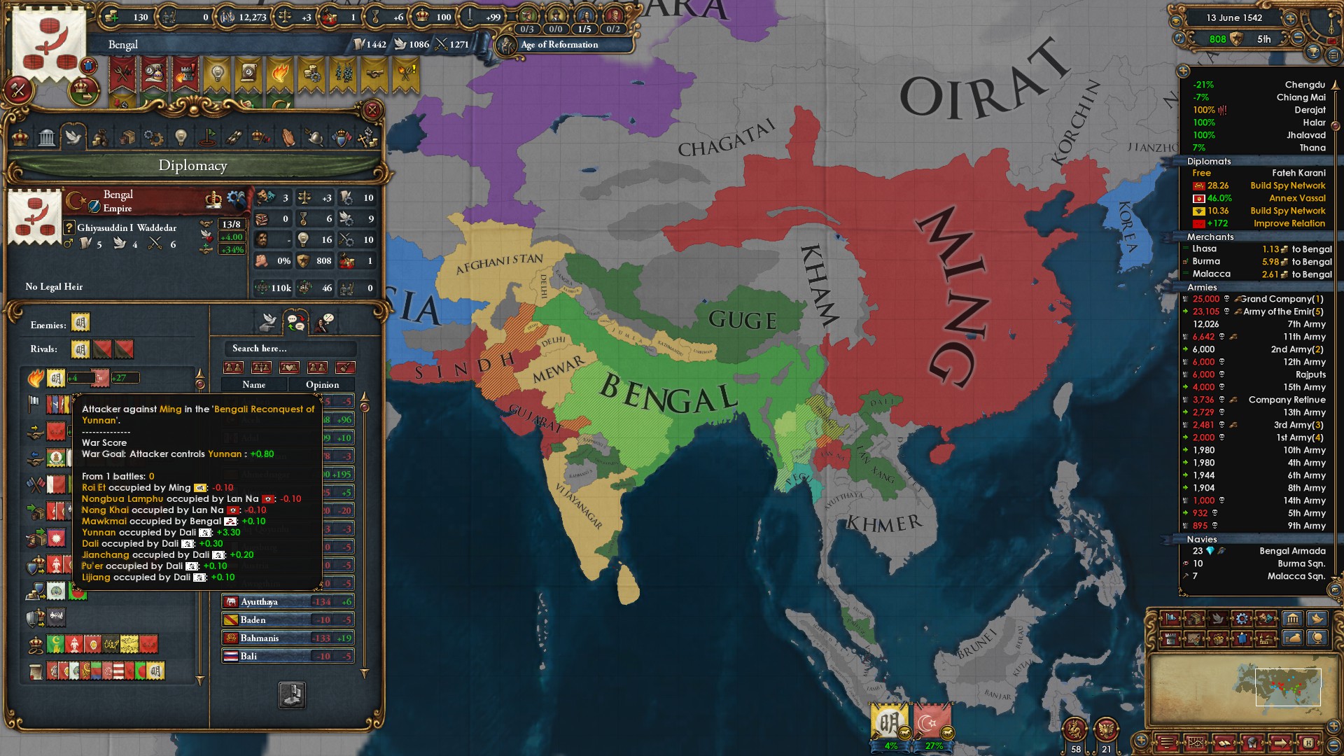 >>2321406I posted it because of the shape.But yeah, I'm learning. Playing out a run where I went deep in debt fighting Muscovy and didn't have colonialism until sometime after 1600 probably?I'm only now catching up in tech. Not having money also means I don't get as many monarch points from advisors, and tech costs more from not having institutions.For most of the playthrough, even just having an army near, not at force limit would put me in the red from maintenance unless I constantly micromanaged the slider.All my expansion directions were walled off pretty well by alliances except Shun, which I tried to invade by myself but my armies took massive damage trying to fight through their forts for whatever reason. But Delhi just attacked me and I managed to win some land by picking off armies with forced march. I made them nullify their alliance with Bengal so Bengal will help me next time.Perm and Novgorod are vassals. Kazan is still alive because they're allied with only Ottomans so I can declare war on them before the end of the playthrough, but currently they're at 500k+ soldiers to my 180k or so.