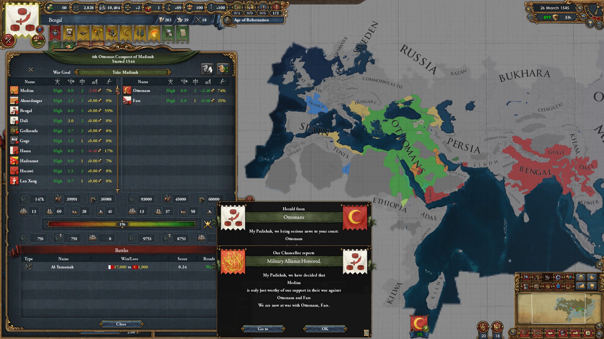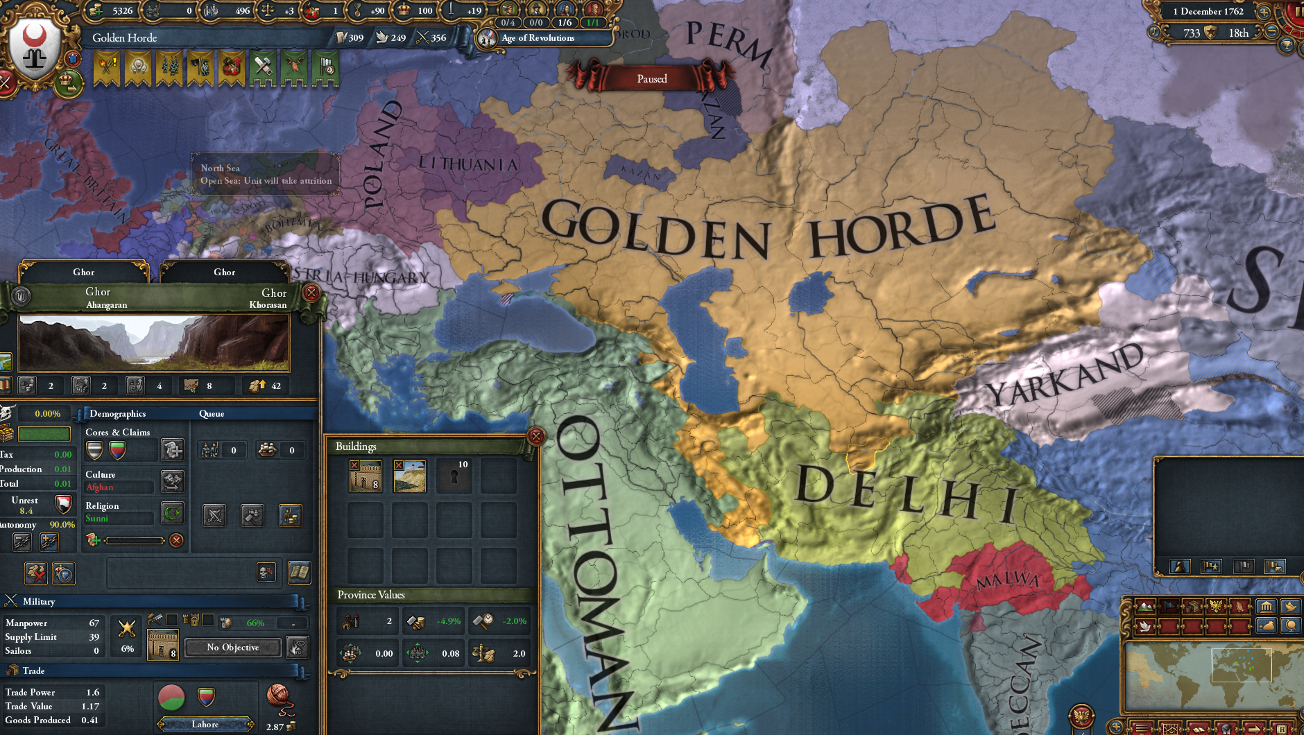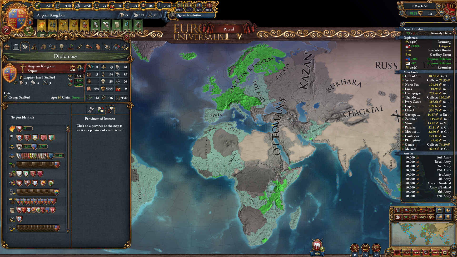 >>2321406I posted it because of the shape.But yeah, I'm learning. Playing out a run where I went deep in debt fighting Muscovy and didn't have colonialism until sometime after 1600 probably?I'm only now catching up in tech. Not having money also means I don't get as many monarch points from advisors, and tech costs more from not having institutions.For most of the playthrough, even just having an army near, not at force limit would put me in the red from maintenance unless I constantly micromanaged the slider.All my expansion directions were walled off pretty well by alliances except Shun, which I tried to invade by myself but my armies took massive damage trying to fight through their forts for whatever reason. But Delhi just attacked me and I managed to win some land by picking off armies with forced march. I made them nullify their alliance with Bengal so Bengal will help me next time.Perm and Novgorod are vassals. Kazan is still alive because they're allied with only Ottomans so I can declare war on them before the end of the playthrough, but currently they're at 500k+ soldiers to my 180k or so.