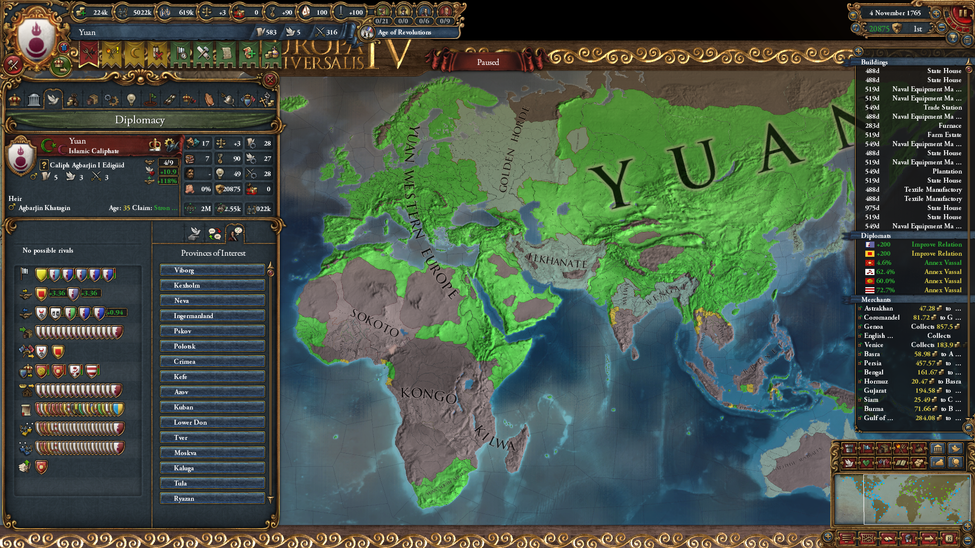 >>2321358>>2321406Final map with a lot of overextension. Japan released Mongolia and Yan for me to annex separately from Shun, which was very nice of them.I feel like I learned at least something from this playthrough, if only with how I need to babysit the ally AI at all times to not have them throw away my wars for me. I saw how useful it is to become Golden Horde at least, since I didn't know what the benefits were.I still feel like I can have a better start as Crimea, as I was deep in debt from difficult wars and didn't have colonialism until after 1600. I want to have a true win over Ottomans and I didn't really get it until the very end this time, taking a random string of land in Macedonia.Having read up on what DLC does, it sounds like hordes get a lot of new stuff. I've been playing with:>no estates whatsoever (other countries have them)>no razing>no special units or special horde vassals?>legitimacy instead of horde unity (ability descriptions already spoil this in the base game)>different missions>none of the general DLC stuff like diplomatic favors, knowledge sharing/stealing, edicts, age abilities, or spies having meaningful effects other than fabricating claims that I don't need very much, for most of the game>probably moreOverall it sounds like playing with DLC would be way, way, easier which at this point feels... kind of lame? I'm not sure if I want to make the game easier if I'm trying to beat my last run. I don't know.