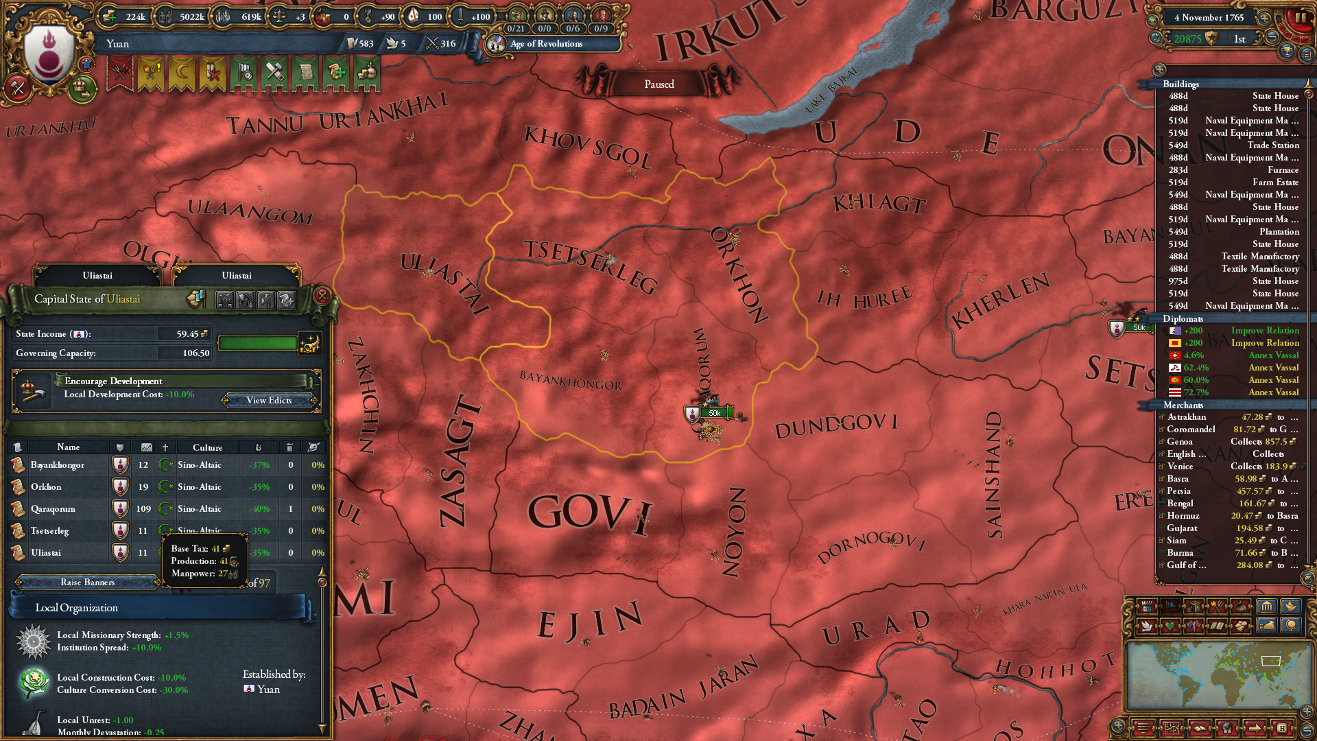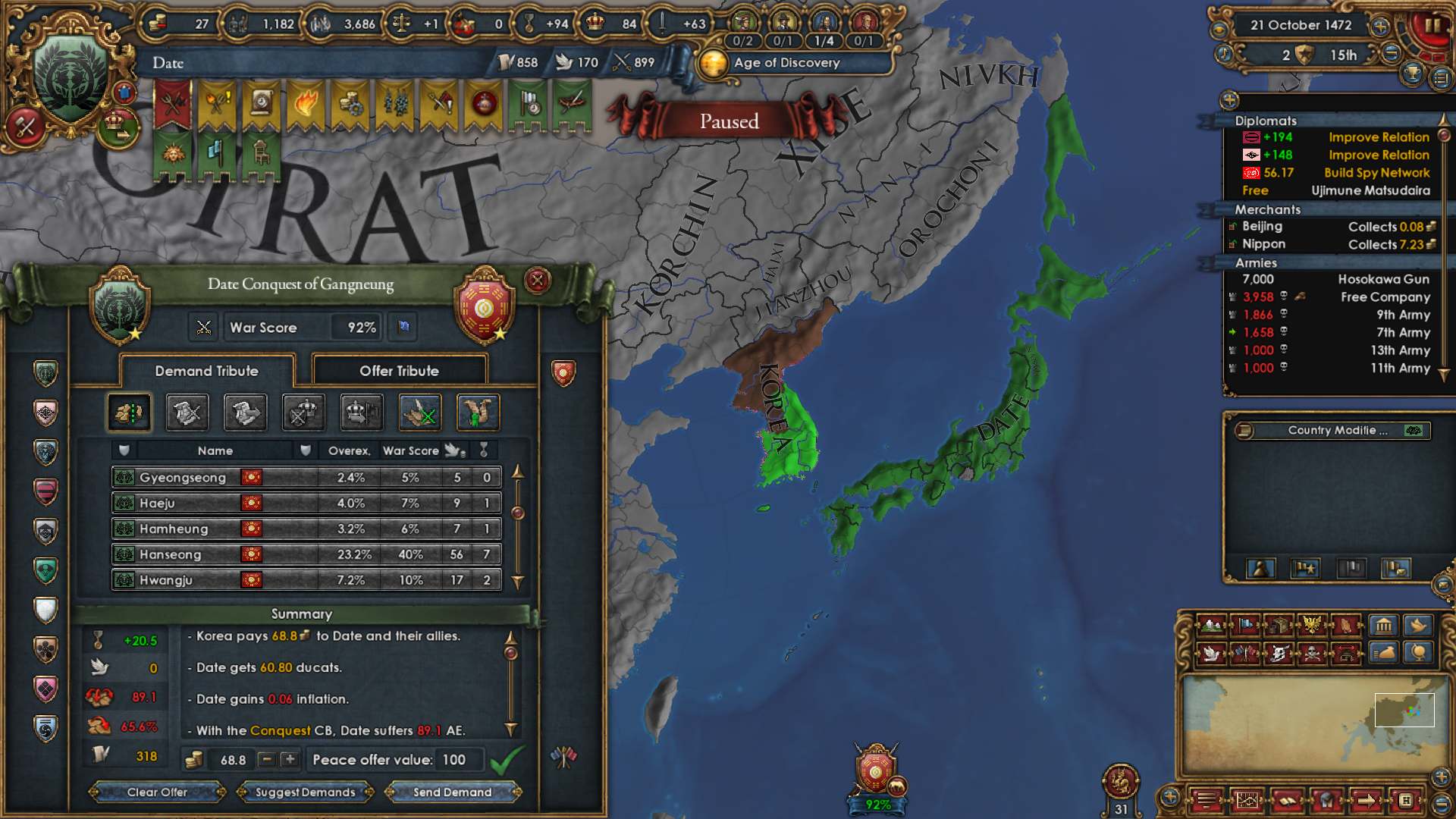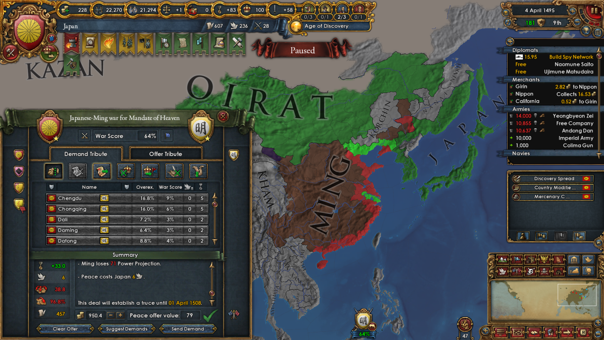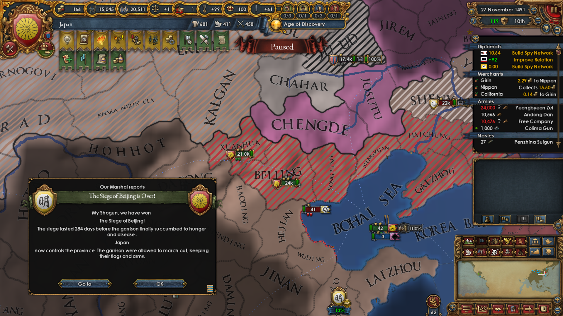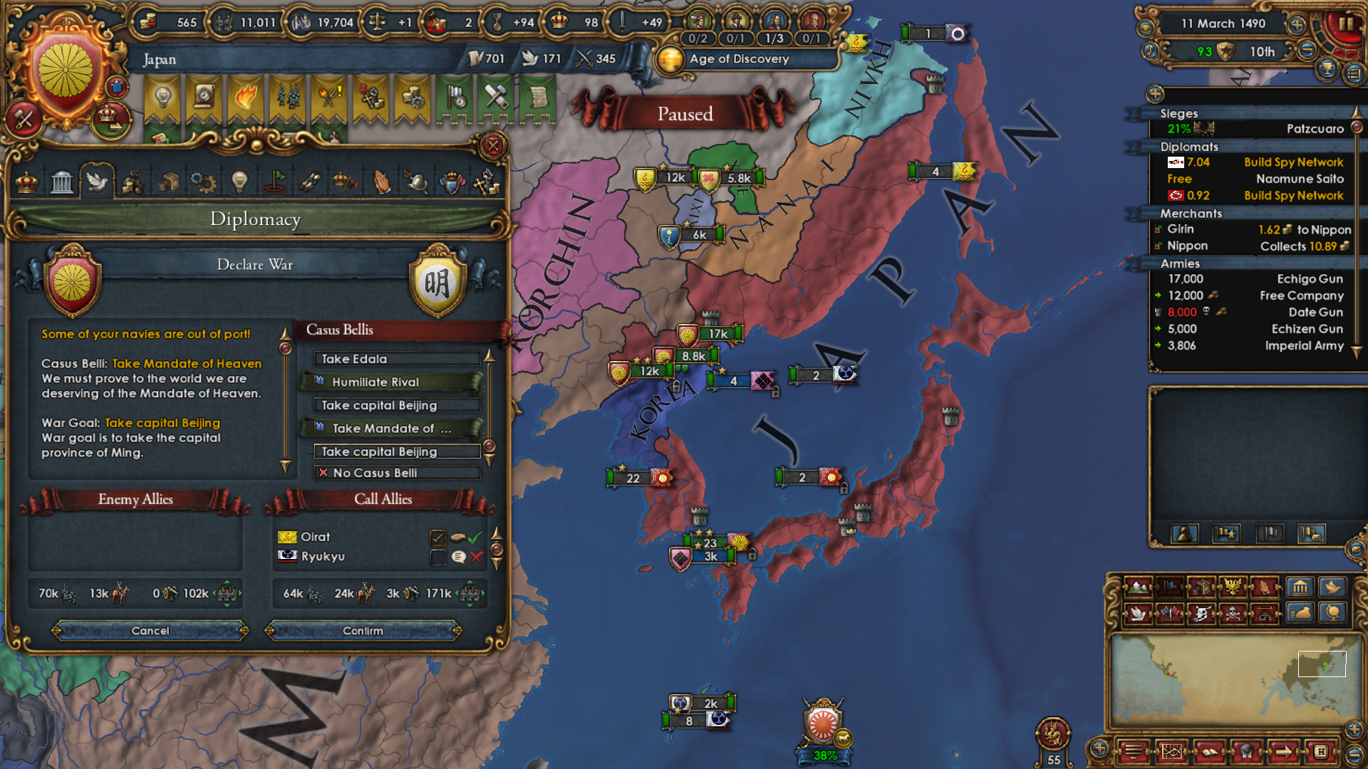 The war with Ming was easier than expected. Even with Mandate above 50, they kept sending their units into Oirat wastelands and losing big numbers of them to attrition. I took Beijing while they were distracted.