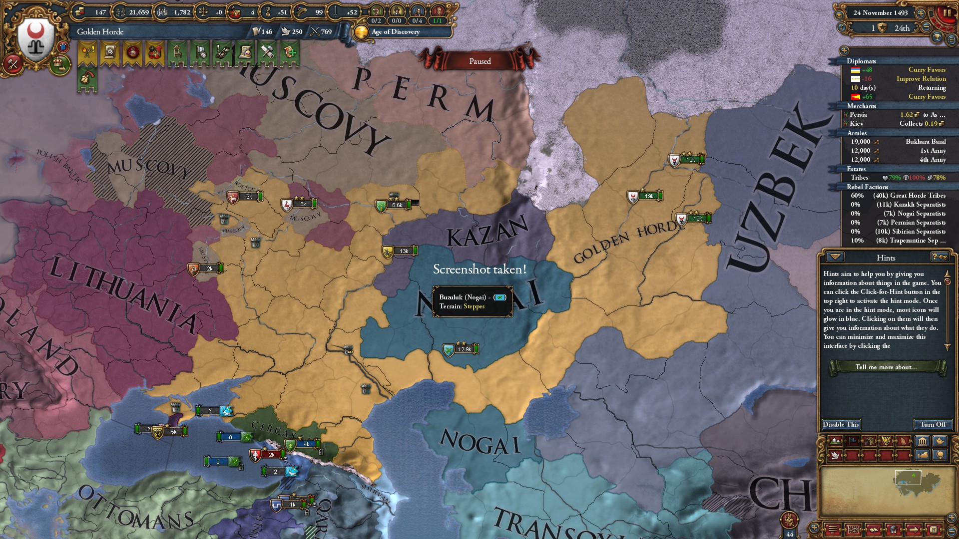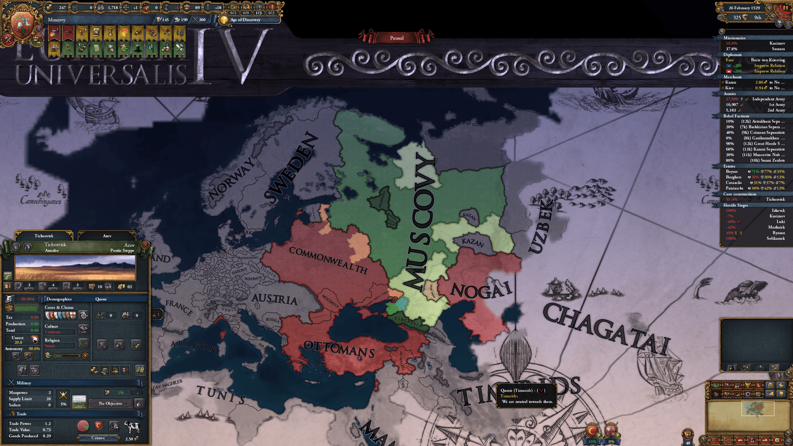 >>2319701>>2319921That'd be giving up though... I've already felt close to knocking down the ottomans a couple times but something always ruins it.Actually this attempt had a super lucky start in that respect. One, this is the first death loop where Austria made Hungary its subject. It's 1545 and the Ottomans have been stuck in their cage since the 1450s. While I wasn't looking Karaman expanded east before Ottomans did somehow and now Karaman is allied with me and Mamluks. I'm allied with Karaman, Austria, Nogai, Kazan, and Ajam. And Georgia is my vassal. The only problem is I don't have a casus belli on Ottomans. For some reason Mamluks will never, ever ally with me until they have already lost to the Ottomans multiple times.I think this is the run where I become Golden Horde, but I also think I'm going to fall behind really hard soon because it's also been very unlucky in other places. I'm in severe financial difficulty and won't be able to afford colonialism for a long time.>Austria won't help vs. Muscovy so I have them take Lithuanian reconquest cores for me against Ryazan-Lithuania alliance>comet>immediately after, go to war with numbers and tech advantage against Muscovy with horde allies>war turns costly and nasty because both allies go behind enemy lines to siege different forts for no reason and don't even try to run when they get picked off (why does only the ally AI do this? enemy AI knows I'm coming for them the second I right click and runs away)>saved by sweden also warring Muscovy, but I'm already deep in debt>khan immediately dies, causing a succession war event that spawns rebels in every uncored province, and there's 10-15 of those>I now have like 16k troops, including a mercenary against 60-70k rebels>another comet to top it all off>somehow get through it with like 5k troops leftI have to keep deathlooping to spite the game at this point