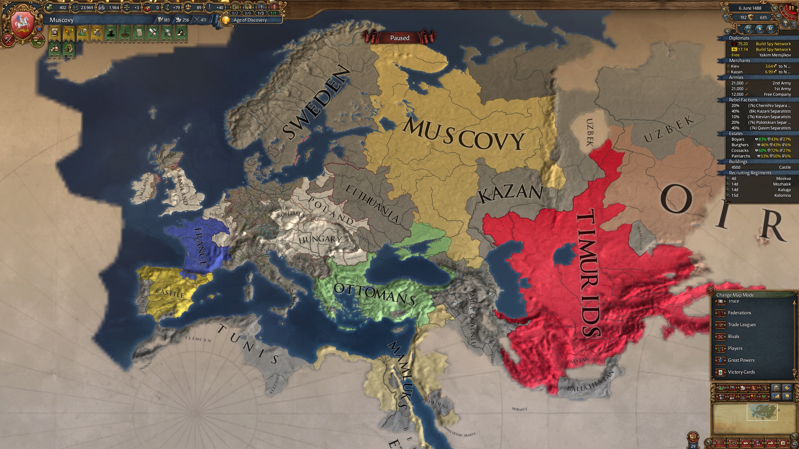 Playing Voltaire's Nightmare pacifist playthrough (plus threaten war is also not allowed)Not even 300 years after the start date, Iberia is finally united. This is why I love EU4 over EU5. The diplomacy gameplay is just on a completely different level. Between being able to specialize into diplomacy through ideas, to renting condottieri, allying someone for a short period just to break their other alliances, and returning cores for favors. It just can't be compared to the poor diplomatic options of five.
