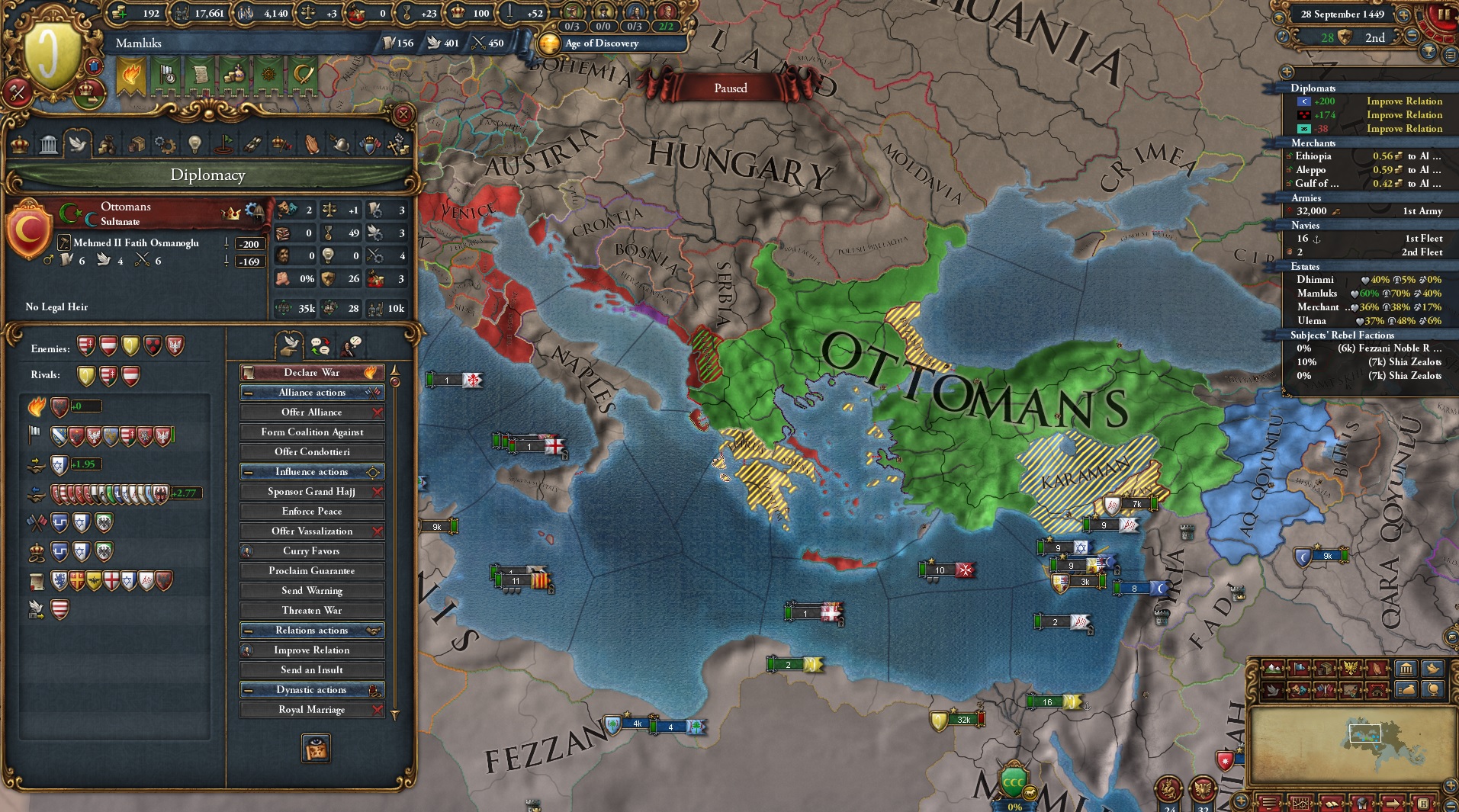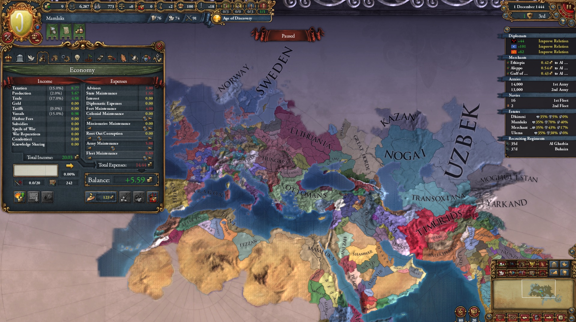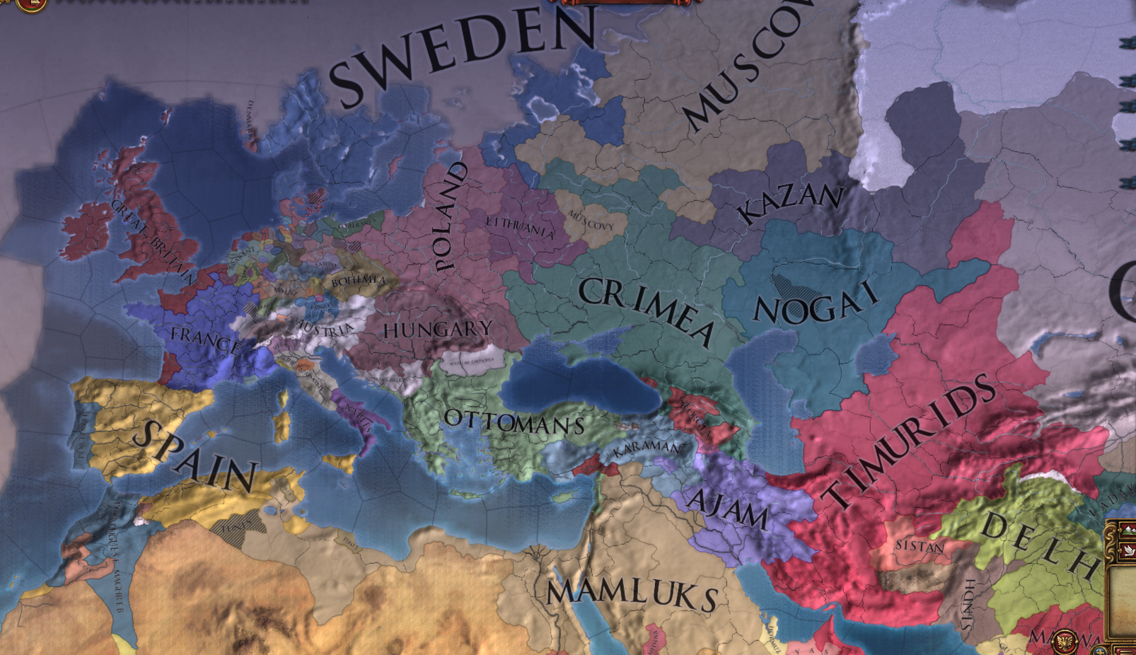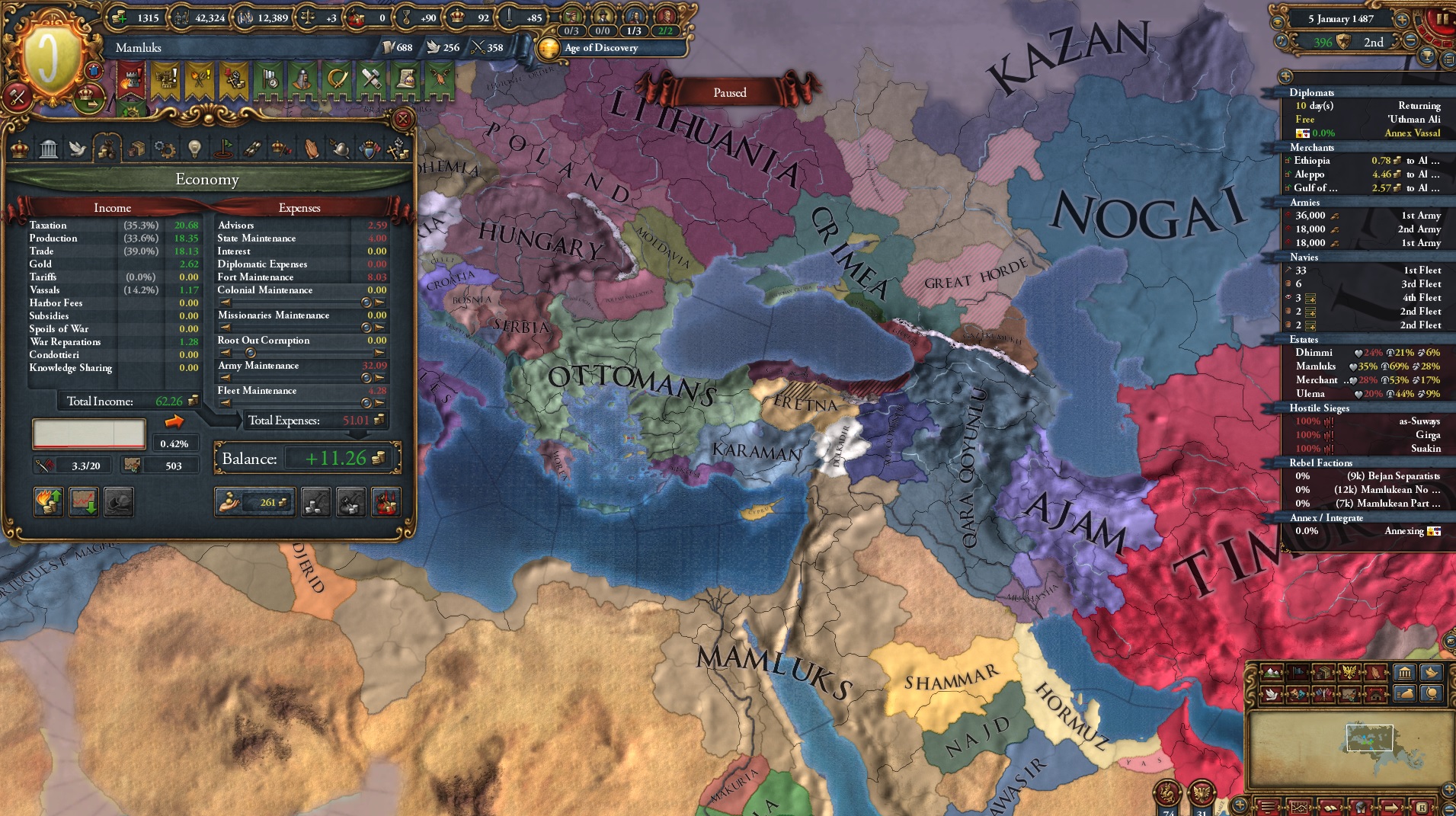 Mamluks first tick3rd largest army5th largest income6th great powerHas 3 vassals and claims on AnatoliaThis nation seems formidable but it almost always loses to the Ottomans.