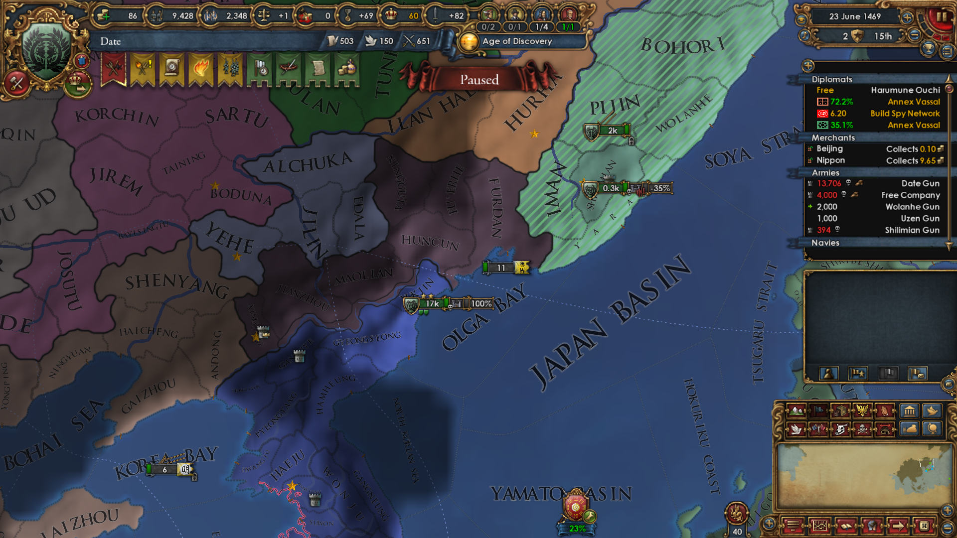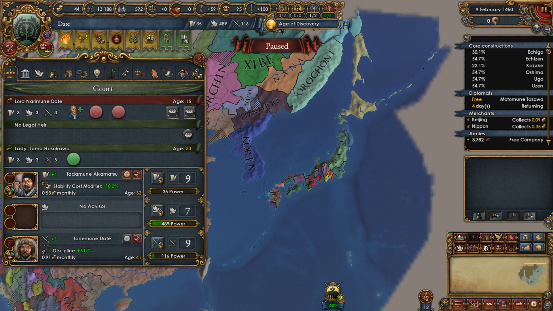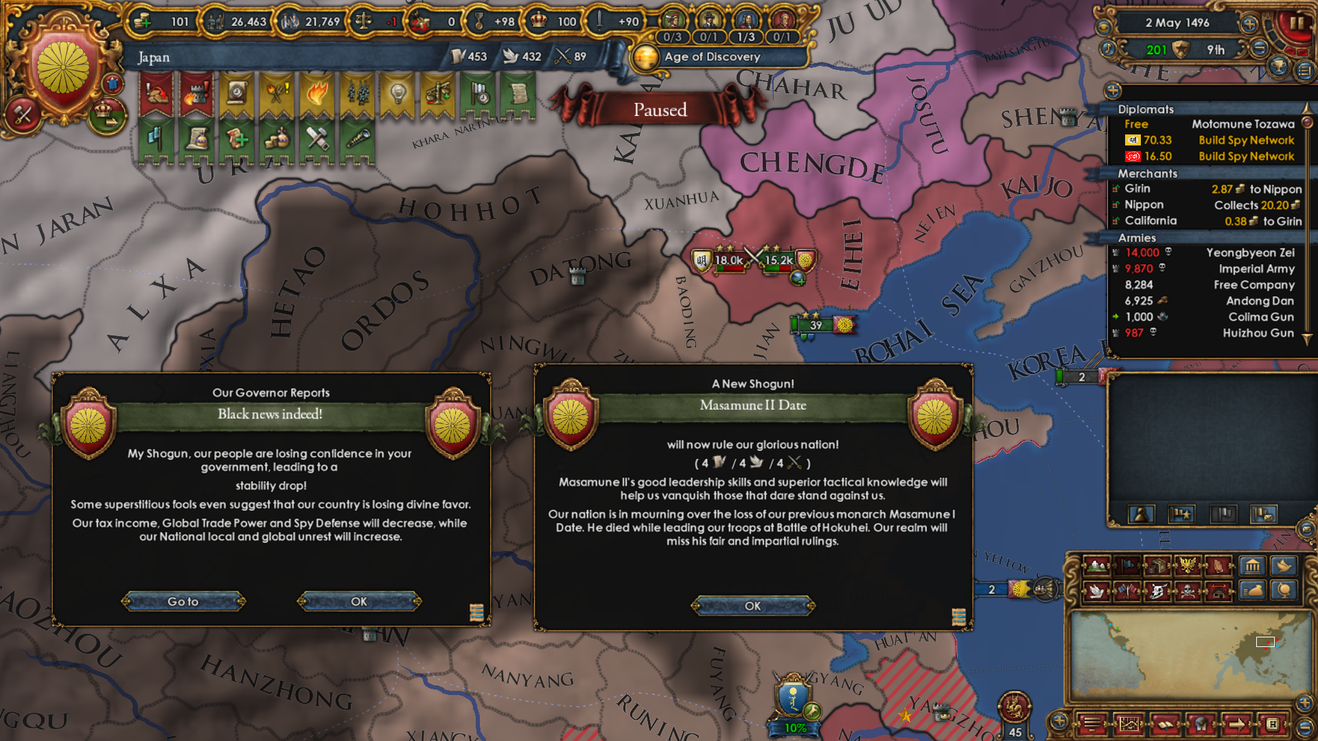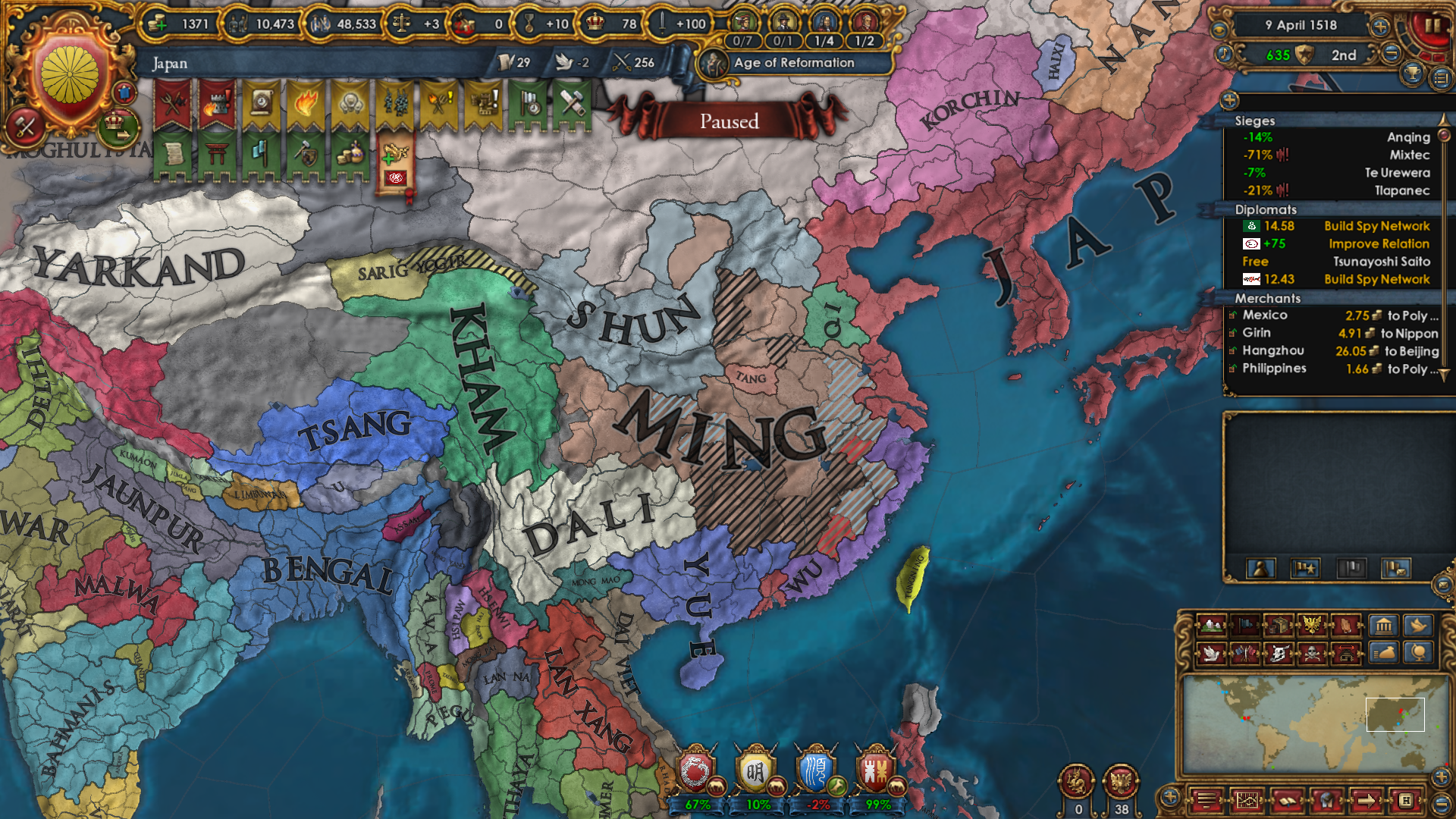 As for why I wanted to become Japan really bad: I wanted to attack Ming and the Shogunate is specifically disallowed from using the Mandate CB. The war with Ming had to happen in order to boost PP and not miss out on month +1 mana for too long. They're my only possible rival.