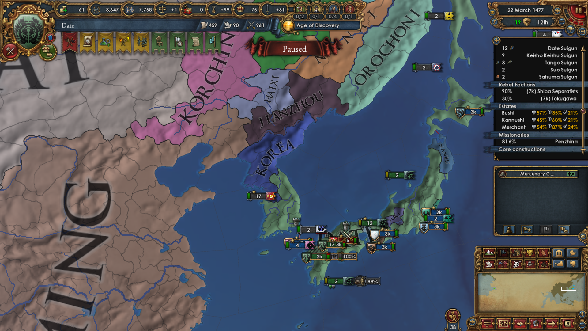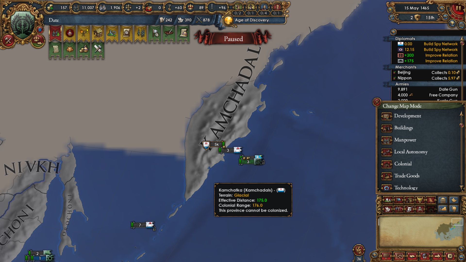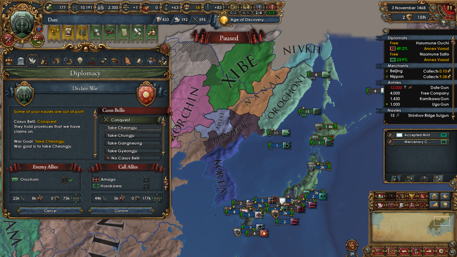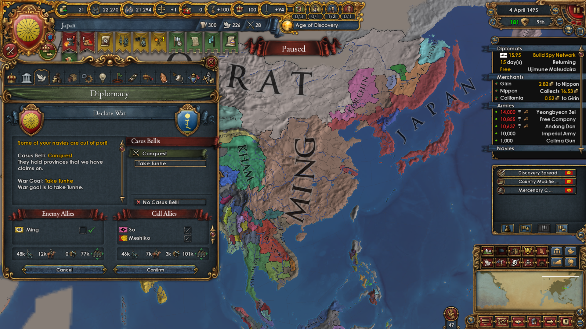 As for why I wanted to become Japan really bad: I wanted to attack Ming and the Shogunate is specifically disallowed from using the Mandate CB. The war with Ming had to happen in order to boost PP and not miss out on month +1 mana for too long. They're my only possible rival.