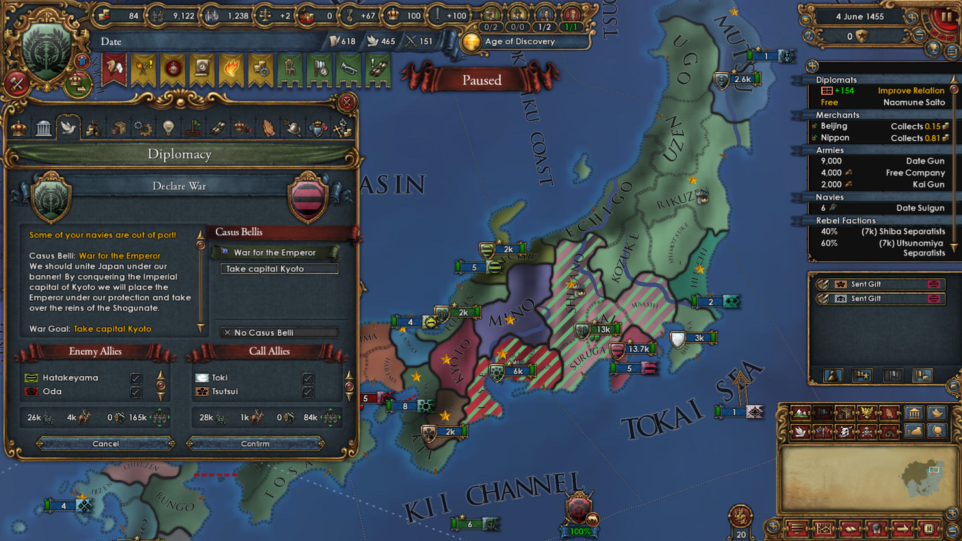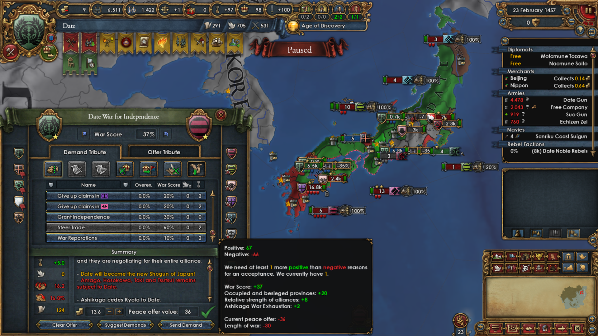 I had to go for a shitty peace deal because while I had the biggest daimyos on my side, the Ashikaga side had naval superiority and controlled all of Kyushu. Ashikaga just kept building units there even after I stackwiped their starting army of 14K and I was starting to run out of manpower.