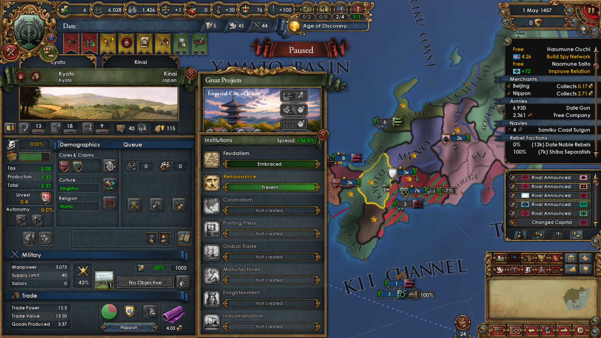 Ugh... Kyoto, the renaissance capital of the East...Thoughts on using expand infrastructure twice to make it appear here even though it already had 20 dev to start off with? I think it's going to be more worth it than starting with some shitty province in the long run because I get 40 dev at 0% autonomy and lots of income from silk. This also makes it so that it's not going to be useless to build a courthouse here later on.