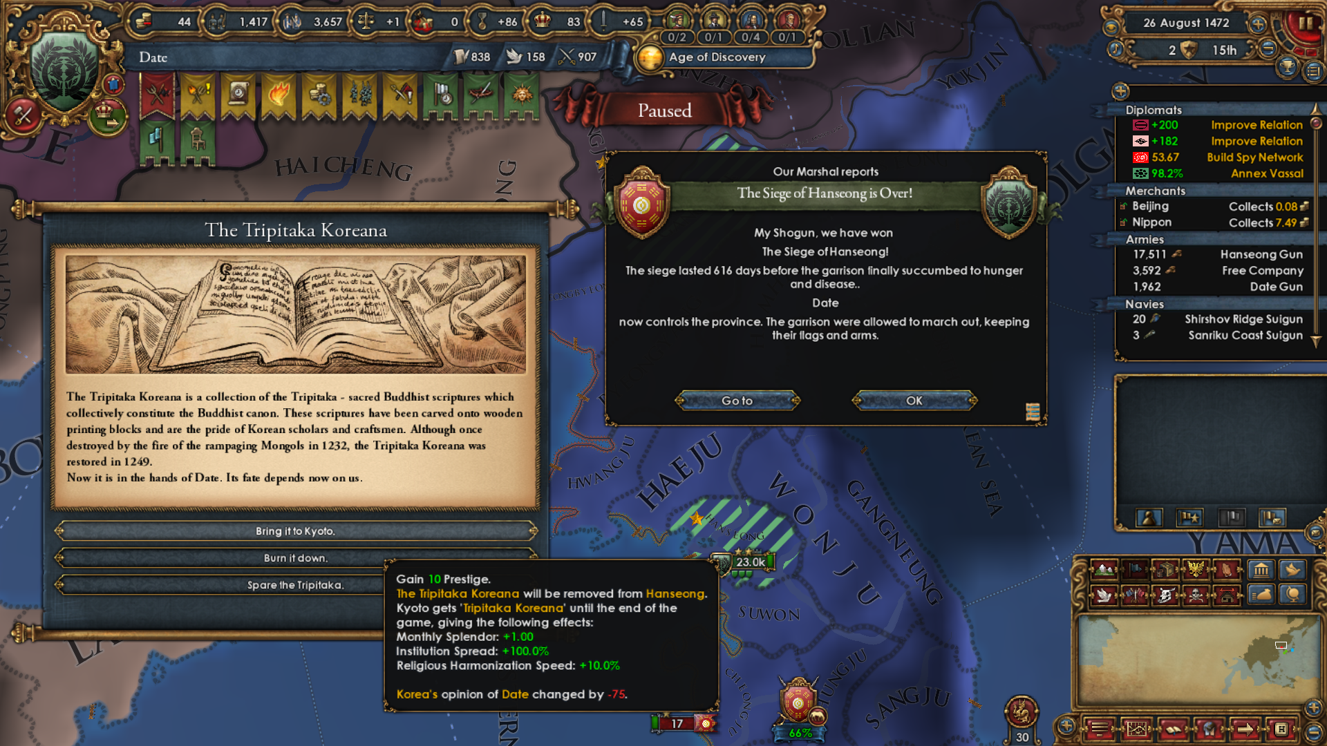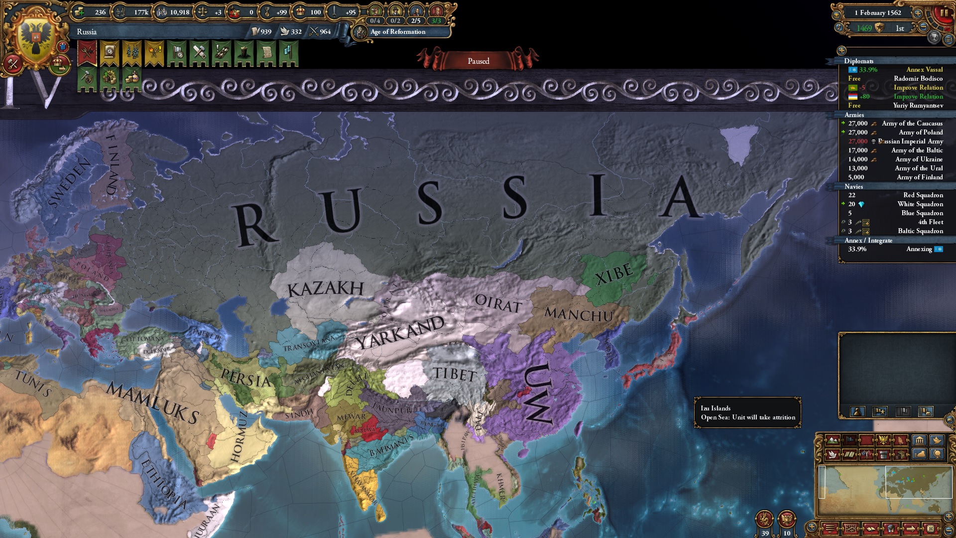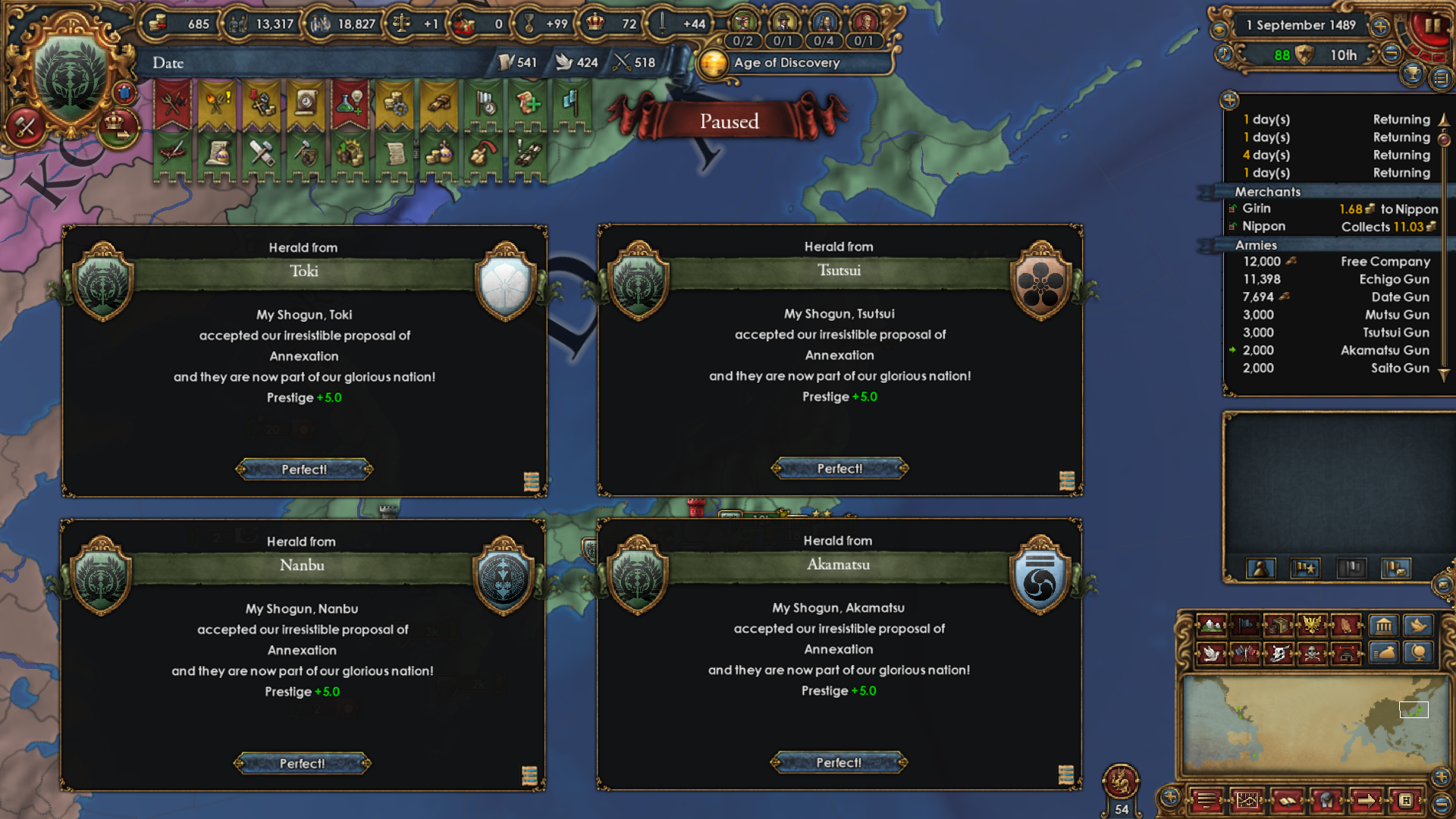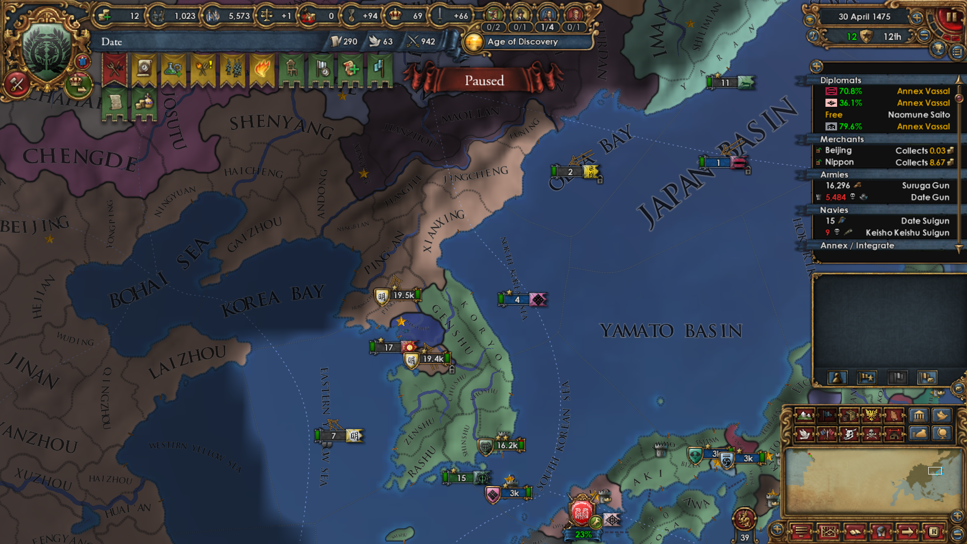 I diplo-annexed 5 daimyos almost at once to be able to take "Japan in United" decision quickly. Fun fact: if So becomes a pirate republic, you can pass that decision while they're still your vassal because they don't have the daimyo government type. Even so, they don't take a diplo slot after you become Japan. Pretty interesting.