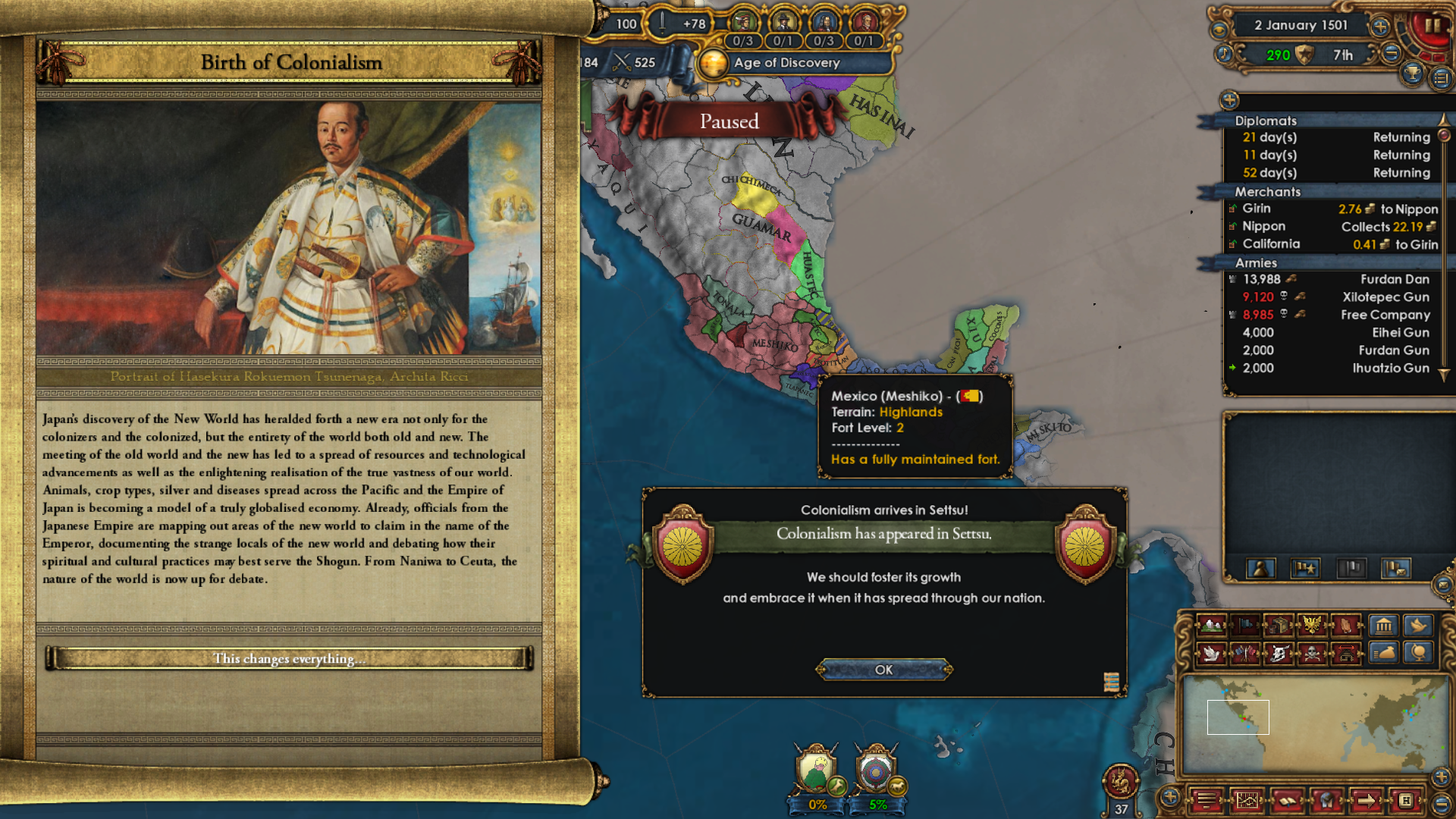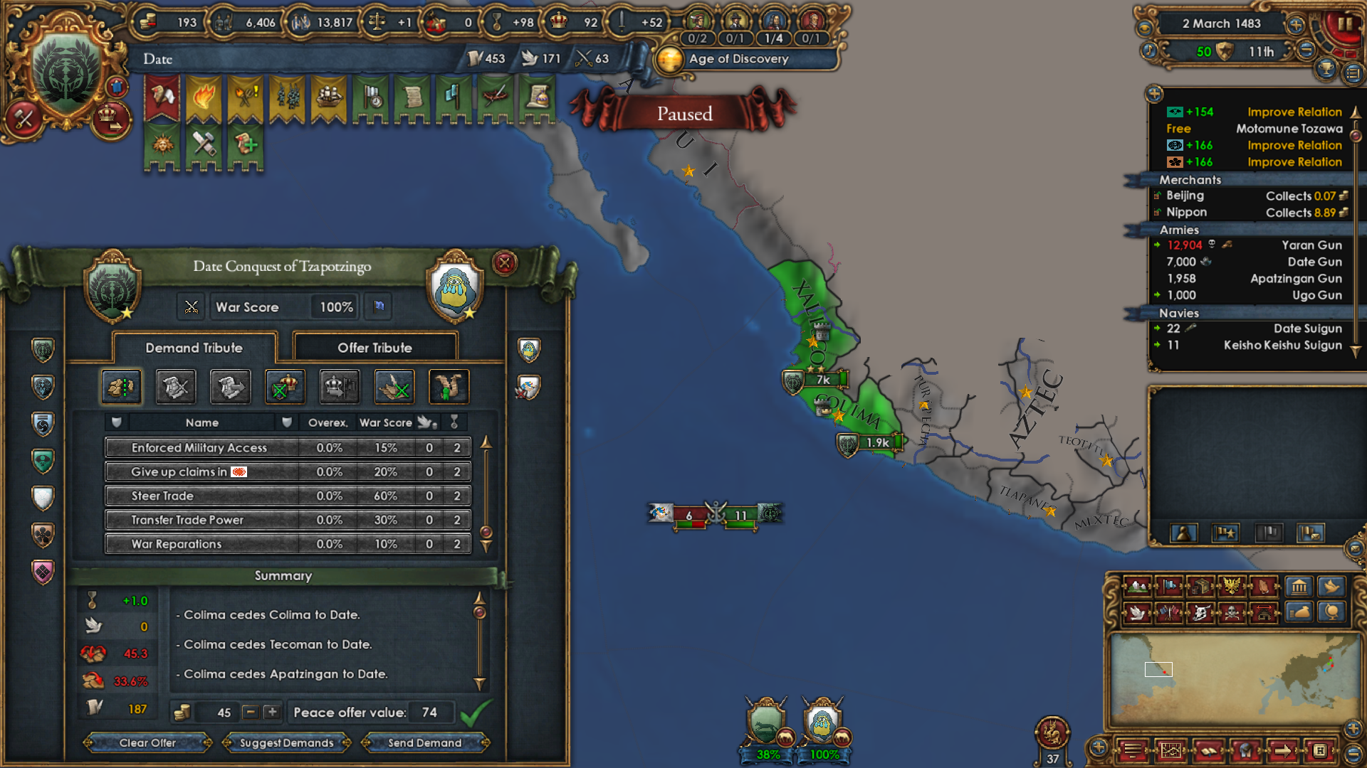 I also wrapped up a war in Mesoamerica in the meantime. I left them with one province because it was enough for my colony to get ten and give me a merchant and other bonuses, then I moved my troops back to Asia.