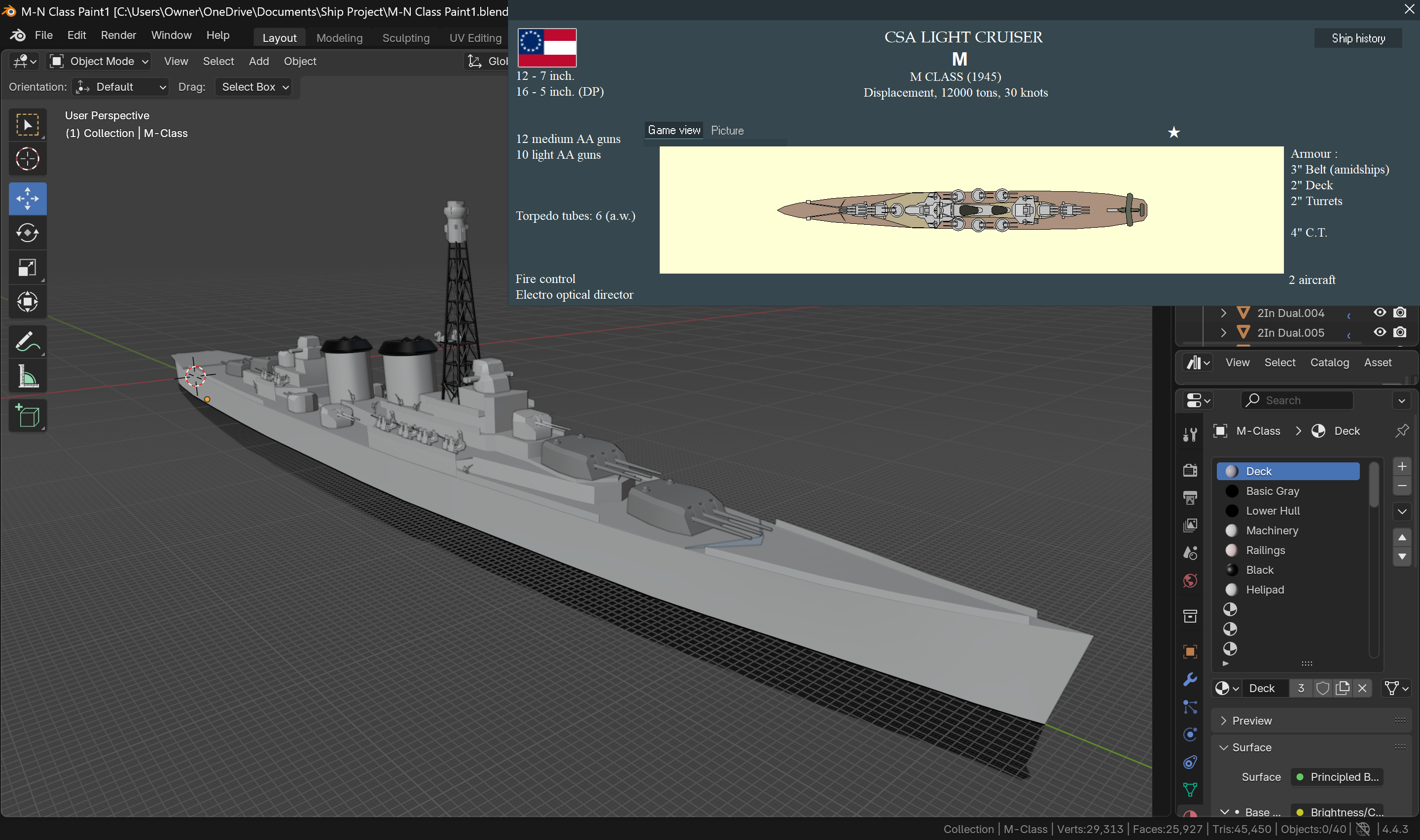 Like this one, an 'M-Class' Cruiser. A little save editing gets the 7" CL idea the Soviets tried during a similar treaty period I had in game. This is a follow on three previous class of 7" armed ships. Basically, I lost WW1, hard, got Versailles'd, then got a treaty event, and went as big as possible on that to mess everyone else up. It was the perfect time to try the "Medium Cruiser" idea, build them out as 7" Light Cruisers, accept the change to CA, then edit the design file back to CL. The idea sorta works, but was an interesting challenge. The H-I/J-K and L classes all had 9 guns, which hurt, so the moment I could, I went to 12. Turned out that was mid-WW2 in this timeline and likely too late to see service, but such is life.