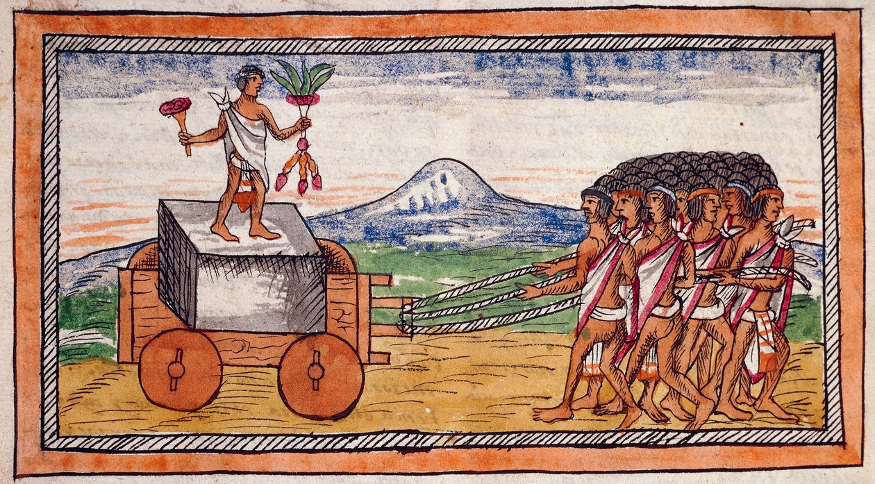 >>2319399>>2319415As I said, they seemed to have used wooden rollers, and used wheels with rotary motion in textile and ceramic production, but as far as using wheels and axels on full scale carts rather then just the miniature ceramic models? No, probably not.There are some depictions of wheeled carts in the Codex Duran (pic) and accounts which describe their use transporting monuments, but it's generally thought that this is more the result of Post-contact practices and technologies being retroactively applied to Prehispanic events. It's possible that they really did just use carts before contact too, but if they did it would have been very uncommon.As >>2319402 says, without draft animals, and especially in a region which is largely swamps and jungles in the lowlands and mountain and valley ranges in the highlands, wheeled carts simply aren't that useful over people using back mounted carrying frames. Look at transportation and logistics in Japan for much of it's history, they even had beasts of burden and still relied on human driven logistics for the most part.As for why no wheelbarrows, as I understand it, those show up pretty late even in Eurasia, and you need more complex wheel designs to support them and other devices that make use of wheels like water mills, and without an initial incentive to develop/use basic wheels for carts, they may have never had a reason to experiment with other uses and more complex wheel designsPart of that might also be because wooden wheels benefit a lot from metal supports to avoid splitting, and Metallurgy shows up late in Mesoamerica: Gold, Silver and Copper smithing only becomes a thing around 600AD, and Bronze was only smelted starting a few centuries before Spanish contact. The lack of wheels might also have been a reason why metallurgy shows up so late, because making those metal support bands for wheels was a major driver for the development and iteration of utilitarian metallurgy in Eurasia.1/?