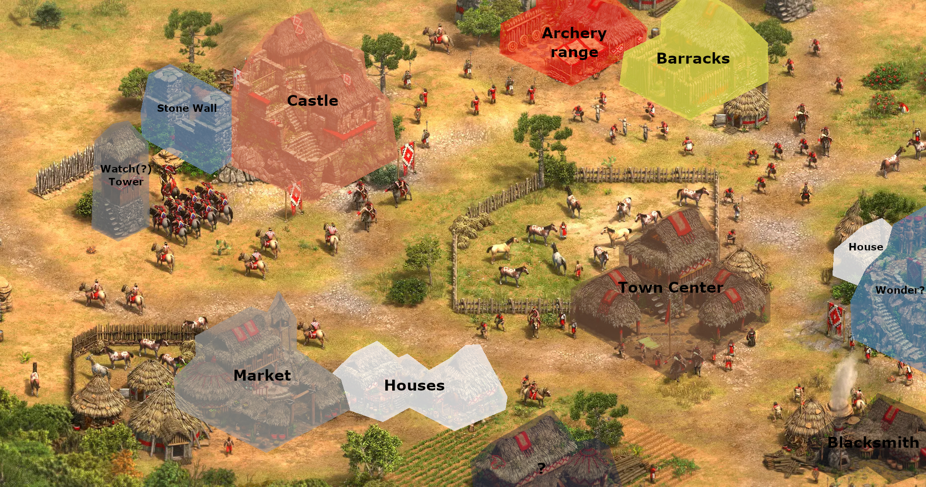 >>23252682 different ones from current age (and house or farm or town center don't count).The castle is special, it alone is enough to unlock.imp.So, for Feudal Age unlock, pick two from (lumbercamp, mill, mining camp, dock, barracks).Castle Age unlock, pick two from (blacksmith, market, archery range, stable).Imperial Age unlock, pick two from (monastery, university, siege workshop) OR build a castle.I don't remember how Krepost worked here.