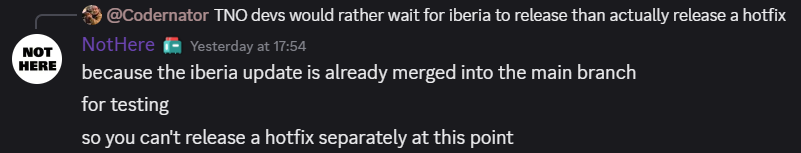 >TNO fails to release a compatibility patch as the mod enters its third month of being unplayable.