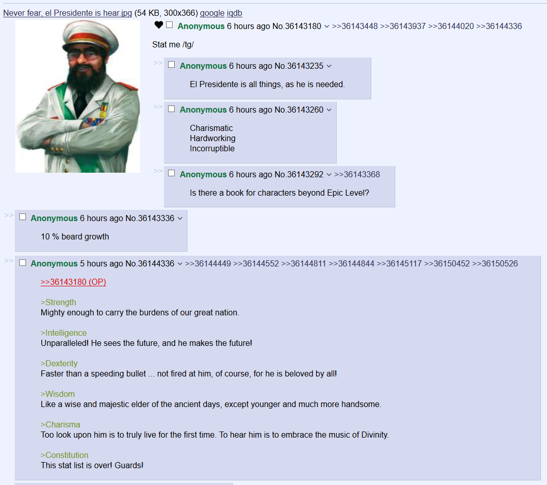 >>2334167Tropico 5 sort of tried to pretend you are not a single person with the dynasty stuff, but they were immortal anyway and it took away some character to have the traits split across 7 randoms.And in the story campaign everyone somehow lives from colonial to modern era anyway, twice.