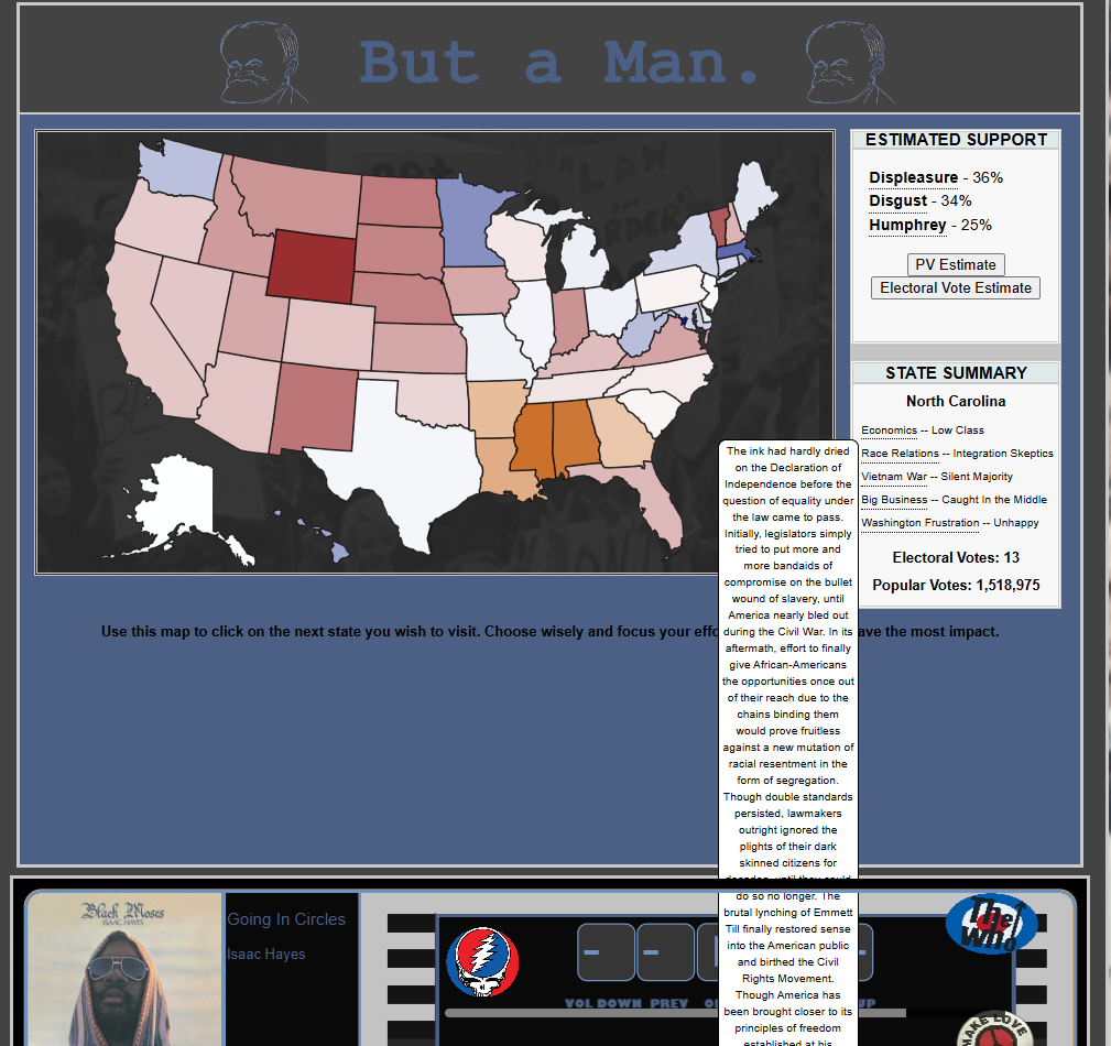 I feel like early 2025 spoiled me. TTNW, All The Way, Razistorija - all in quick succession after each other - it was just too good and now basically every other mod feels mid. Brianesque slop that's only worth a single playthrough especially. Year Zero was such a letdown, like what the fuck is the mod even about? Its supposed to be this feelgood lionization of Church, but all you get is a very boring basic campaign where you're told you got aura, but its all tell don't show. Like, it feels they wanted to make a "fuck the deepstate mod", but were too shy or lazy to make an incumbency sim about Church, which could have had great potential. And what of 4 More Wars? What does it bring to the table that W. didn't? Howard Dean? Its still the same "Spam Ohio and barely win" campaign as dove Kerry. Sure, its better in replay value than Year Zero, but then my mind just wanders back to Good For Me, a mod by a complete unknown that btfo's all this shit while staying at the same tech level. And don't get me started on how uninspired the OSTs are becoming, especially for post-2000s mods.