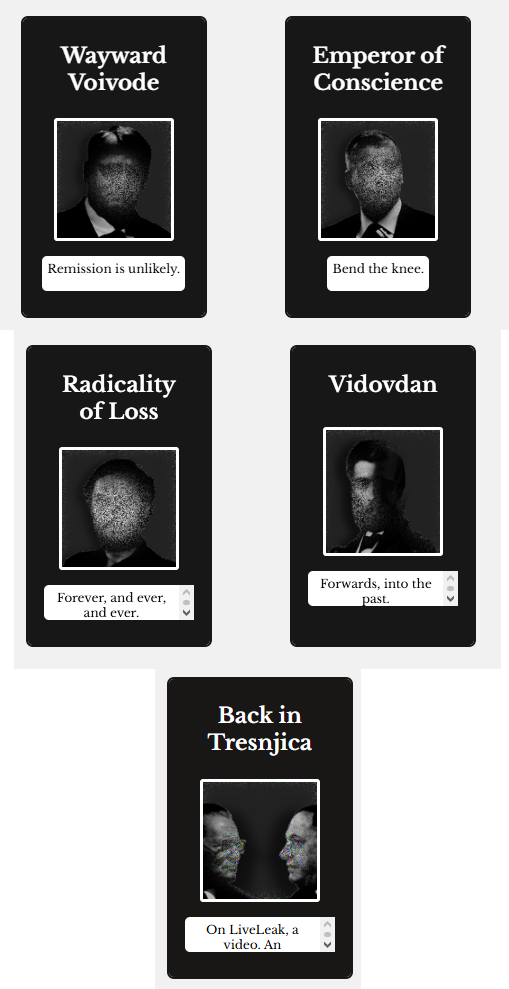 >>2352992I don't remember the exact order they appear in, but;1. Dodik - VP: Zoran (obviously)2: Tito - VP: Moša Pijade3. Dobrica Ćosić - VP: Dejan Medaković4. Putin - VP: Medvedev (degenerates into an old orthodox icon of the Theotokos)5. Rudy - VP: Huckabee (degenerates into Epstein-Maxwell)I think that's that.