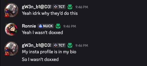 >>2353880>>2353971It wasn’t Agreeable, the members who were allegedly doxxed said as much and they got ran out of the server for clearing it up. The actual doxxer was imfakeithink