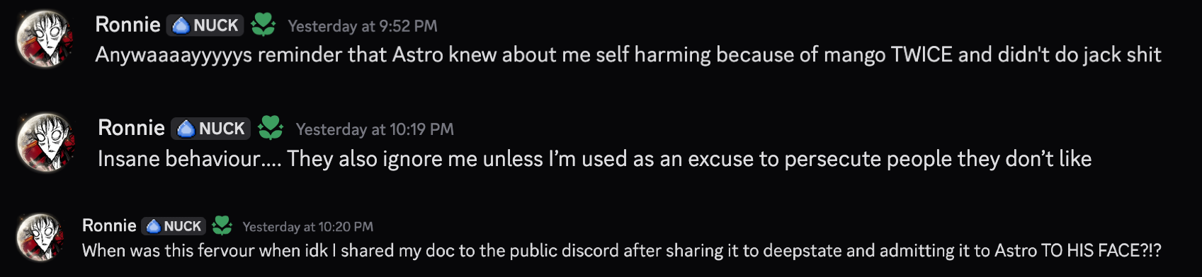 >>2353271Not op but it’s an open secret Lurker (the 1824 guy) has said sus things about the age of consent and other things of that nature but is allowed to remain in the community discord (despite other people getting banned for much less) and even work with Astro on his mods, that’s the only thing I’m aware of unless mango is doing more with underaged girls than just making them cut themselves