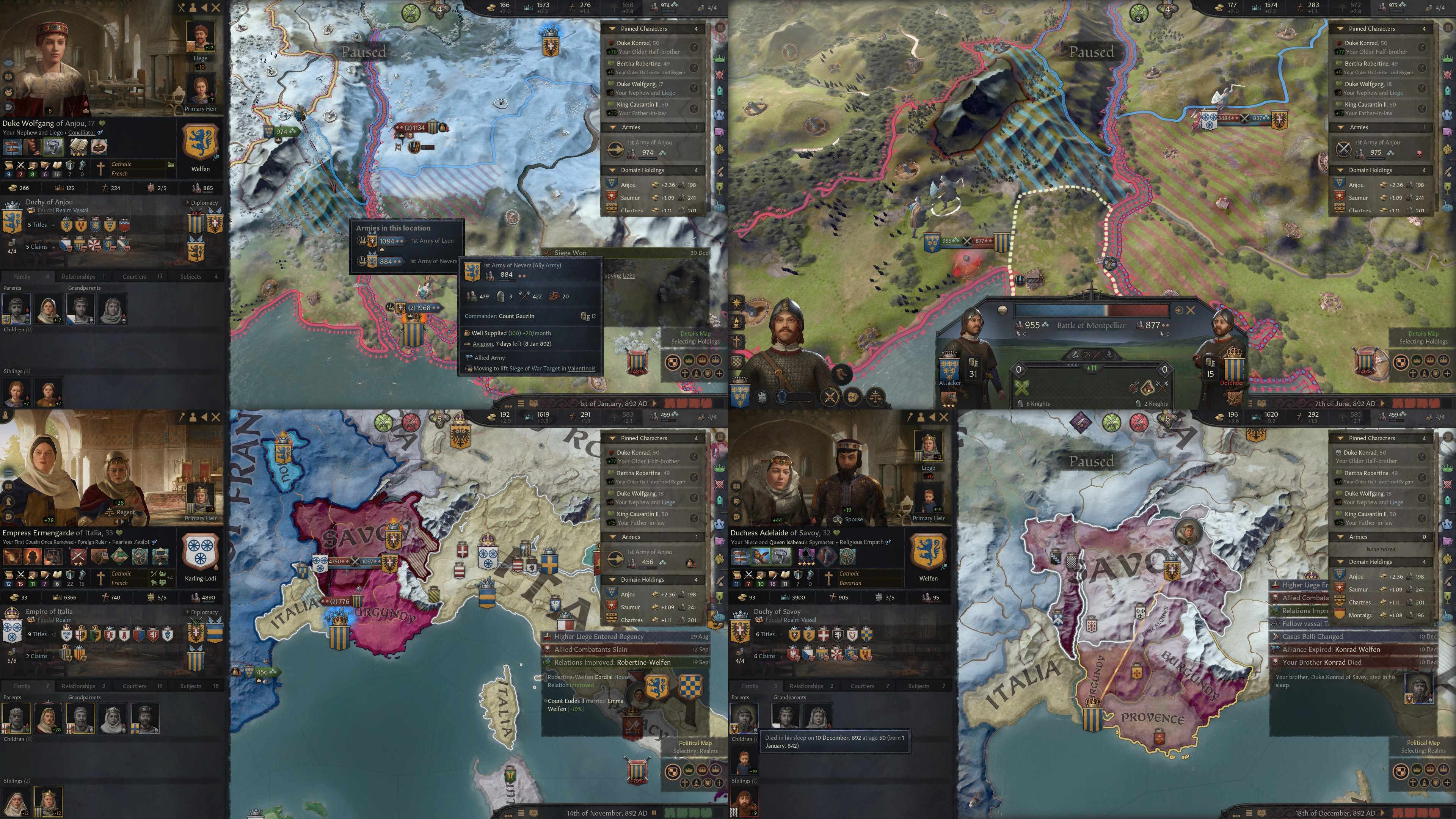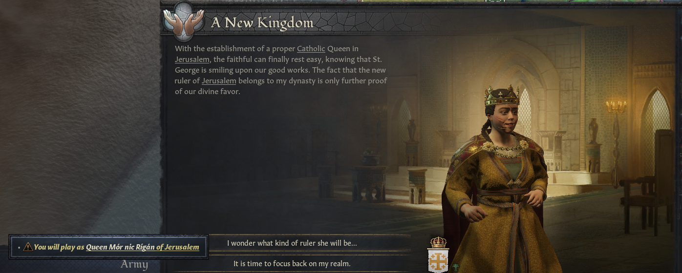 >>2368396Well in the end I indeed had to give up my kingdom although I kept my actual holdings, but between the debt I accrued foolishly trying to hold it off and my now weakened position I decided to take this option to play as this insteadI find it weird the person I sent was the one chosen to have Jerusalem itself since I had little contribution in the end, I started a siege I left before it finished, but I guess maybe since I got there earlier than everybody else I got given more scorealso surprised they allowed a woman to take this role