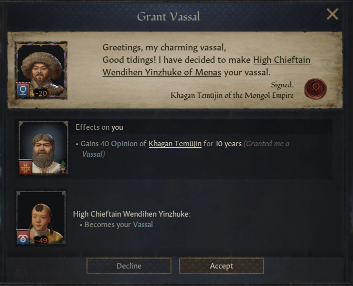 >playing in ainu lands>think I am safe from the mongols>suddenly see them swarming my one remaining neighbor realm, shit myself and then instantly do the decision to submit to him>later try to have a look at schemes against him and notice an assassination is listed as very easy>remember that he made me his spymaster when I submited to himMan this is tempting, historically his empire fell apart the moment he died right? will the same thing happen here?also i'm a little confused, where does the game actually list my position, it's not even in my characters memories