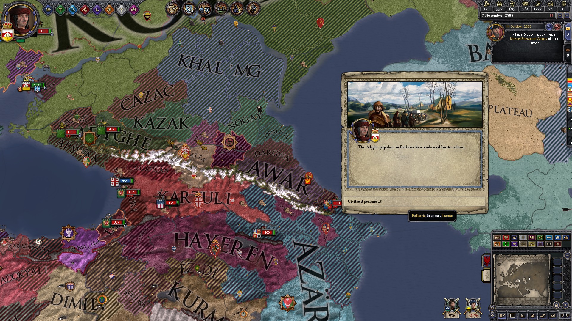 >attempt an eastern european tribal run>eastern europe is almost completely taken by nomadic hordes in a few decades>be the only significant tribal leader left in the region, with a decently sized kingdom and a tribal army of 8k, 1.5k of those being light cavalry from my retinues>vassal khan of neighboring horde attacks>4.3k army, 3k being light cavalry and 1.3k horse archers>let them siege a few provinces and rally all my troops in favorable terrain>they attack>despite superior numbers and favorable terrain, my army is FLATTENED>5k dead on my side, 700 on theirs>they regenerate at a rate of 200 per monthI ragequit and deleted my save.