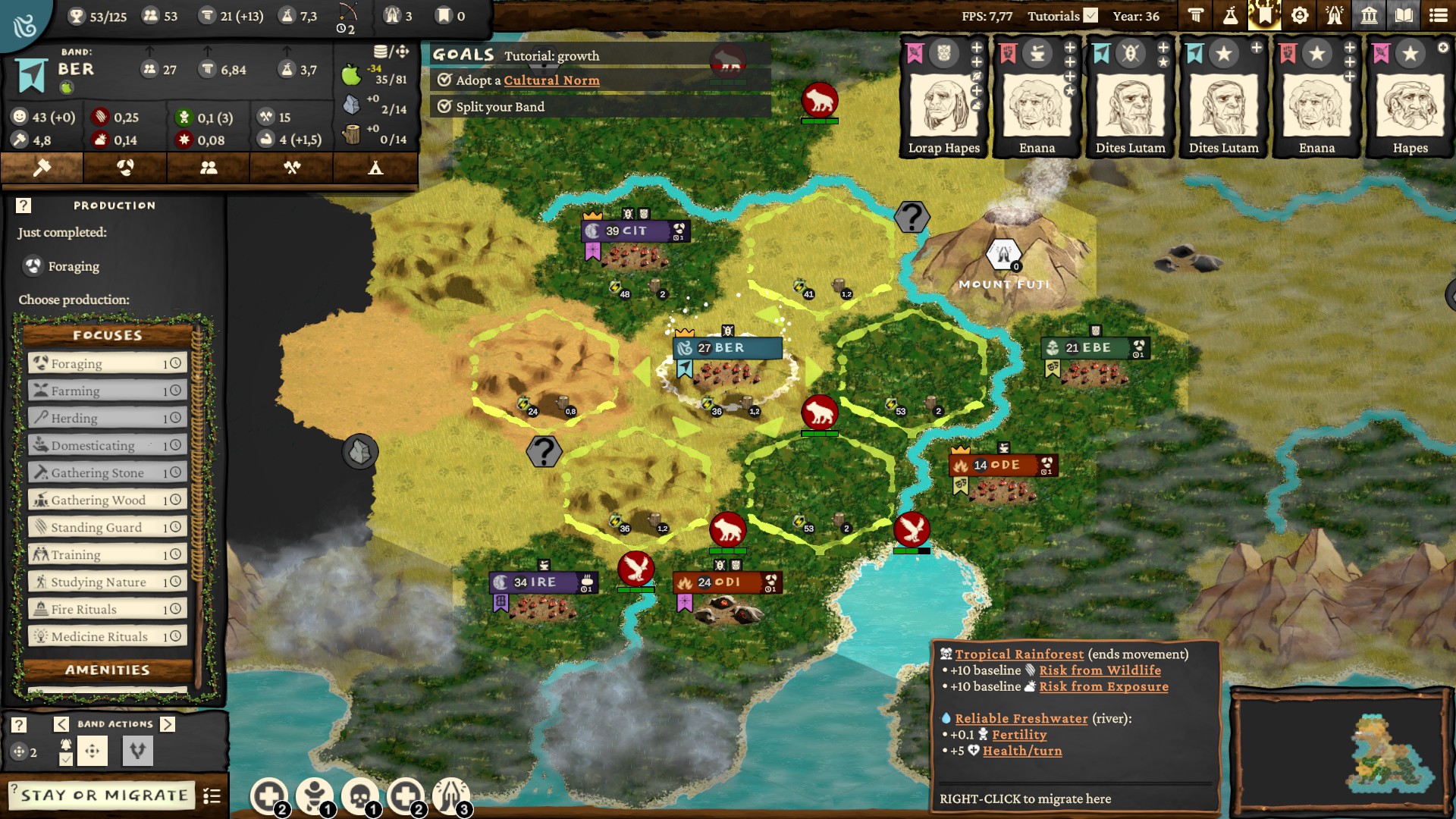 And in a nutshell it's Civilization set in the stone age up to the early bronze era. Staring as hunter-gathering tribe and advancing into either settled down farmers or nomadic pastorals. This said it's quite different from Civilization, most apparent it has a smaller scale. Not just in term of eras but also size of your "civilization". Each person of your population has name and stats, each can get sick, wounded, participate in events or get assigned higher role. When you're foraging you get to choose specific species to hunt/gather and you might even fuck up ecosystem by taking too much. Buildings actually stay on the map and you can abandon them. Pretty fun game. Although I'm not quite the fan of auto-battler combat.