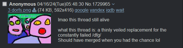 >>2362094Autism and thread ruining faggotry.he hates actual drawfags and kept trying to split the thread or bait flamewars with /rwg/, which is why to this day they still have an asshurt line about df in their general's OP.