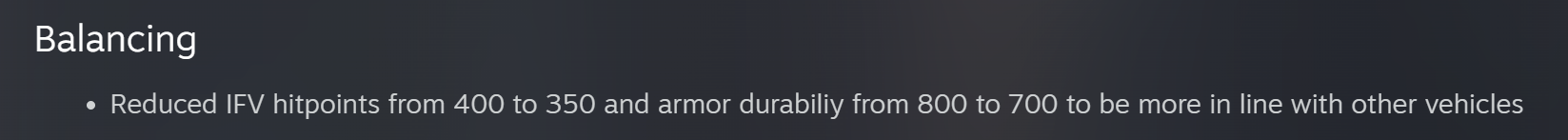 >IFV nerfed>It was already considered not ideal due to it's priceMore proof that endless nerfs makes for shit games.