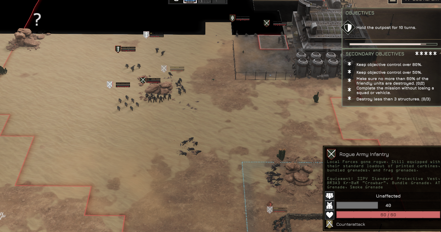 Making camo less overpowered without upending the current system is pretty simple. Make it only apply when the unit is hugging cover or while moving to cover, otherwise the user gets a fat +0 to their concealment rating. Darby can be that one exception in that her skill is a flat +2 in any situation. This targets the concealed scout creep strategy in wide open areas. The planning map should be more detailed about the terrain features and easier to read if they do this however.