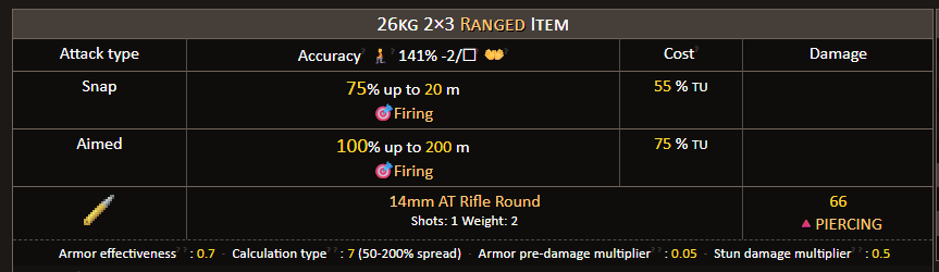 >>2366738Found your problem. The 14mm AT rifle has a 50-200% damage roll spread, meaning that it cannot do a 0% damage roll. It will always hit at least 50% of its' specified damage, unlike the 37mm.