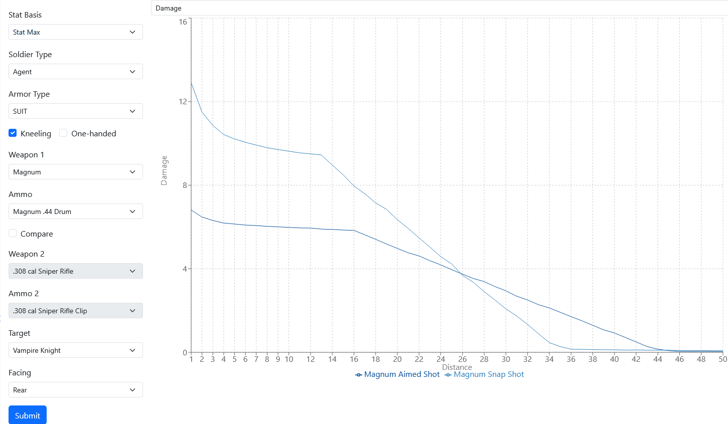 >>2366346If they appear too early they're basically invincible and will kill your entire team by itself. Since it's a melee creature you can cheese the Xcom pathfinding AI by creating a wall of fire. However, you need to be careful, it will cross fire if there is no gap in the fire-wall, or if it is on fire itself. Promotion II weaponry is a realistic minimum, the BlackOps sniper rifles just need to hit enough times, while a minigun will kill him easily.>>2366490While this story sounds good when you put it into words, the reality is very different. You get a real average of 4hp from the front and 8hp otherwise. Throw in agent's accuracy and that it's a 90 TU monster and you will see that engaging it with magnums is suicide for an entire team. Here's what the gun profiler (https://xcf.trigramreactor.net/master/gunSim) says, under ideal conditions. The graph with front armor is even more dire, it might as well be invincible, and it's not going to be appearing conveniently surrounded by you. Chances are you're either clustered (very bad) or in a gunline (better, but still bad), and you won't be making any side hits until it's very close, and then it will hit your gunline, and depending on where it hit your gunline and which way it faces, let's just say on average half your team can't hurt it. In fact it will outrun the agents behind it when it runs forward chopping up the gunline that is in front of it.