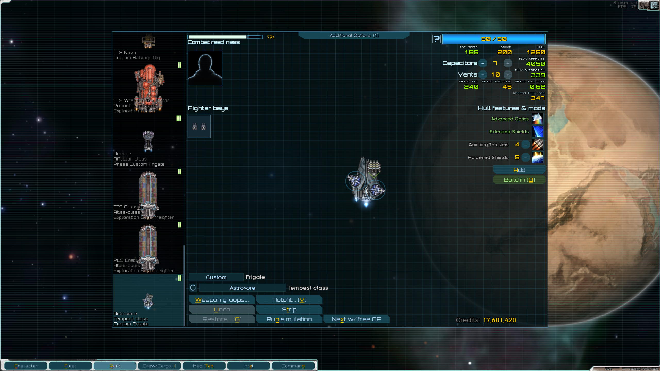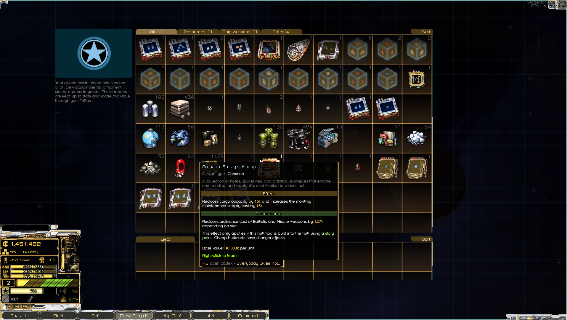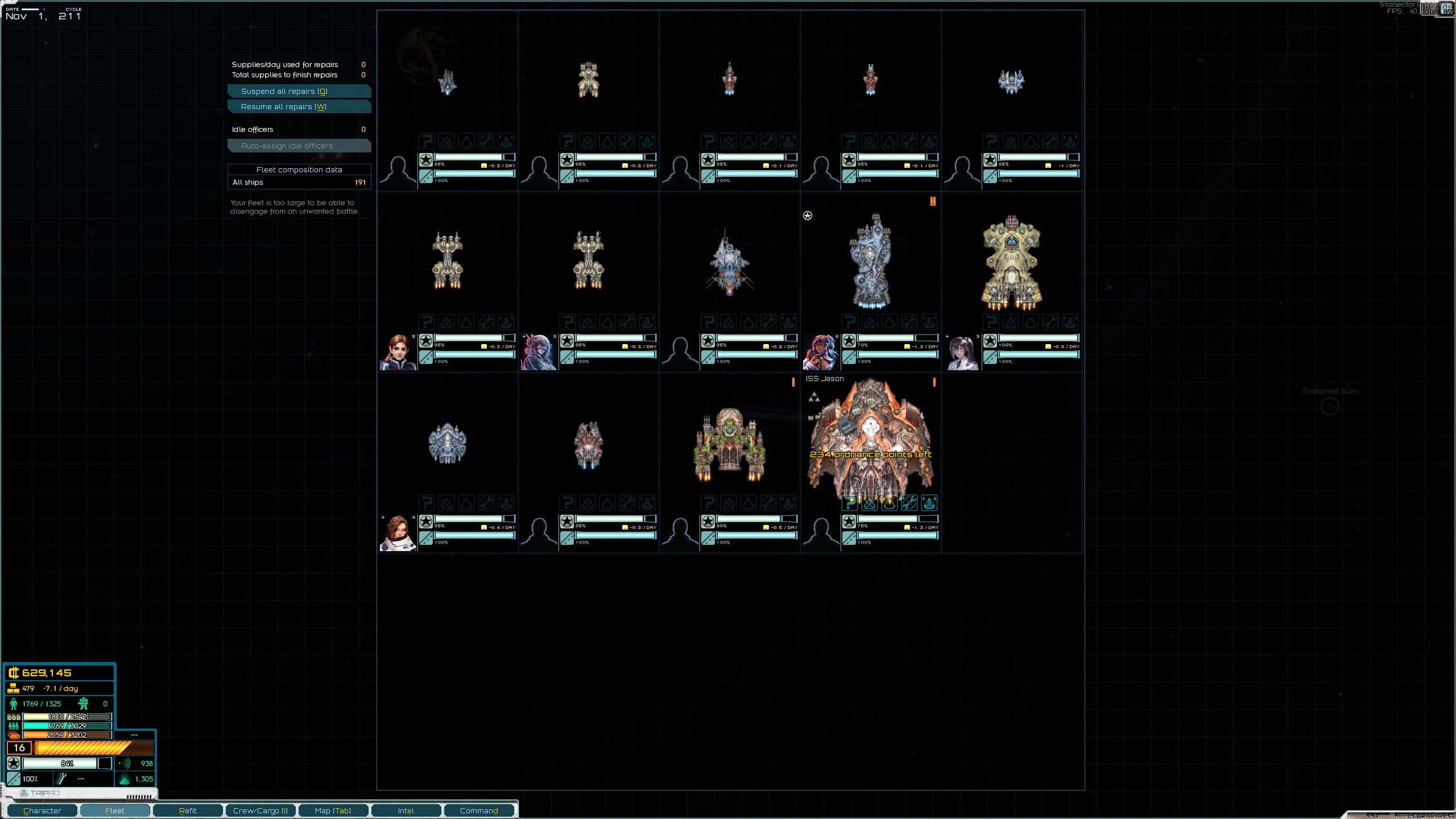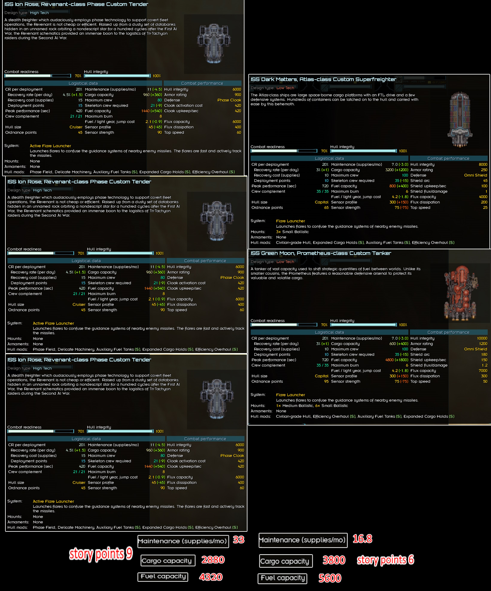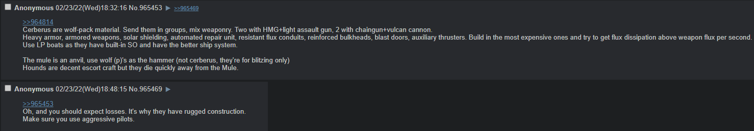 >>2359394>Nah, if you have the capitalI have about 1.3 million so I'm good there -- is that just for constructing the initial buildings on the colony or is there something else you can do with it?Main thing I am worried about is my fleet not being big enough to fight off any of the big crisis fleets. I have never seen them before so not sure how scary they are. This is what I'm working with right now, not sure how it would stack up. Not pictured is a Monitor and an LP Brawler, and also two XIV Onslaughts I have stored in the core worlds. My colony is also 30 ly away from the closest core worlds so resupplying and refitting in an emergency would be inconvenient.I was also curious, I have a commission with the PL and am at 65/100 relations with them. Does that affect the crisis in any way?