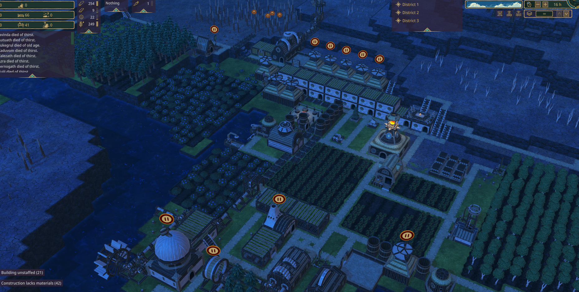 >>2365061Try to unlock and build a large wooden water butt as your first thing to build with gearsIt helps to have one big barrel>too busy buildingI like to set my pumps and farms to the highest priorityUnfortunately it's very easy to death spiral regardless, as you're fighting1) dehydration and starvation removes work speed buffs (and I think gives you -50%?)2) beavers stop pumping or harvesting to drink a thimble of water or crumb of a carrot the other side of the district, ironically continuing the water/food shortage>lotsa science buildingsYou should consider researching decorations like roofs to cheaply improve your beavers workspeed, runspeed and lifespanIt doesn't give you more beavers to do more jobs but I'm reasonably certain all jobs are completed faster, so you get more science, more power from running wheels, and faster plank making>district 1, 2, 3Whatcha using all those for? Are two of them backup districts that just grow carrots and pump water?I really don't like districts because it's like I'm building colonies in parallel that need all the same amenities, jobs and food twice over, and special logistics jobs on top of that, but that's just me