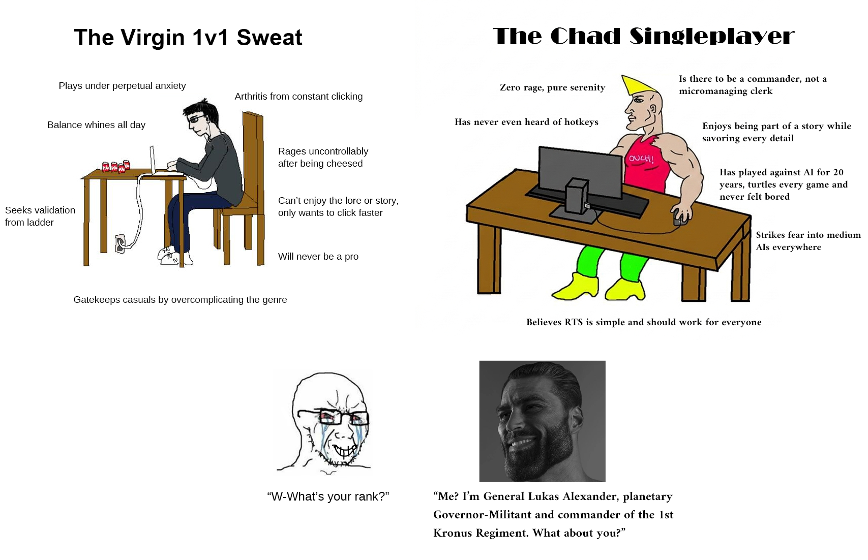 >>2365447All TAlikes have maximum IQ and testosterone. Maximum micro, maximum macro, maximum tactics, maximum strategy, maximum everything. Starcraft, warcraft and aoe are either only micro or only macro. They are pathetic compared to the Gods of RTS that do anything and everything simultaniously.