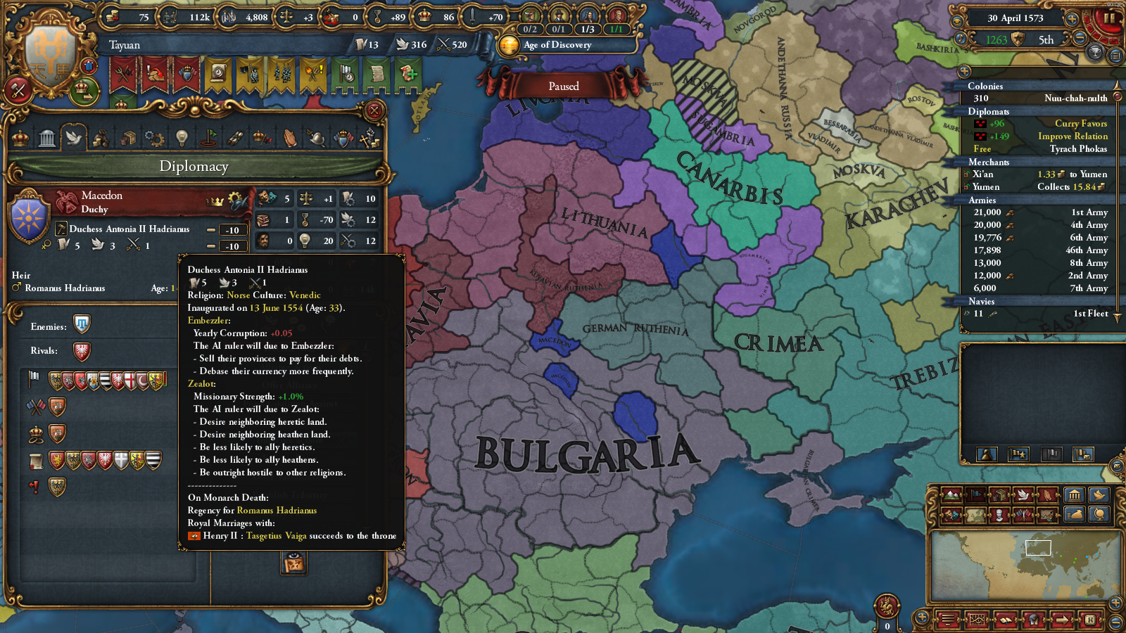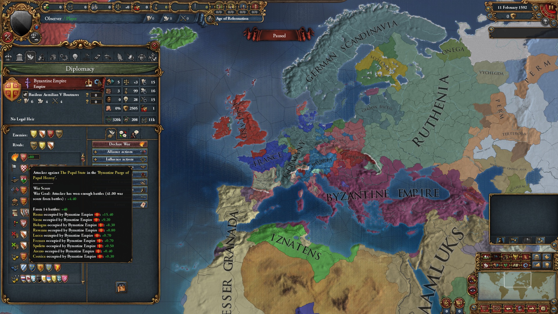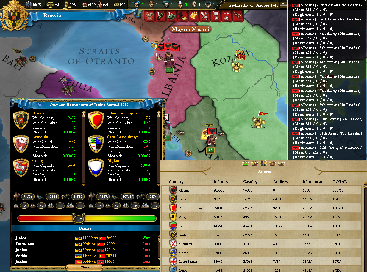 just played vs ottomans as russia, nothing unusual, except albania, while being catholic, was somehow allied with the ottomans. That would have not been a problem. However, some bug caused the albanians, consisting of one 20k pop province, to gain 300k soldiers (i have 164k, ottomans have 158k). I wonder if it got something to do with the skandenberg events. Well, time to reload.