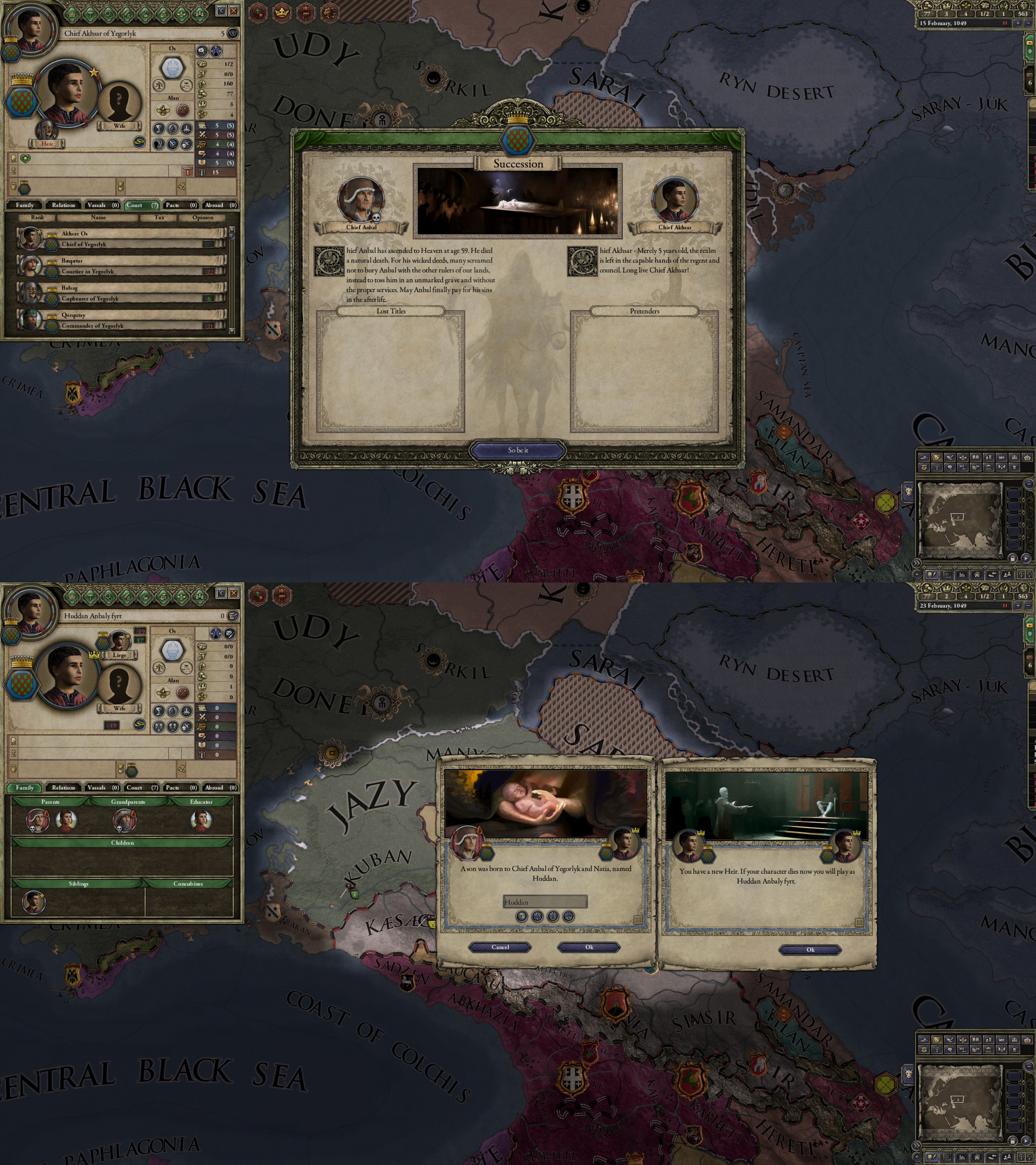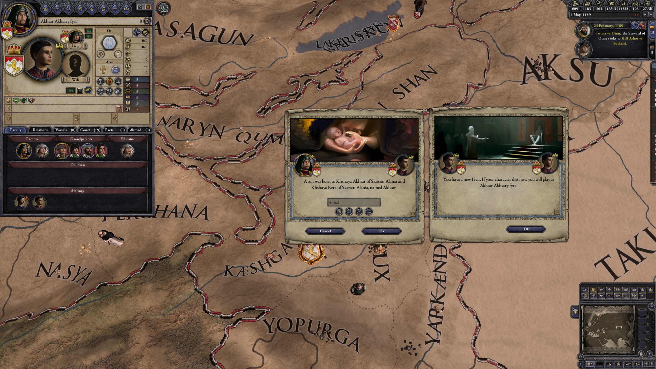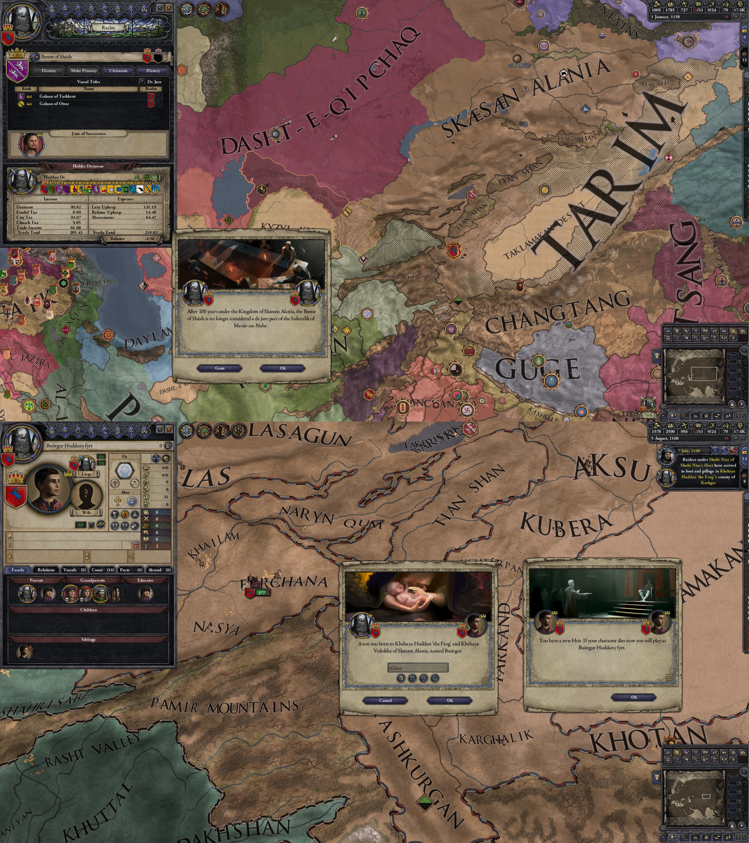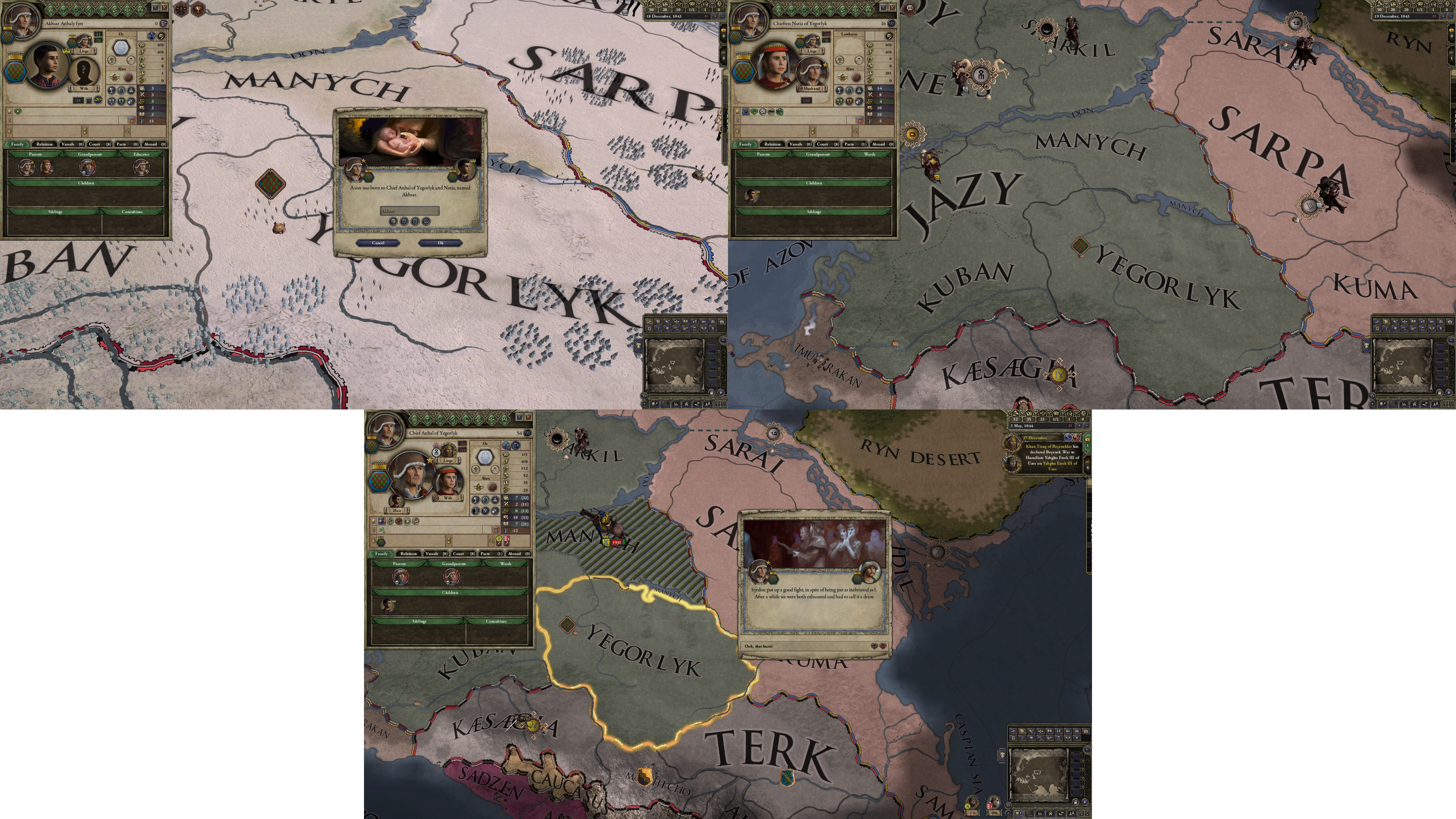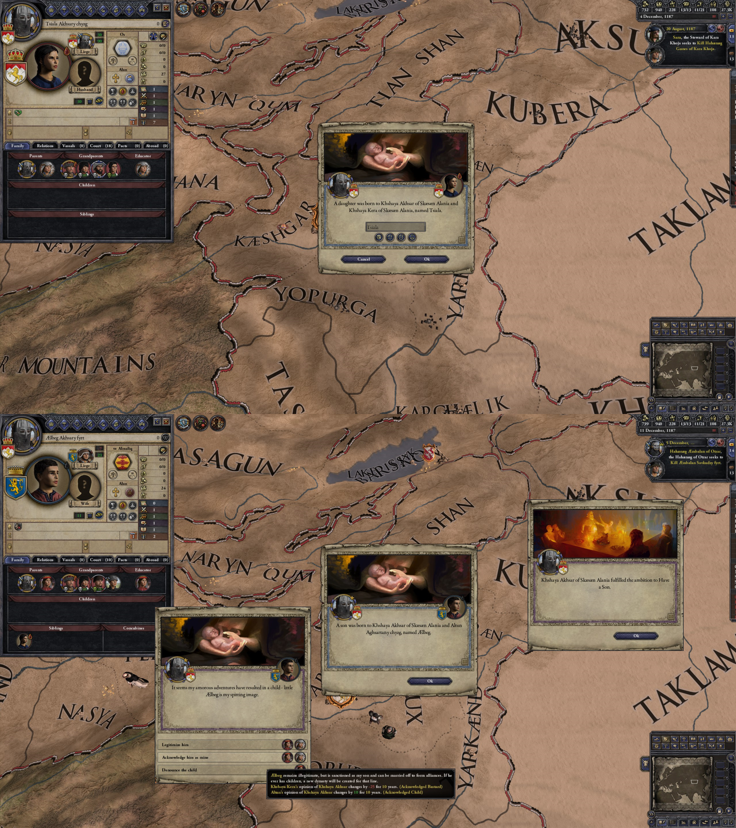 However, not long after, news reaches the capital that, not even a week later, his mistress Altun had given birth to a son by him. The boy, Ælbeg, is acknowledged as his own, much to the outrage of the barely-postpartum Queen.