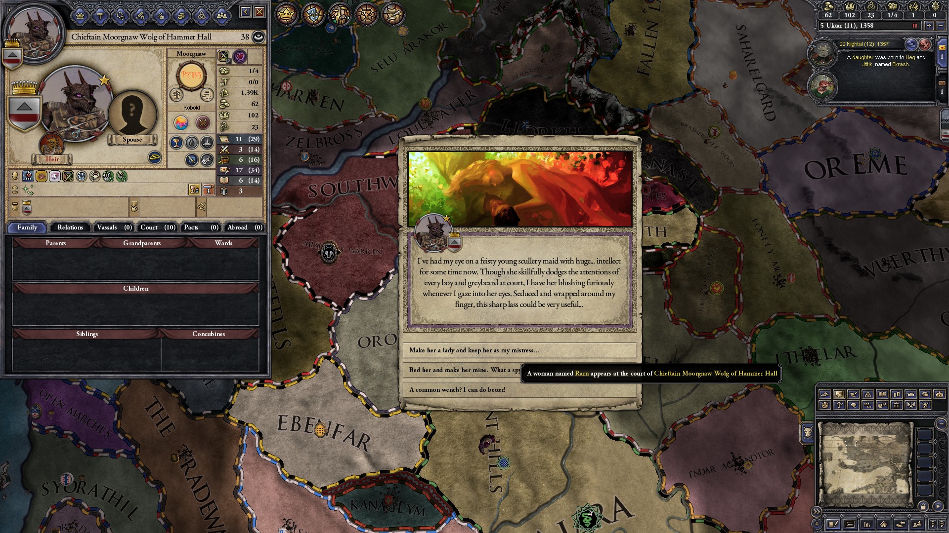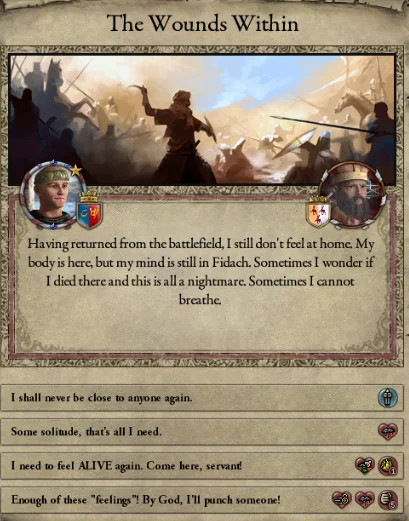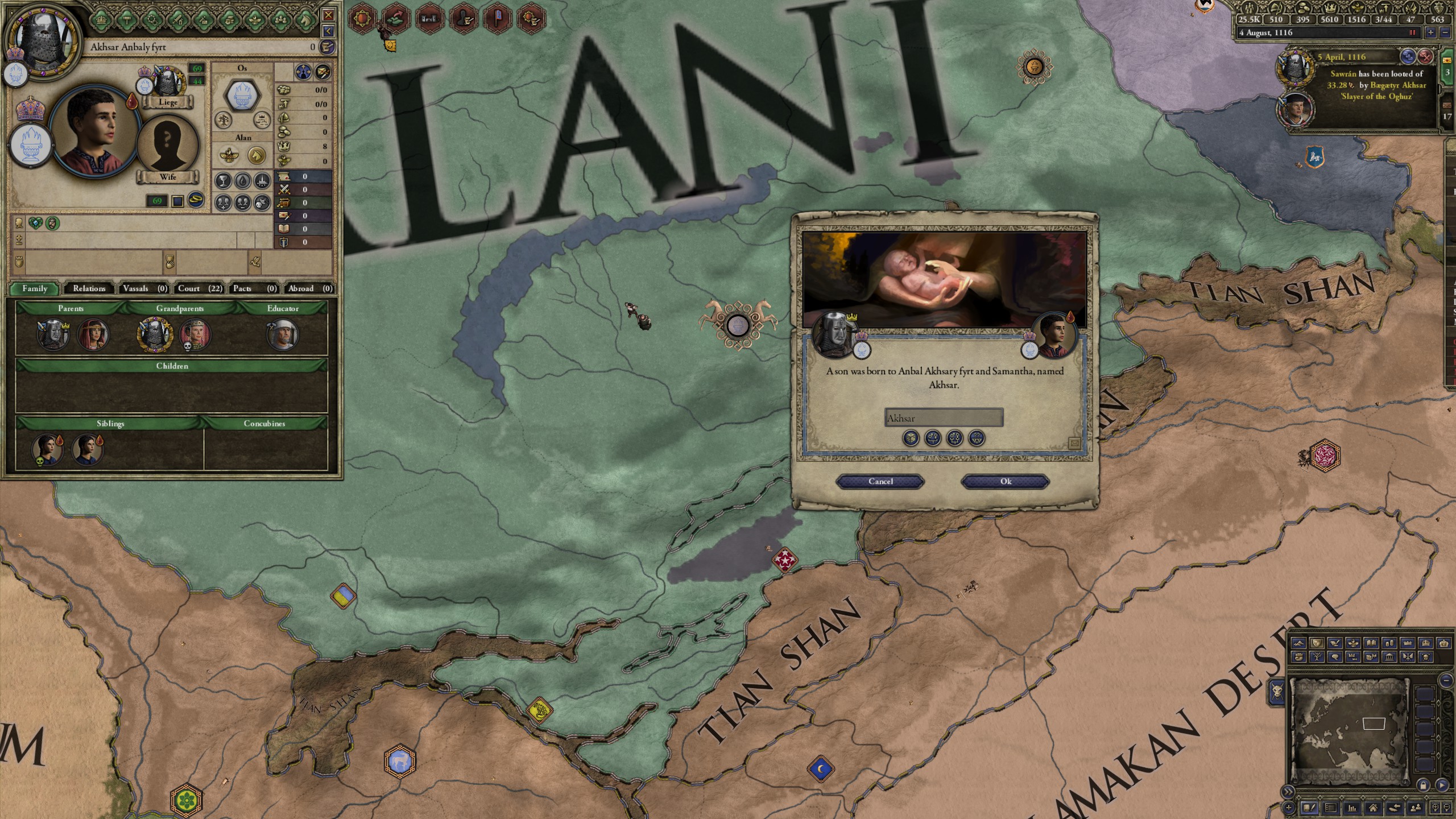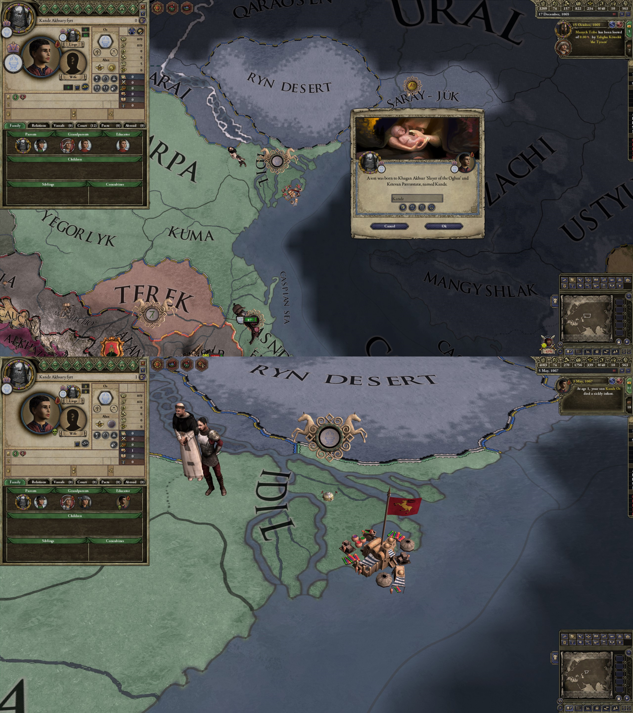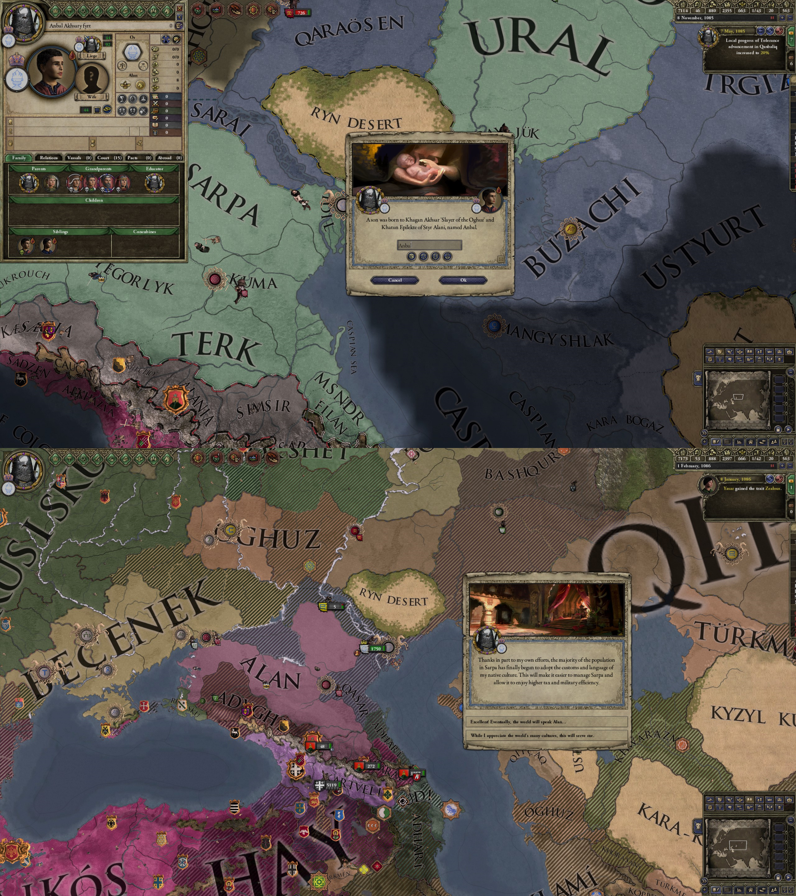 However, not long after, news reaches the capital that, not even a week later, his mistress Altun had given birth to a son by him. The boy, Ælbeg, is acknowledged as his own, much to the outrage of the barely-postpartum Queen.