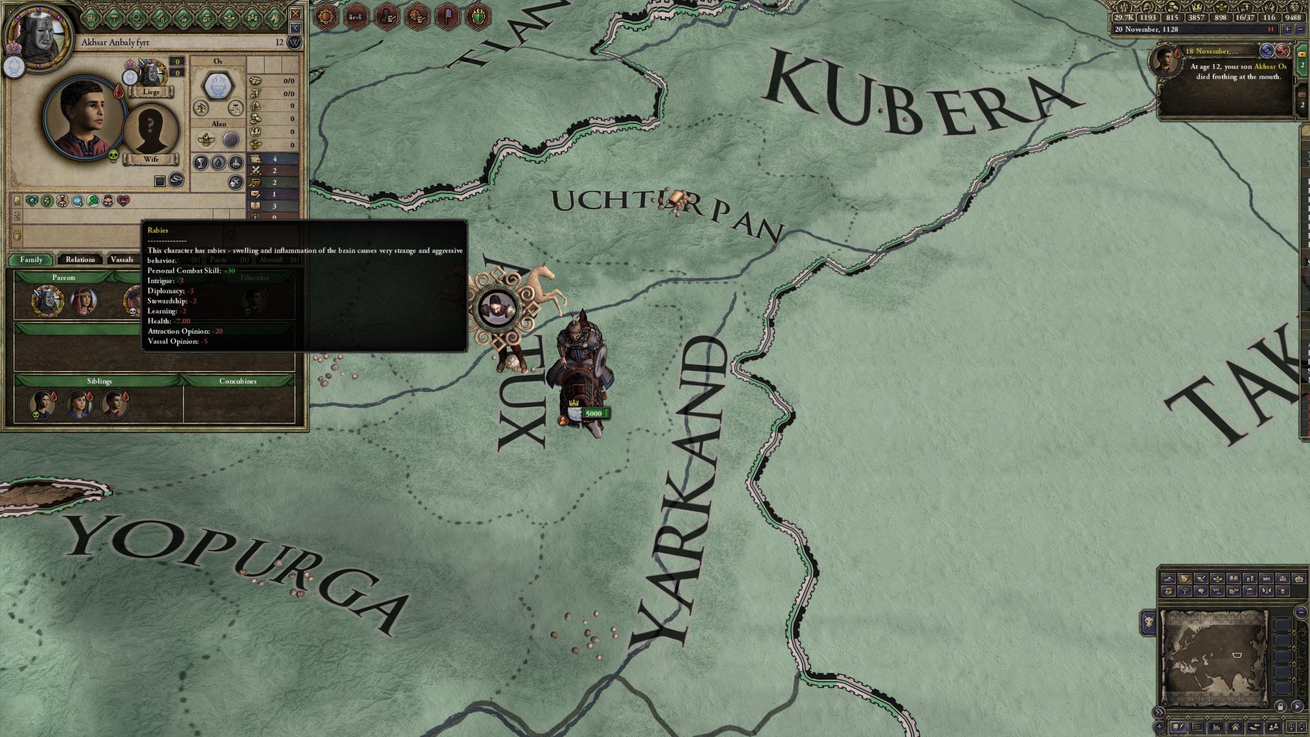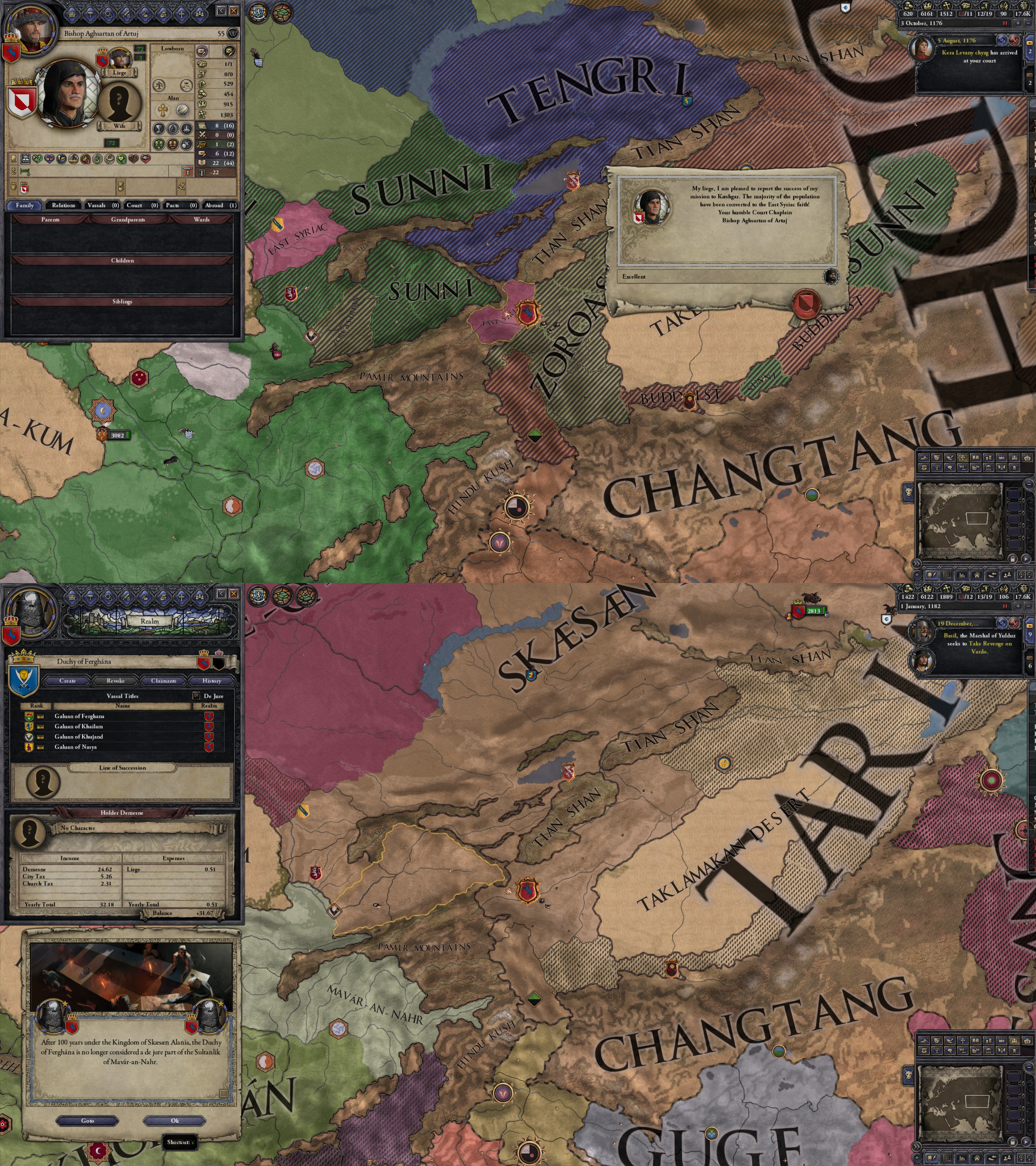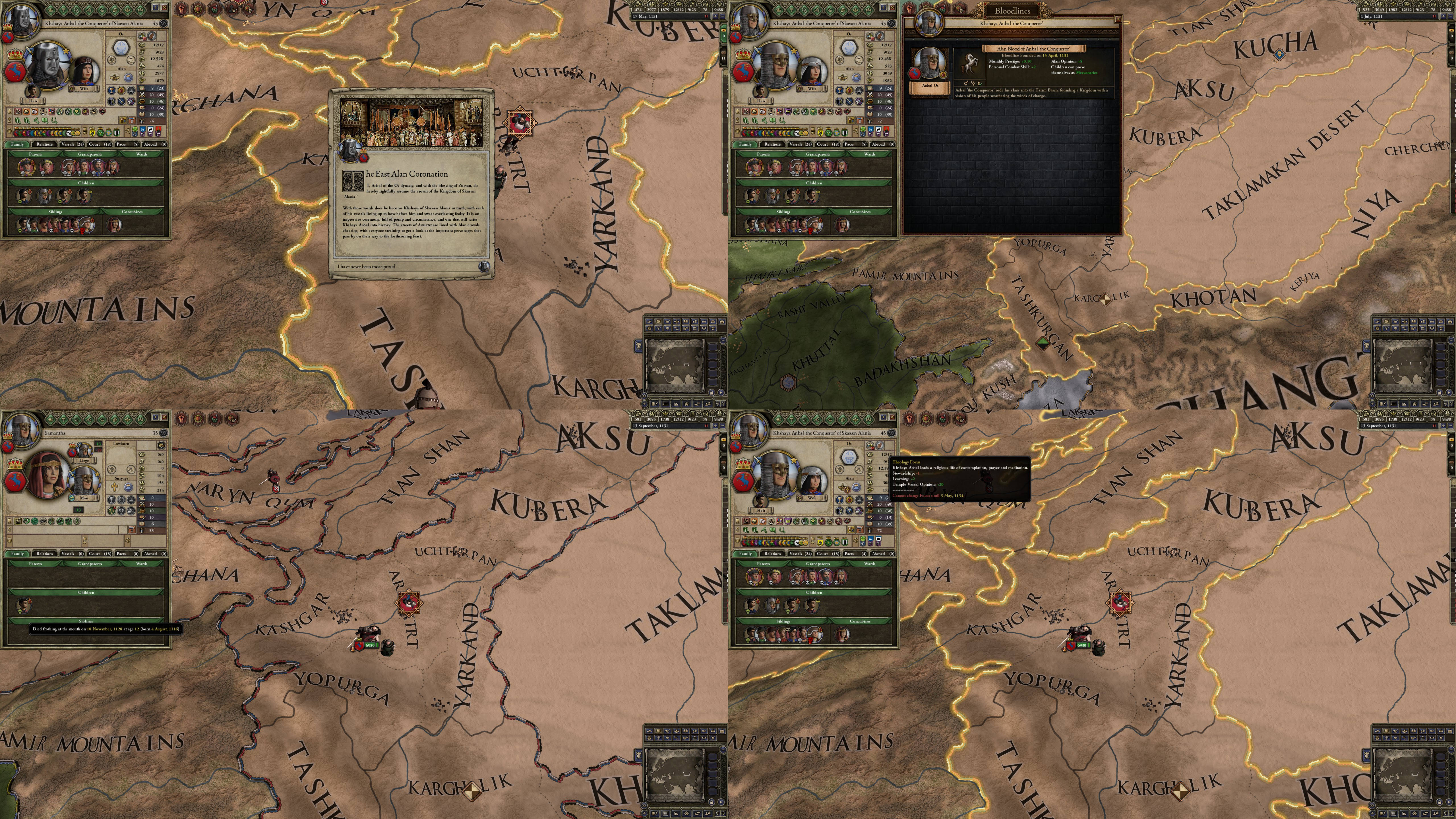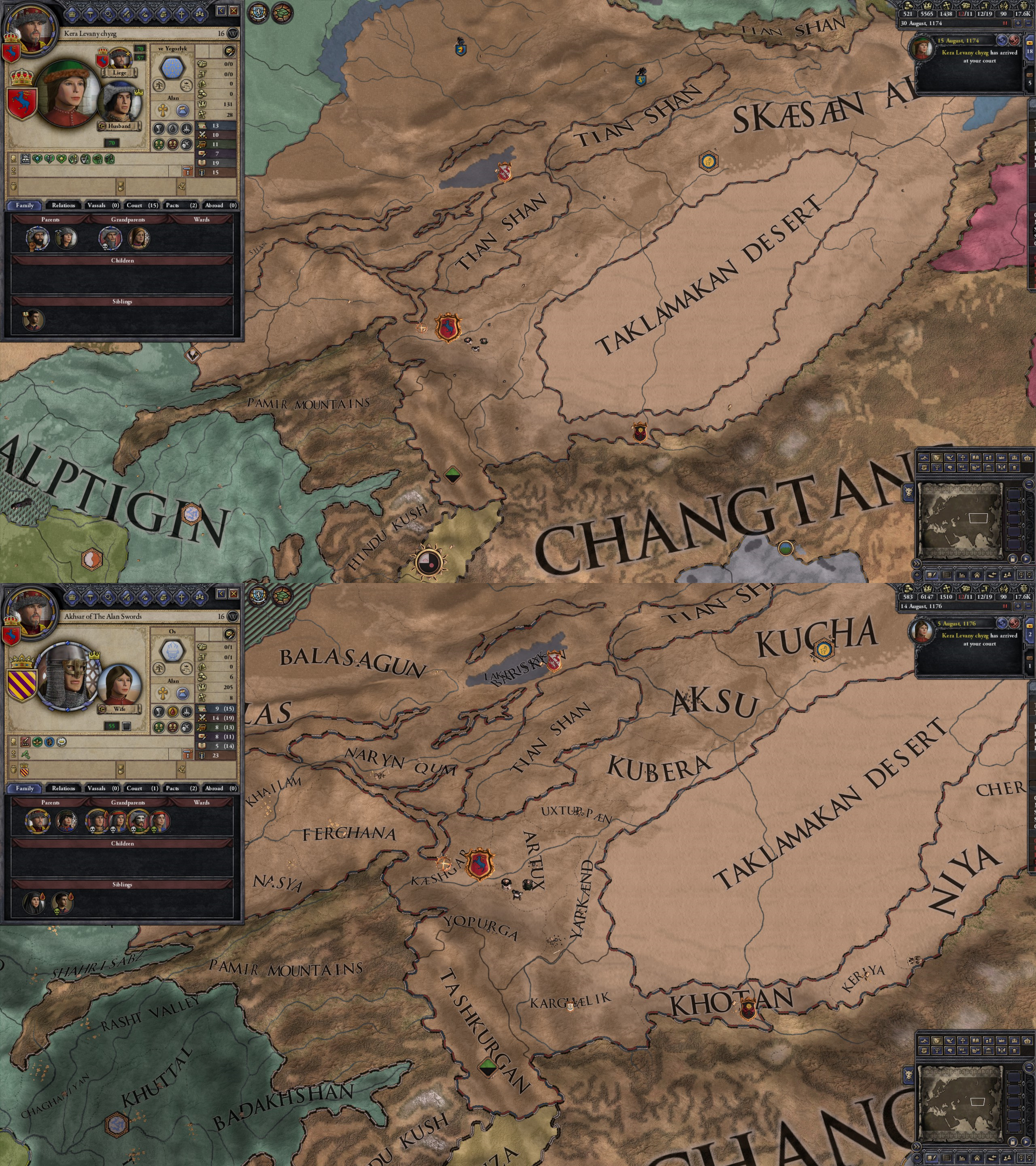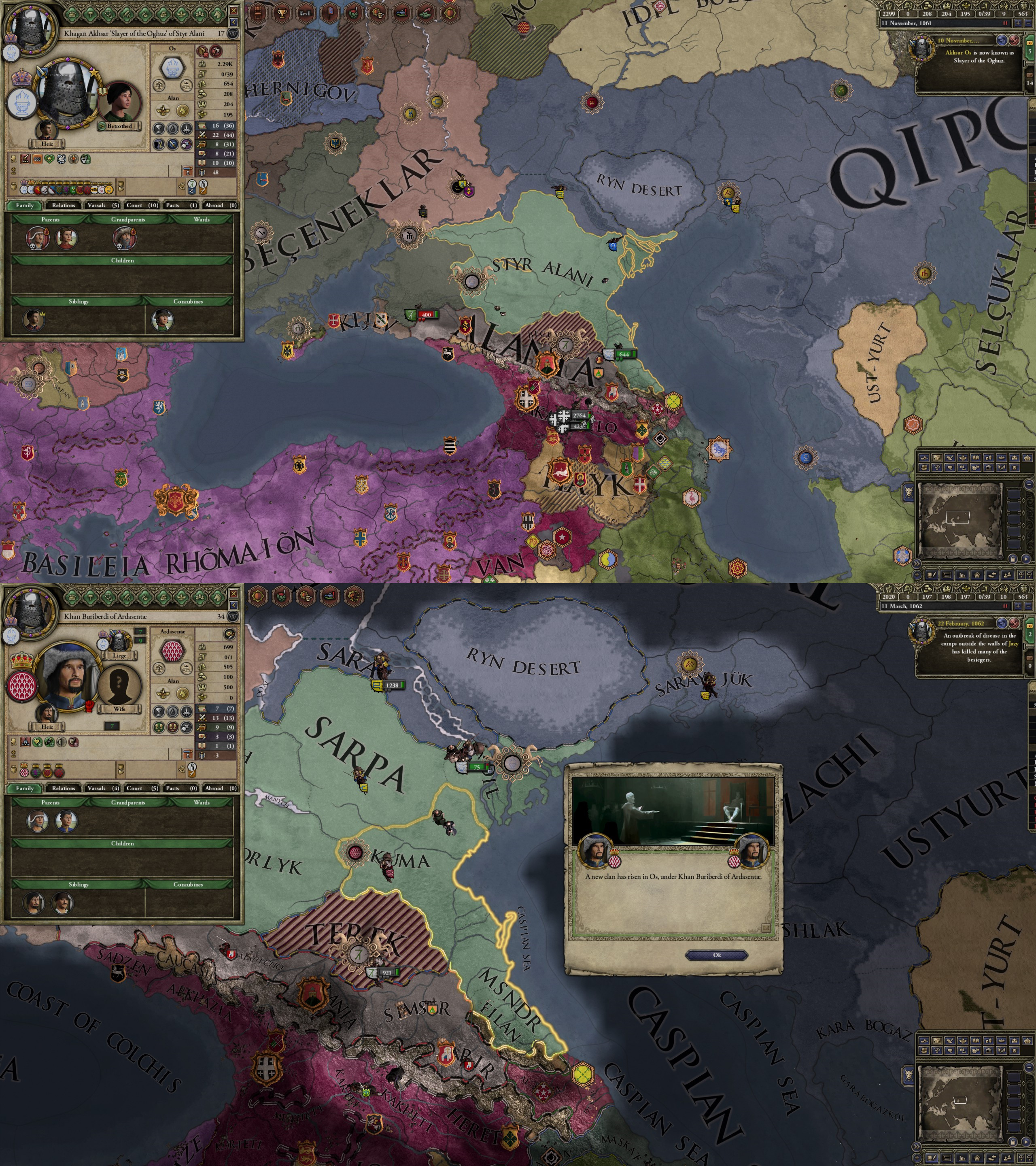 However, not long after, news reaches the capital that, not even a week later, his mistress Altun had given birth to a son by him. The boy, Ælbeg, is acknowledged as his own, much to the outrage of the barely-postpartum Queen.