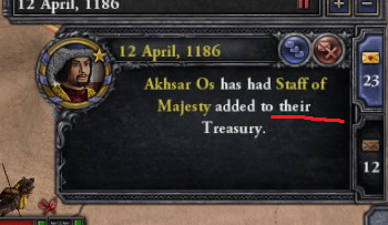 I couldn't be sure, because I haven't played vanilla ck2 in so long, but I do believe that's in the base game. Every other notification message is pretty straightforward as "x did y", or "x did y to z"; I think having an artifact added to the treasury is one of the few times a notification refers to the same subject twice in the same sentence, along with, for example, "x spent a favor on y to force them to join all of their factions". The similar theme to these notifications is they came in later DLCs.