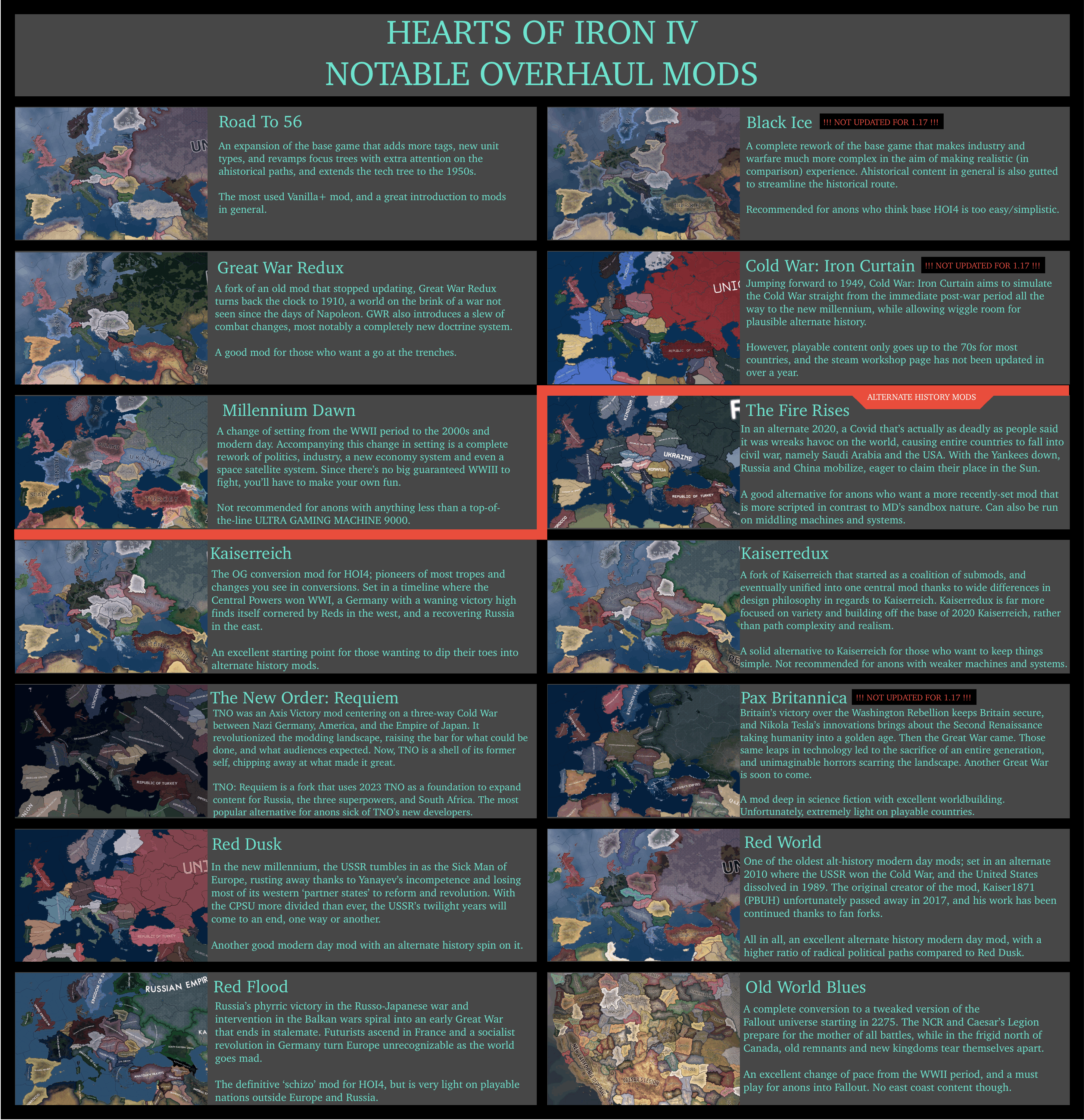 ———NOTABLE UTILITY MODS———>Player Led Peace ConferencesEffectively mandatory for all playthroughs where scripted peaces aren’t a factor. Puts (you) in total control of the peace proceedings so post-war Europe/Asia looks pretty.https://steamcommunity.com/sharedfiles/filedetails/?id=846066944>ToolpackGives the player a togglable menu to change party popularity, give buildings, transfer states and annex, etc. Great for getting yourself/an AI country out of trouble, or fixing bordergore.https://steamcommunity.com/sharedfiles/filedetails/?id=2913150560>Better AISwaps the stock AI package for one that is much more aggressive, and gives them in-game stat buffs. Best for people who think base HOI4 is too easy. Not compatible with mods that also change the AI/unit types.https://steamcommunity.com/sharedfiles/filedetails/?id=3369706283>Industrial ExpansionAdds 5 new building types to refine steel, aluminum, tungsten, chromium and coal. Adds a new infrastructure type of the same name as the mod, adding building slots the more IE is built.https://steamcommunity.com/sharedfiles/filedetails/?id=2707538501———NOTABLE OVERHAUL MODS———Pic related, too big for 2000 character limit