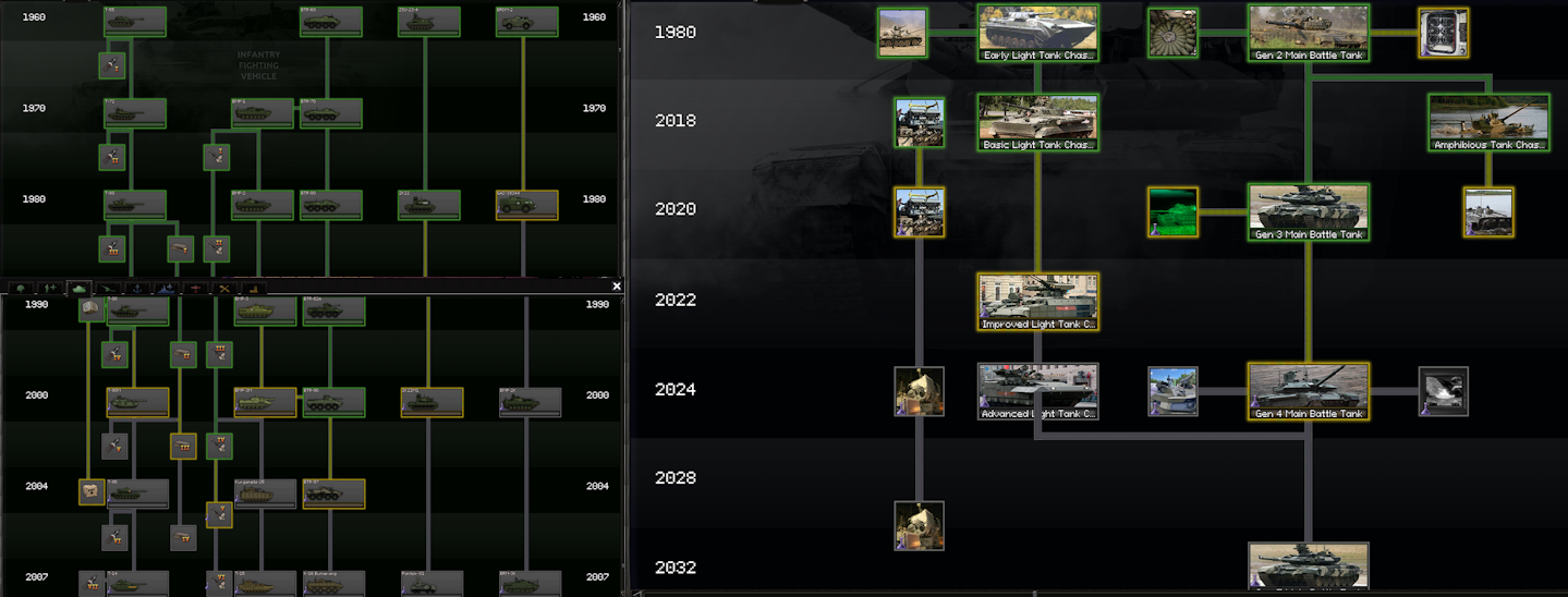 >>2368406I don't necessarily think the TFR tech trees are perfect but compared to Red Dusk's it's like comparing a Lexus to a Lada. There really is no valid reason for having seven different tanks producible when the setting is Russia from 2000-2010. It vastly overcomplicates things compared to TFR's "Gen" system. I do think TFR has an issue of some tech being there just to be there but that looks like it will be expanded upon with more futuristic content later in development when the early game is filled out more.